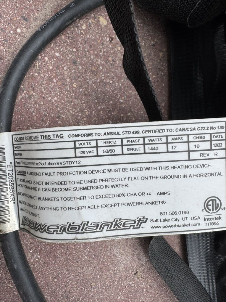 ApplePayPowerblanket th275 - insulated electric 275 gallon ibc tote heater, 120 volt, 1440 watt, 12.0 amp. Includes digital thermostatic controller for easy temperate regulation from 0f to +145f, removable top for easy access to fill spouts, adjustable straps, thermo probe. Never over or under heat product again. Ul/csa compliant. Fits 275 container with dimensions 48inl x 40inw x 46inh. Total length is 13 feet. only used for 1 season. 2 available Retail is $5,000 new asking $1500 each OBO