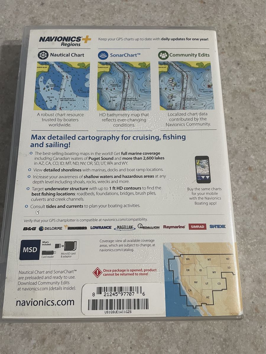 Navionics Western Region has more than 2,600 lakes in the western United States. Navionics will display Nautical Charts, Sonar Charts, and Community Edits. GPS plotter is compatible with Humminbird, Lowrance Magellan and many more. Also comes with SD card and Flash Drive. Free updates online.