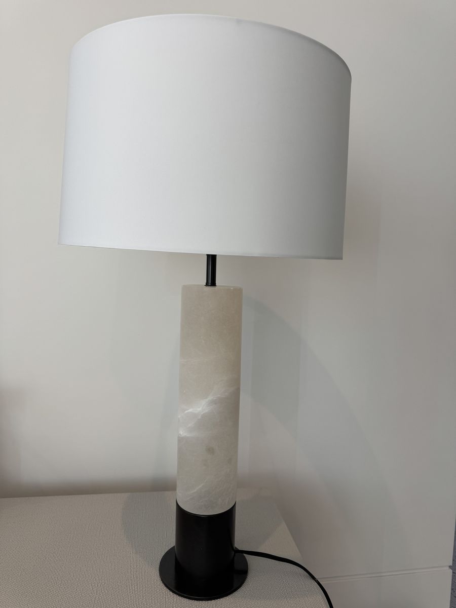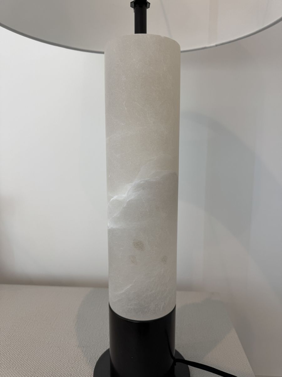 This is a high-end designer piece featuring a solid alabaster column with a bronze base paired with a large linen drum shade. The look is clean, timeless, and works perfectly in modern, mountain, or transitional spaces.