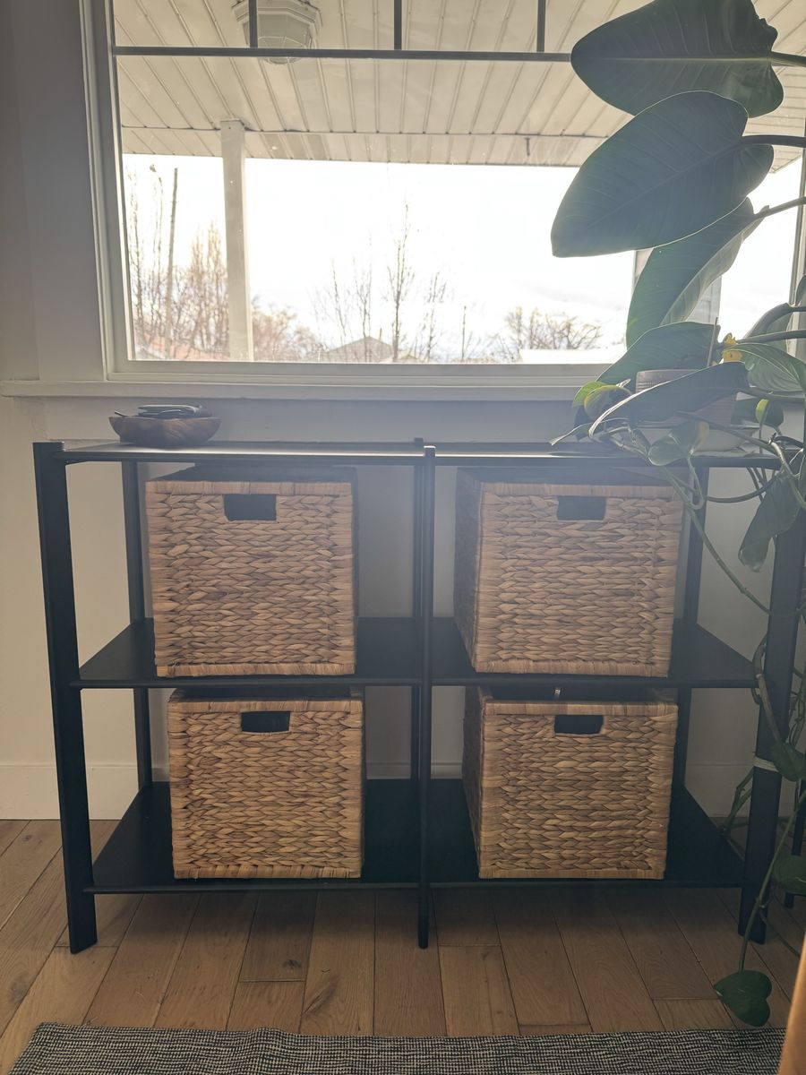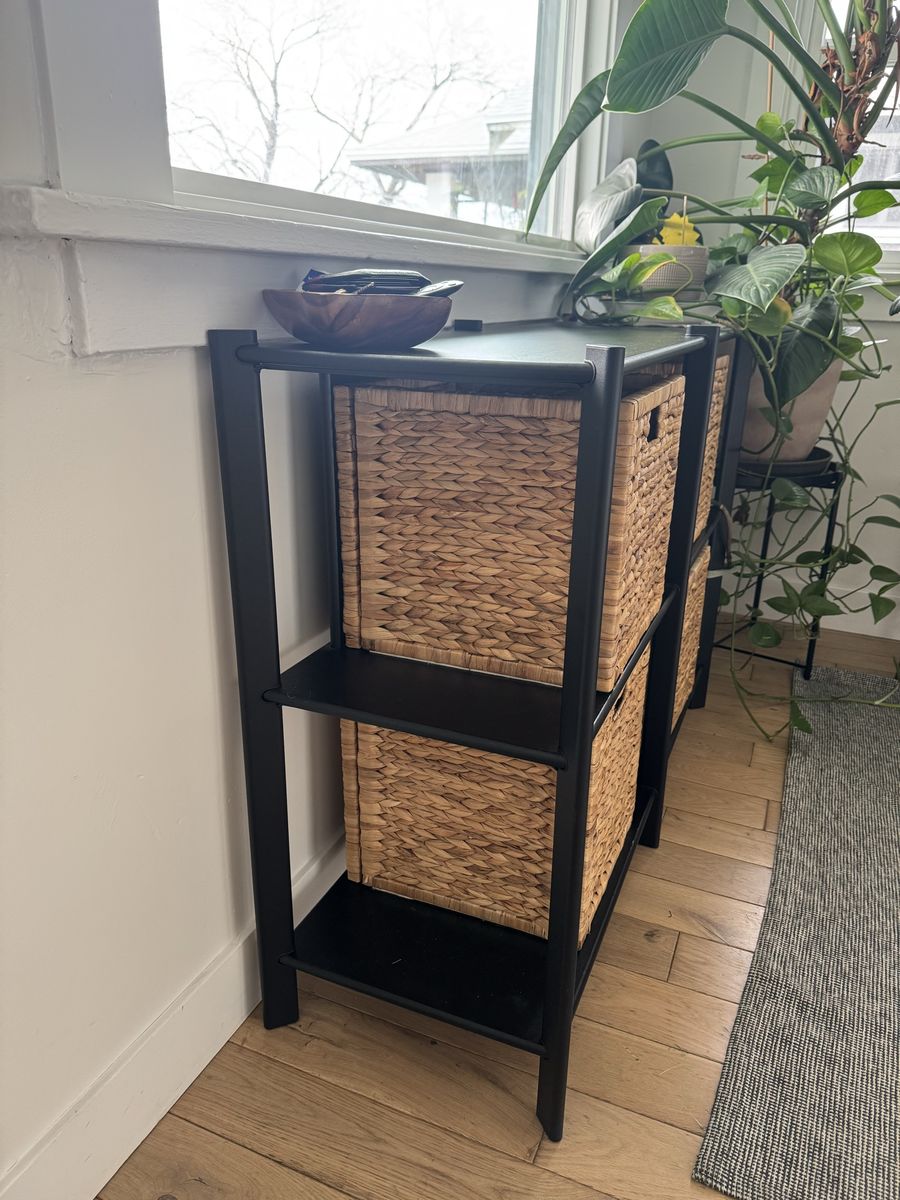 VenmoBlack console table with wicker baskets for storage. Looks really good and the baskets make for the perfect touch while storing stuff and it not being seen. In good condition. Table was $219 brand new and baskets were $29 each. Selling all together for $140 or best offer!
