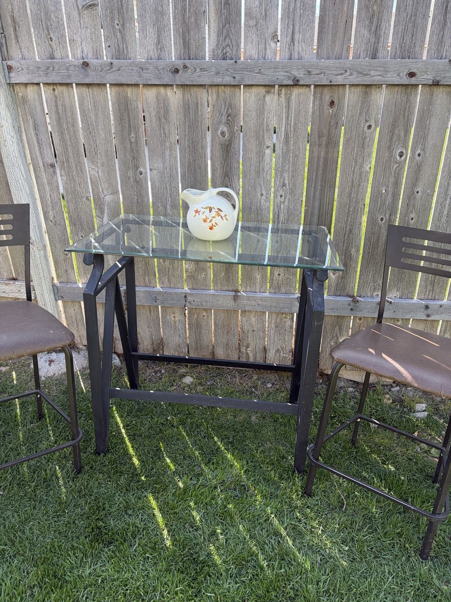 Nice glass top table, metal body. 3ft tall 2ft wide 3 ft tall. Perfect for indoor cozy gatherings. Or outdoor dining area. It’s a great deal for $50. Located in Tremonton.