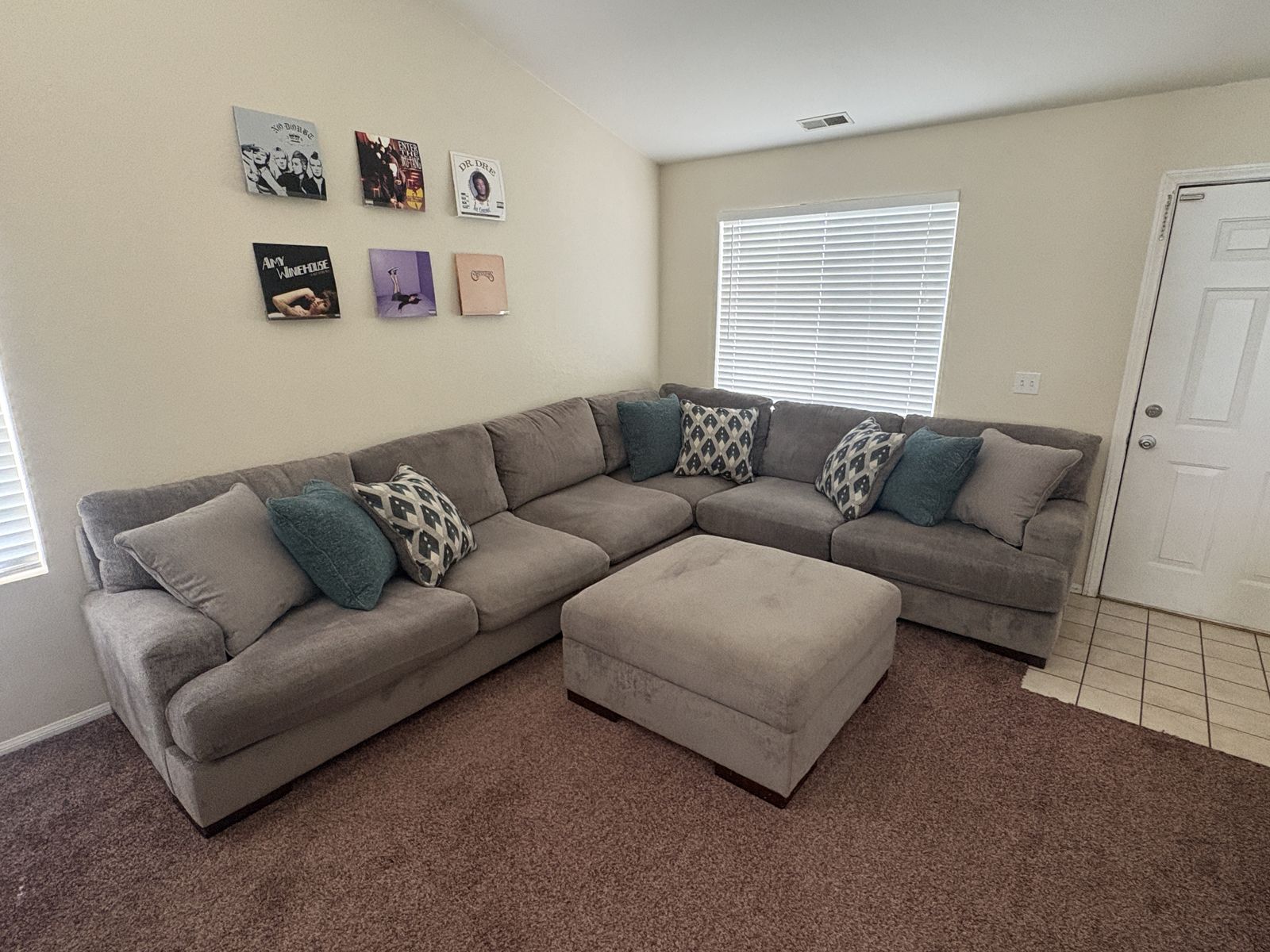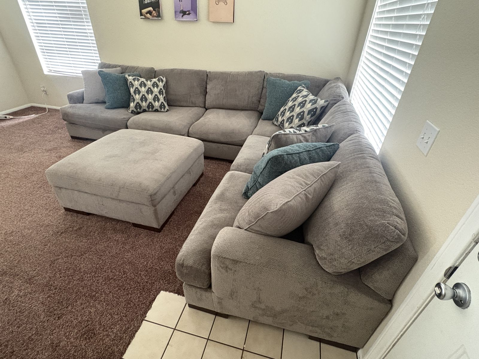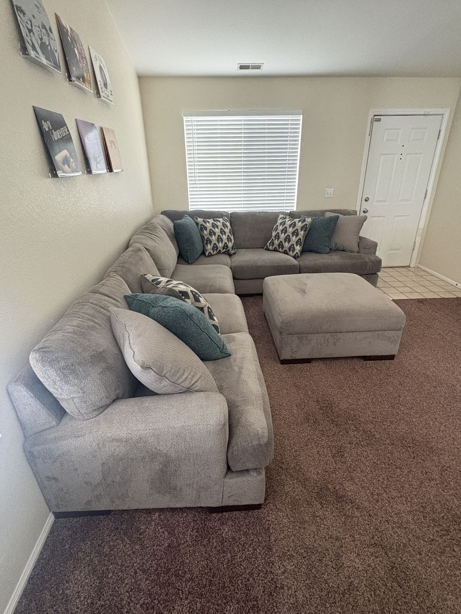 Selling a spacious and comfortable sectional couch with matching oversized ottoman. This set has been well taken care of and is in really good condition with normal light wear from use.