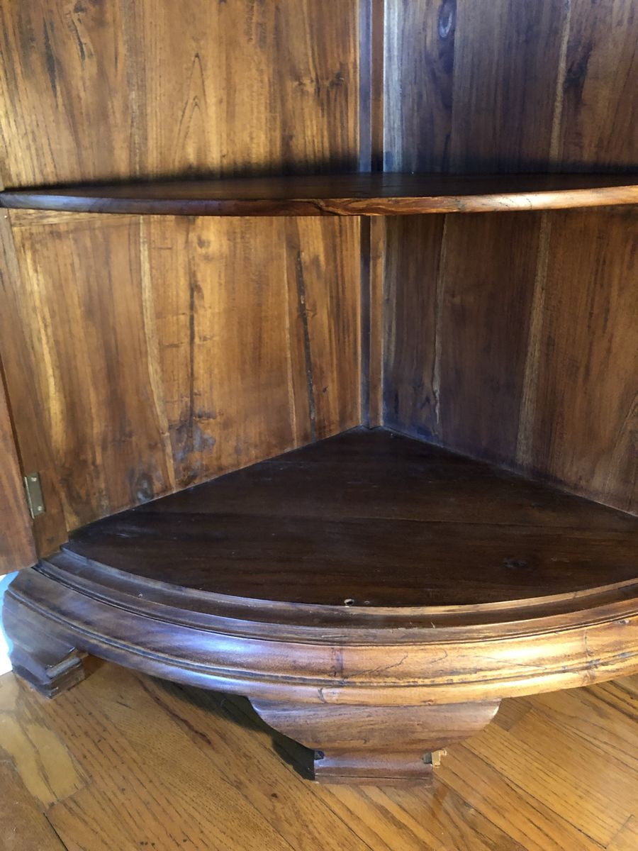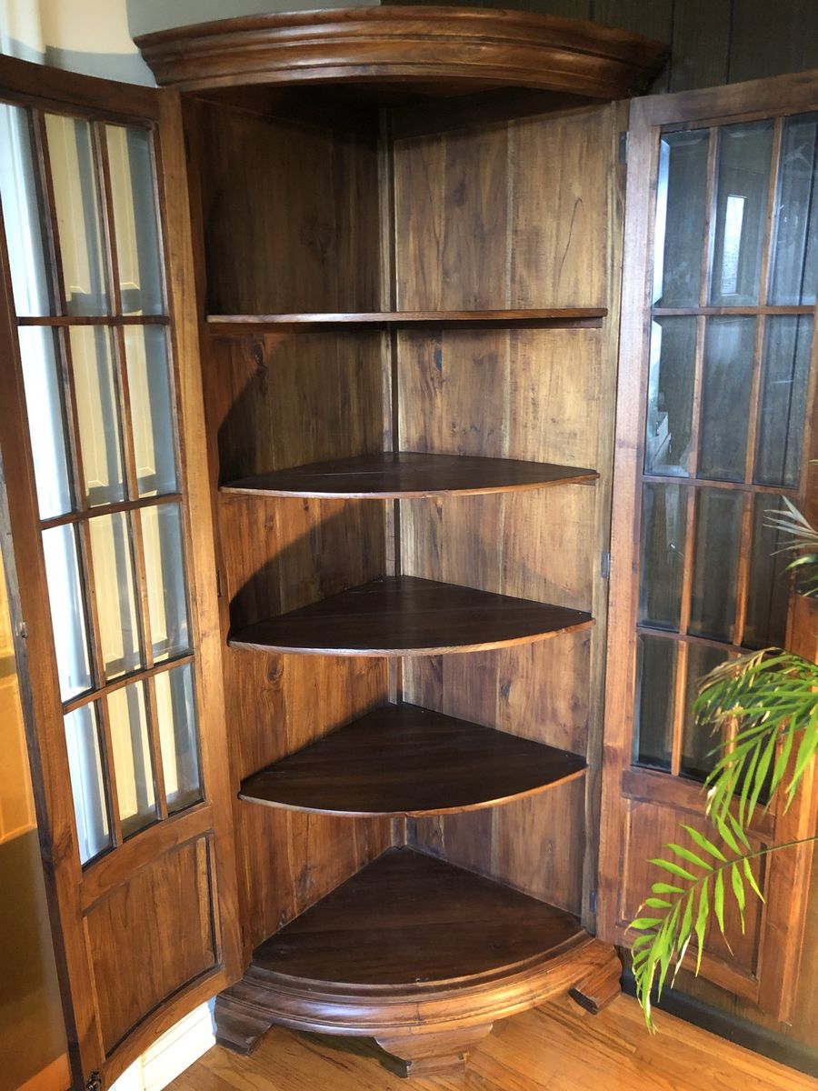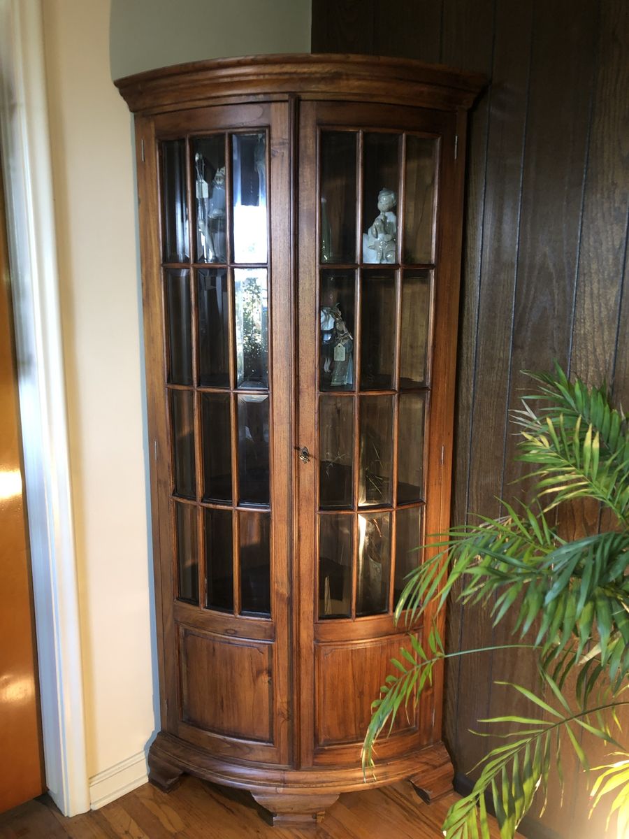 CashAppThis tall, elegant, handmade corner cabinet brings upscale style into your living space whether your home is a large house or a modest apartment. Due to its beautiful wood & glass construction, the exquisite attention to detail, & its corner design, this lovely piece does not feel heavy or overwhelm your space. The wood is stained a rich reddish brown w/the front composed of two wonderfully rounded doors of beveled glass panes, as well as a keyed lock; creating a light airy aesthetic while perfectly displaying your unique treasures. Whether you use it as a china cabinet or for curios or both, you can't go wrong. It would also make a great display case for a shop, if you should have one! Measures: 75 1/2” tall approx: 32” across x 21 1/2” deep. It truly is beautiful & a steal at this price. Cash, Venmo or CashApp