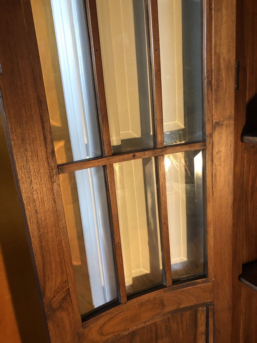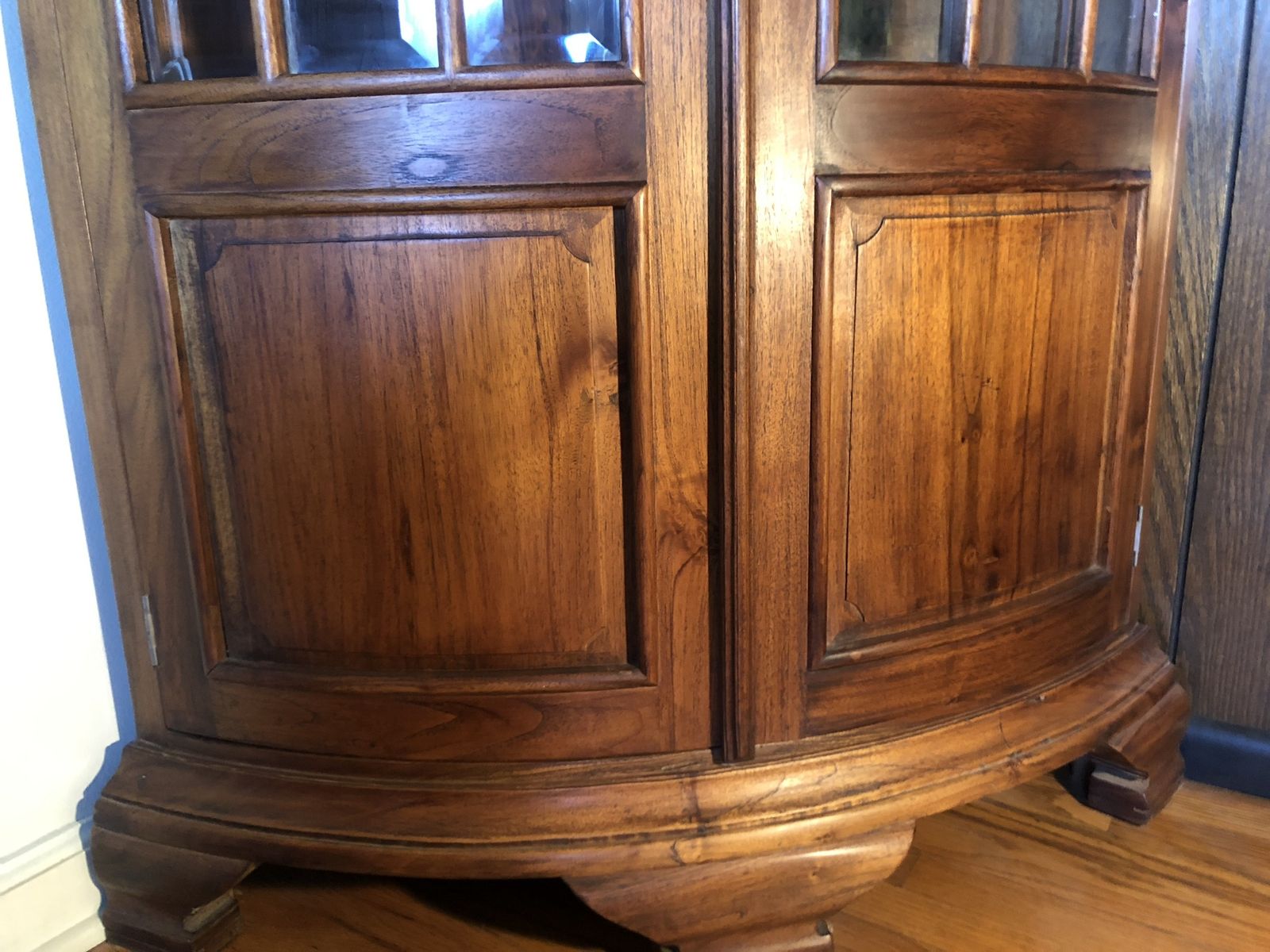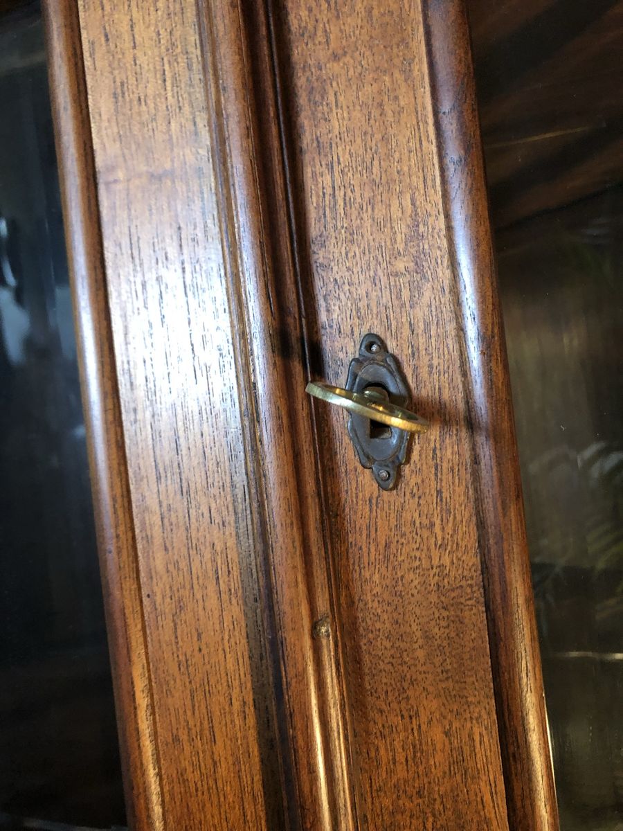 CashAppThis tall, elegant, handmade corner cabinet brings upscale style into your living space whether your home is a large house or a modest apartment. Due to its beautiful wood & glass construction, the exquisite attention to detail, & its corner design, this lovely piece does not feel heavy or overwhelm your space. The wood is stained a rich reddish brown w/the front composed of two wonderfully rounded doors of beveled glass panes, as well as a keyed lock; creating a light airy aesthetic while perfectly displaying your unique treasures. Whether you use it as a china cabinet or for curios or both, you can't go wrong. It would also make a great display case for a shop, if you should have one! Measures: 75 1/2” tall approx: 32” across x 21 1/2” deep. It truly is beautiful & a steal at this price. Cash, Venmo or CashApp