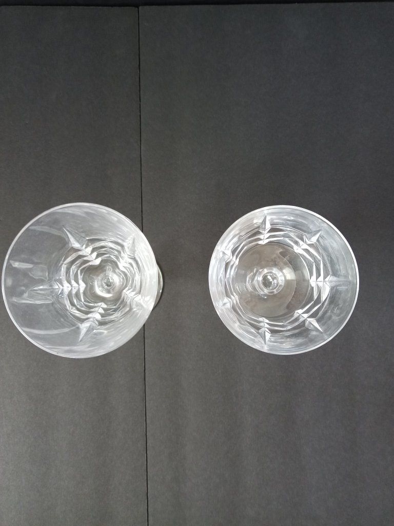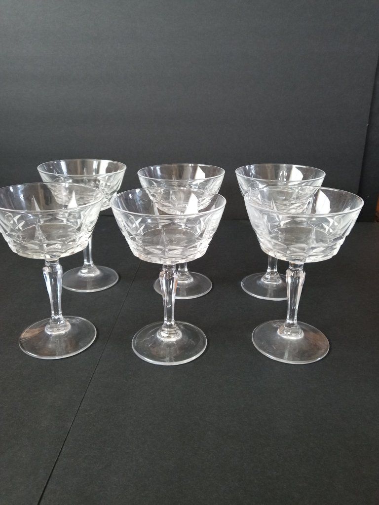 6 sorbet glasses for serving champagne, cocktails or dessert measure 5.75" high and 4" across top of rim. 11 wine glasses/water goblets stand 7.25 inches high and 3.25" across top of rim.