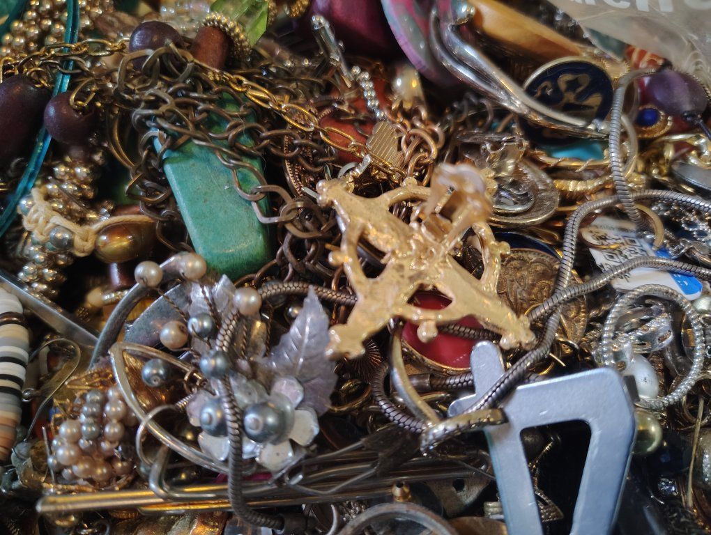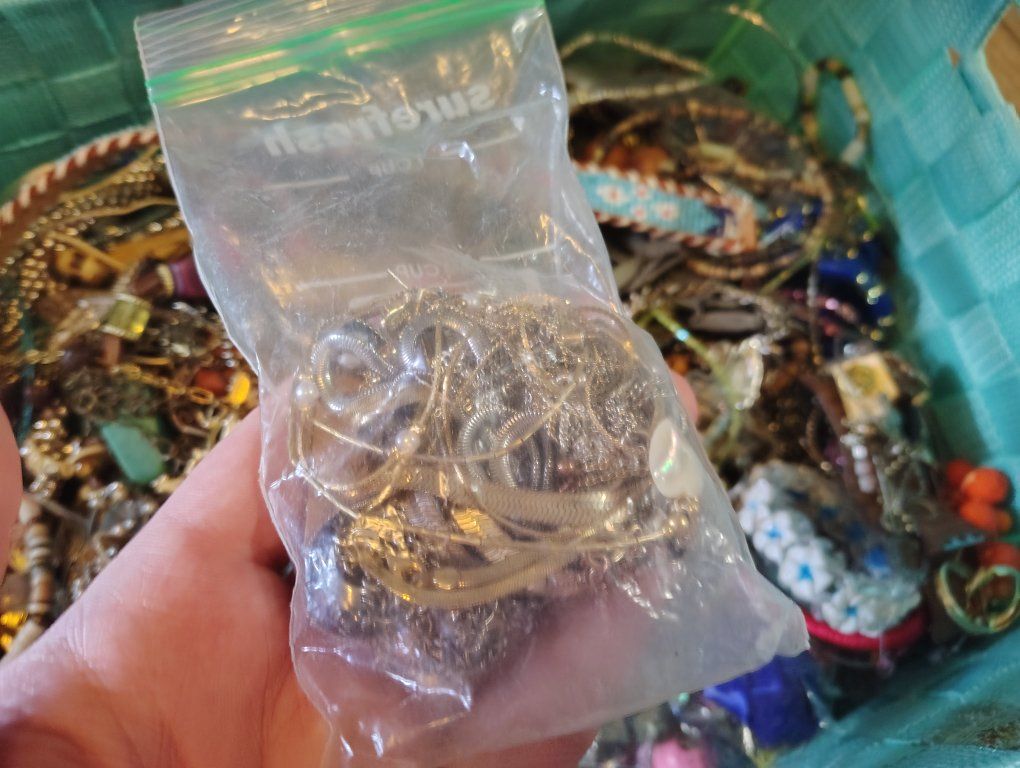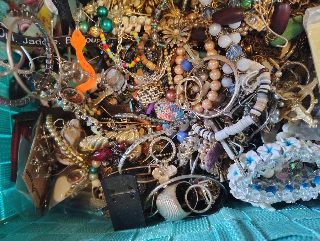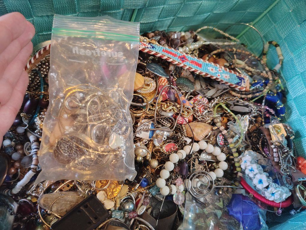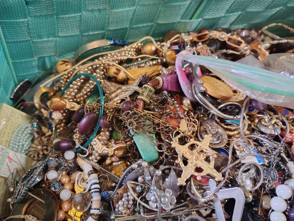 from a passed relatives storage unit. it's a lot of jewelry and I can never use this much. doing spring cleaning and want it gone. on a bathroom scale it was 21.7 lbs probably 20 pounds flat the basket is light and is included (you can't exactly take this home all loose lol)