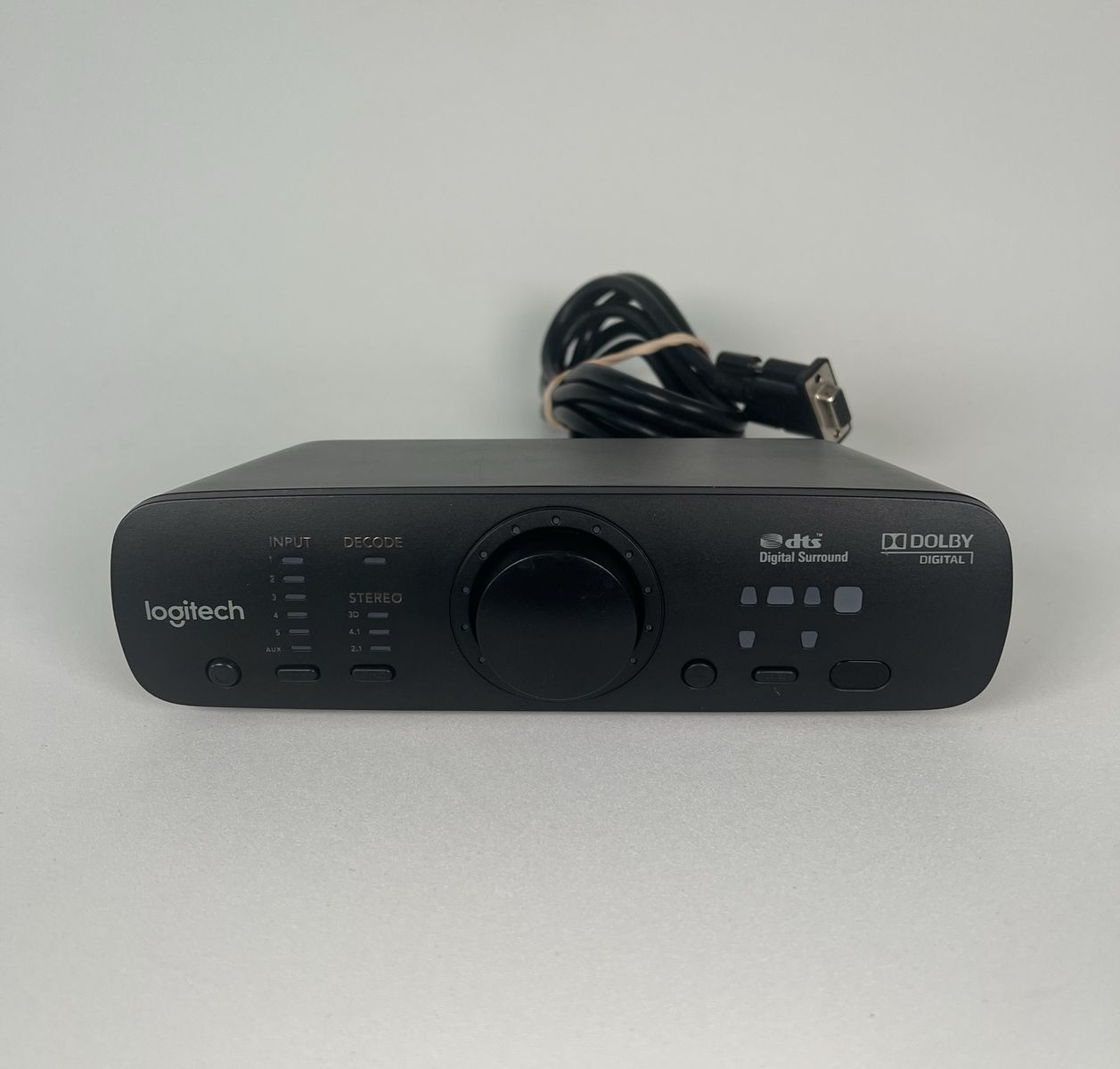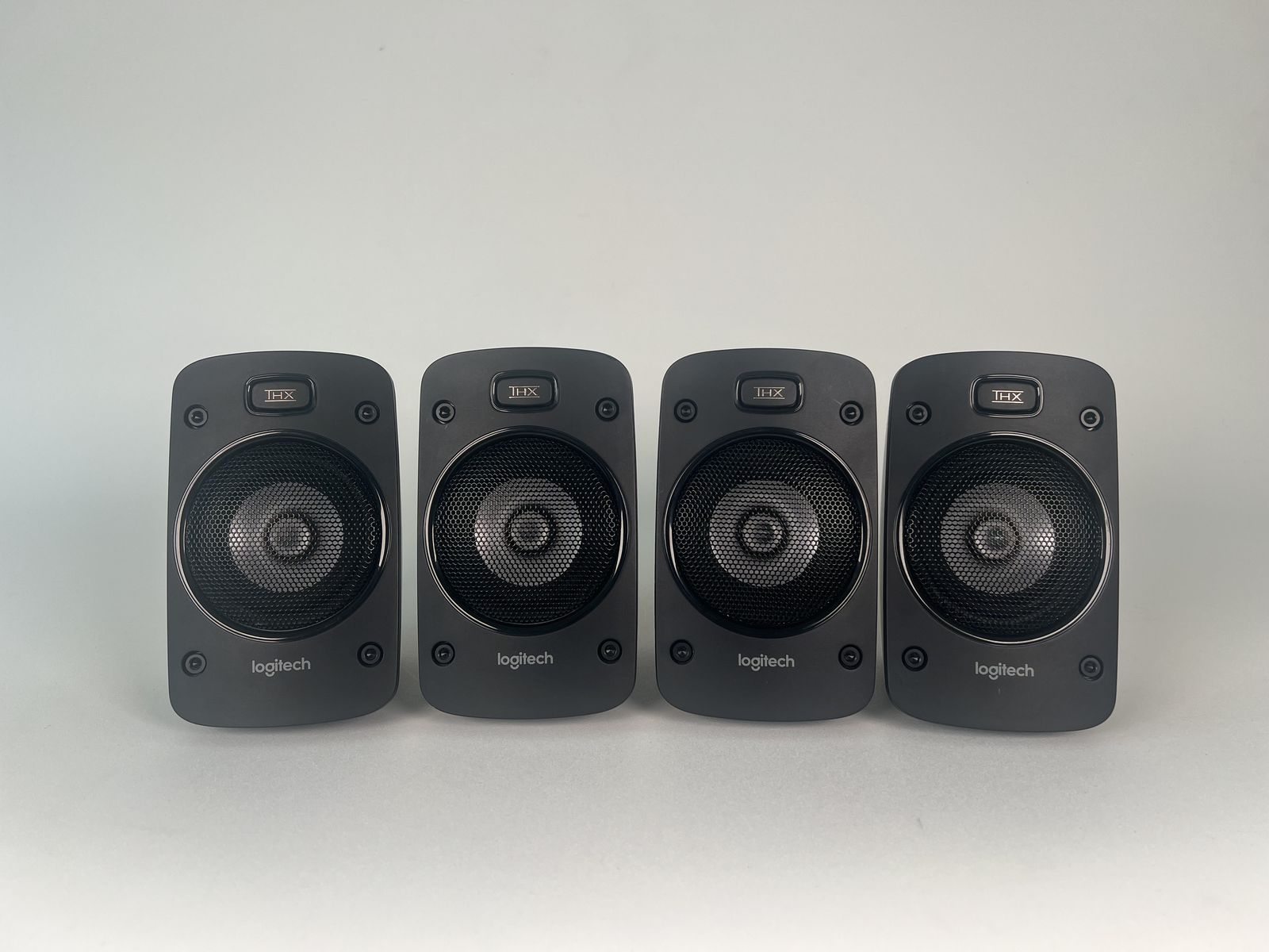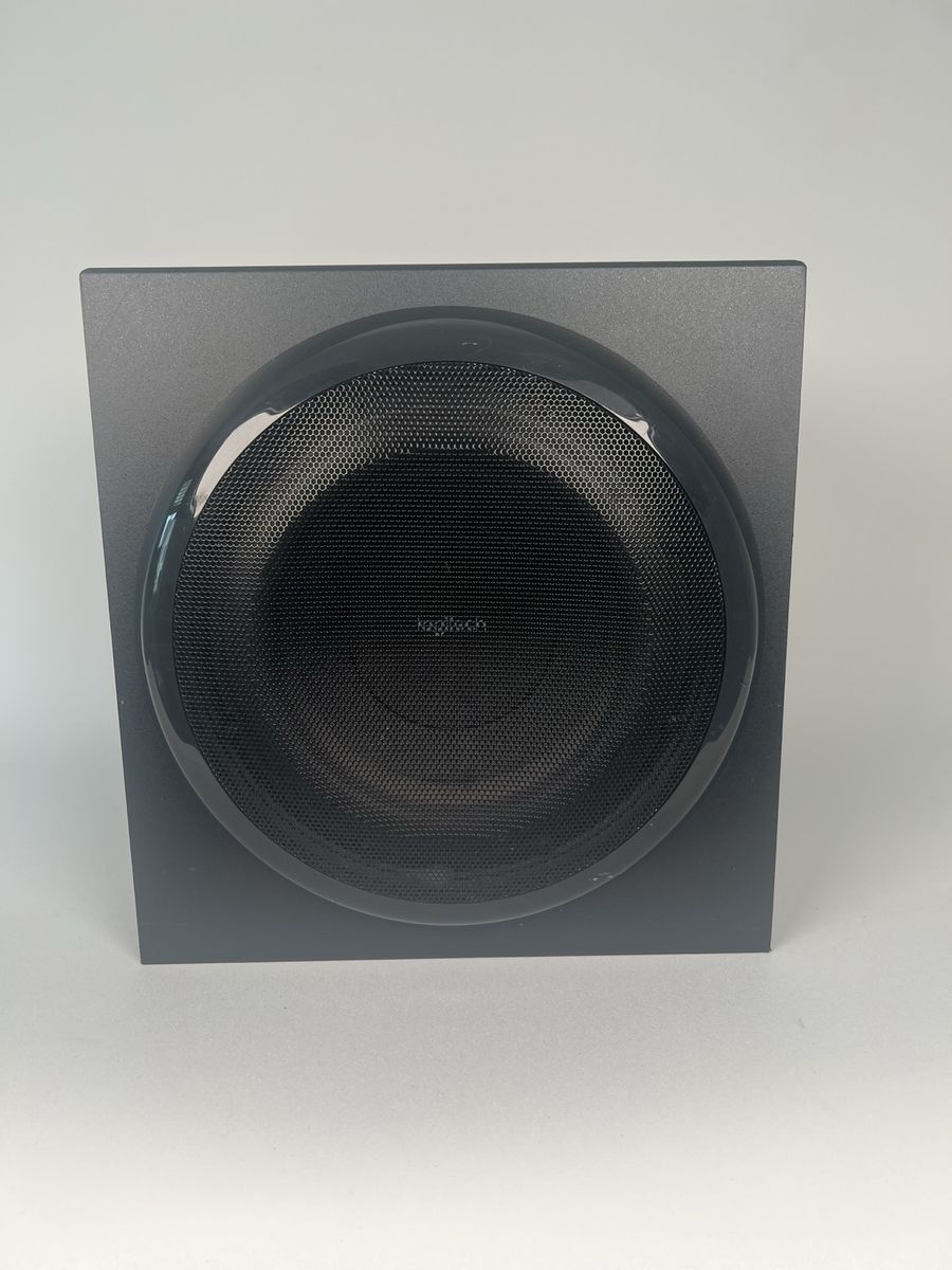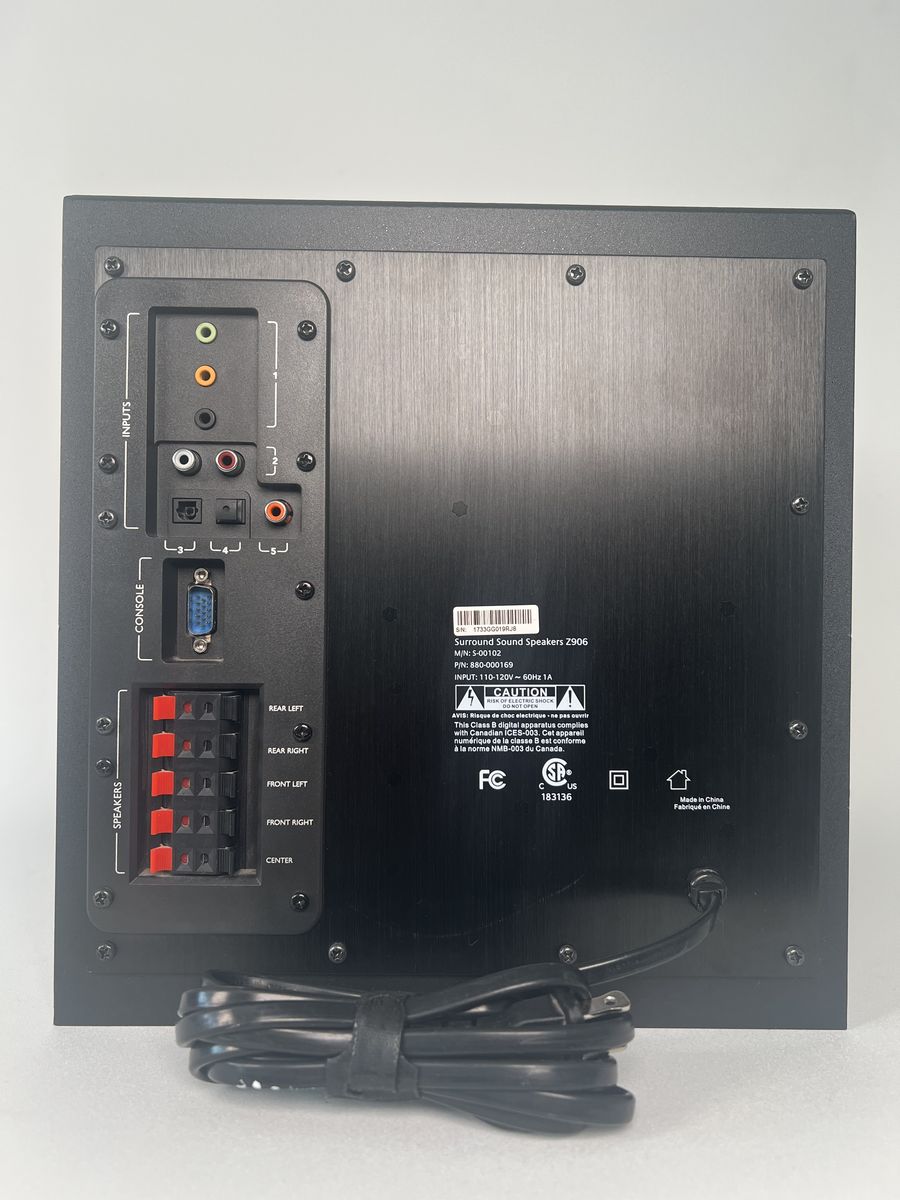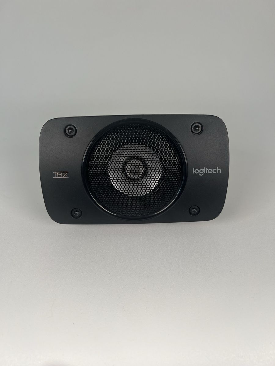 Logitech Z906 THX-certified 5.1 surround sound system in good condition. Includes the subwoofer, four satellite speakers, one center channel speaker, and the control console. No remote or connecting cables are included