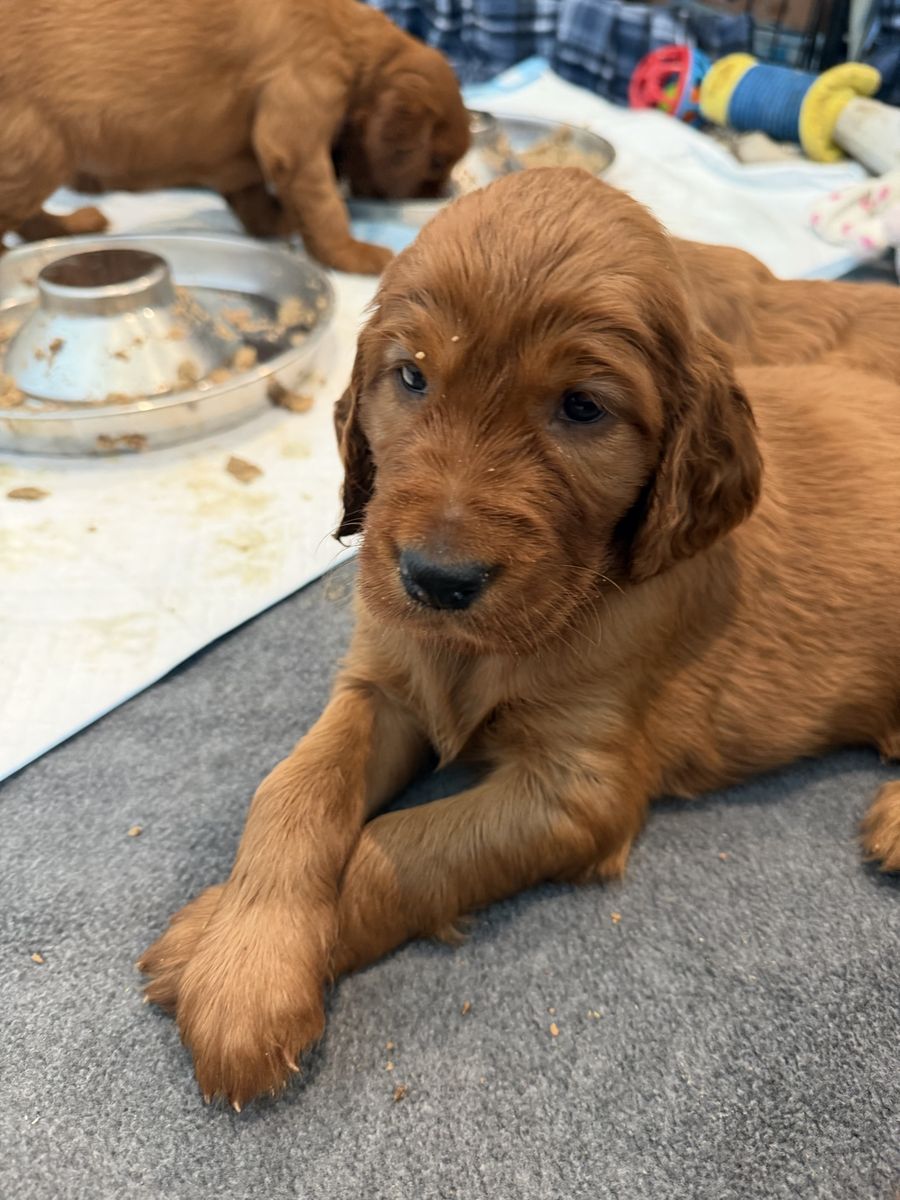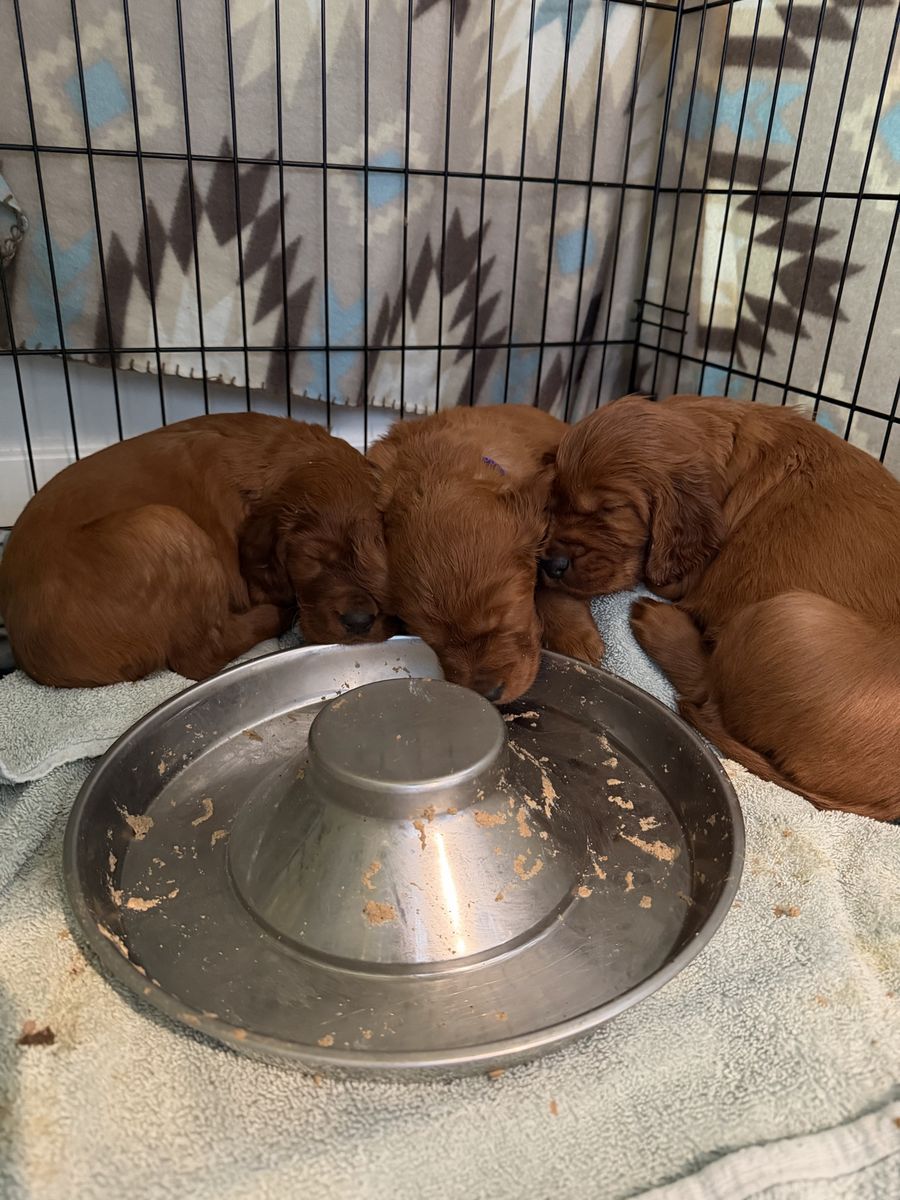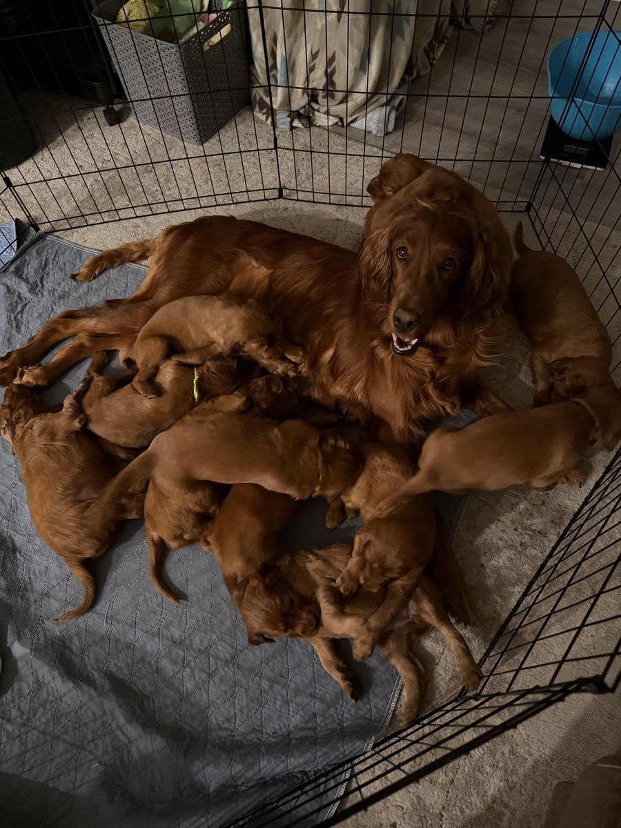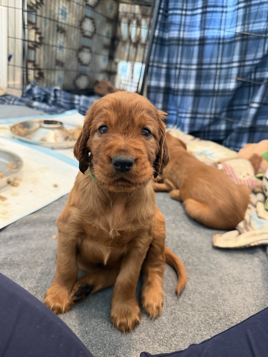 PayPalOur last litter of Irish setter puppies are here and almost 5 weeks old! They were born March 8. Irish setters are the purest souls and want to just be with their people and make them happy. Definitely a dream dog. We have one female left due to a previous buyer no longer able to buy her. They’re ready to go home the week of May 4th!