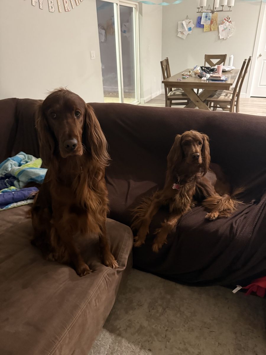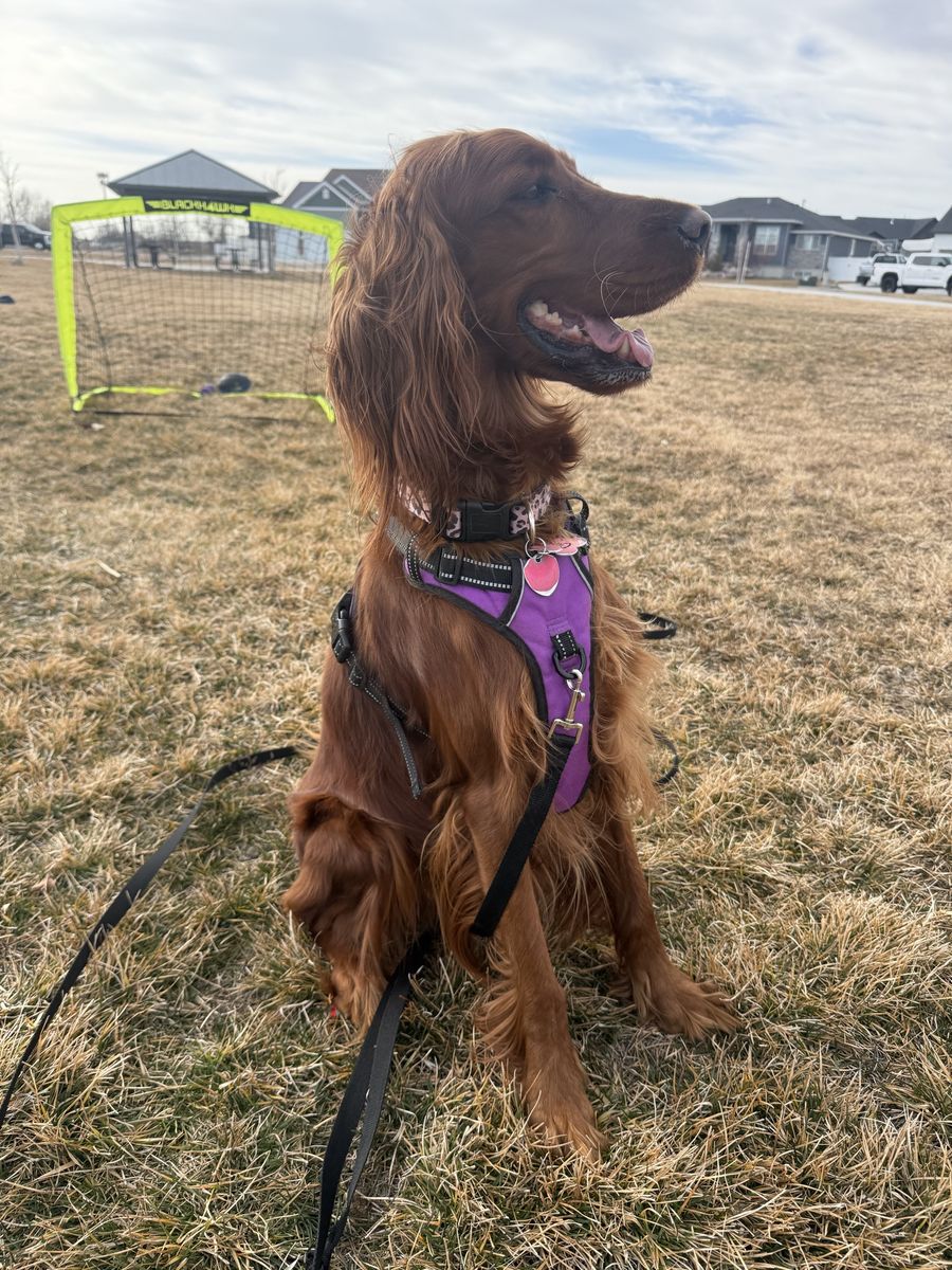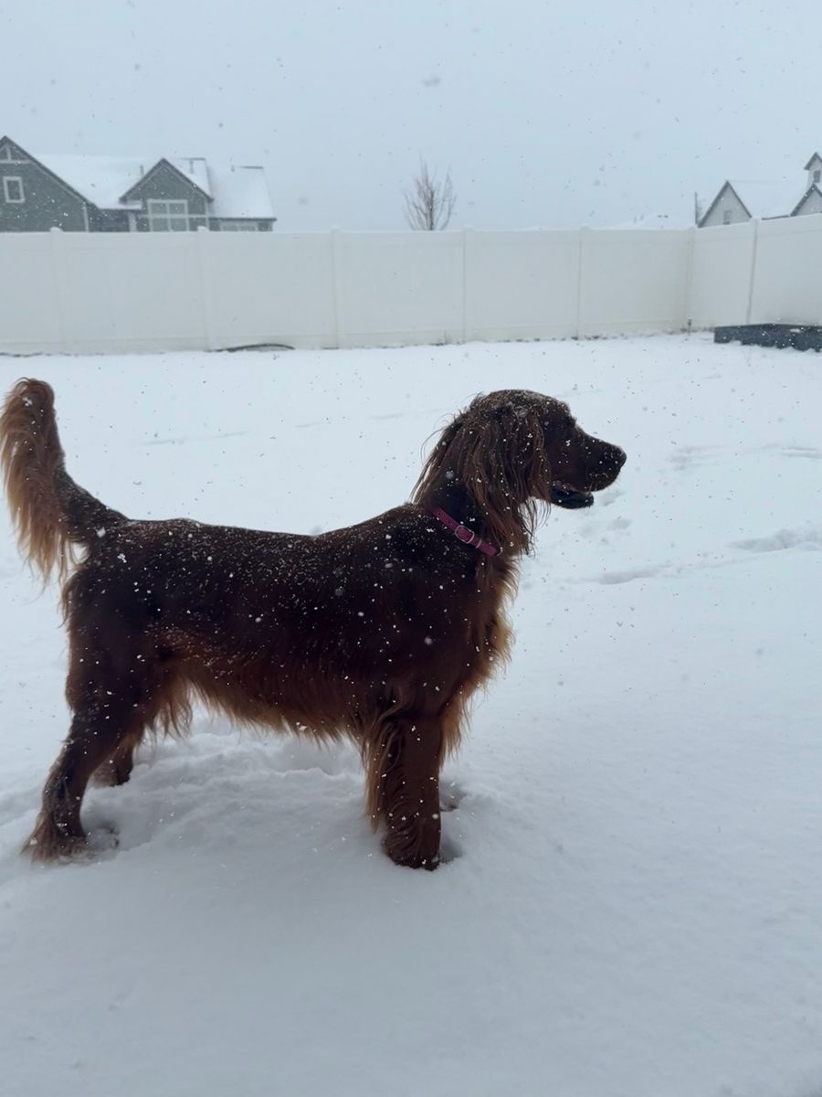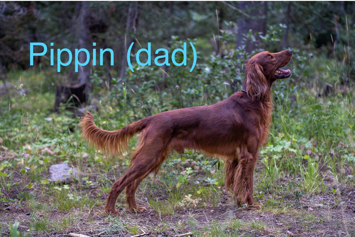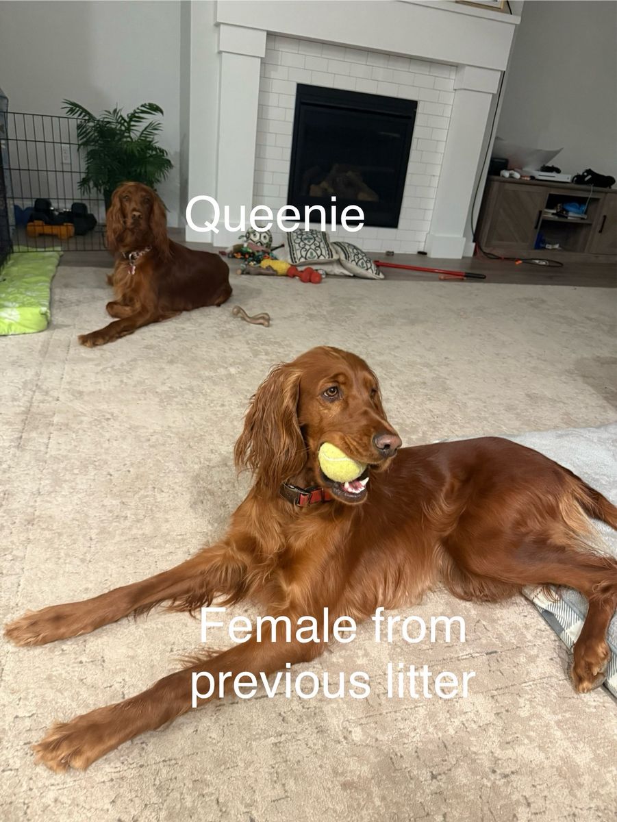 **Irish Setters need daily exercise, mental stimulation, and lots of human interaction. They do not do well as “outside only” dogs, or being alone most the day. We raise healthy, well-socialized puppies and are excited to place them in loving, prepared homes. We own the mama, Queenie, who is the most loving doggy ever. She is very submissive and patient. She is about 53 lbs. Pippin is the stud dad and he is so handsome and the biggest snuggle baby! He just wants to be held, loved, and played with. He’s about 66 lbs. *THIS IS PIPPIN AND QUEENIE’S LAST LITTER