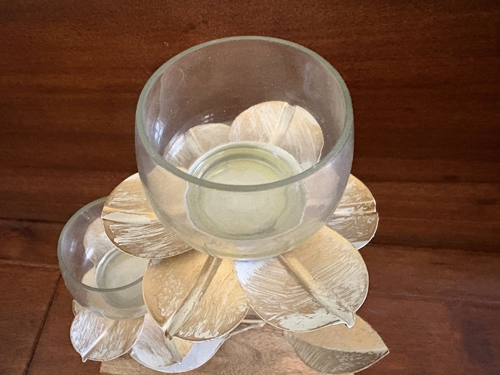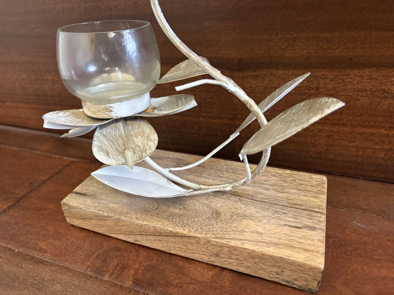 I have a beautiful metal flower tea light candle holder on a wood base. The metal is cream colored and gold. The wood base is 7 3/4 inches by 4 inches. It is 11 inches tall. See my other ads for jewelry, artwork, home decor and more.