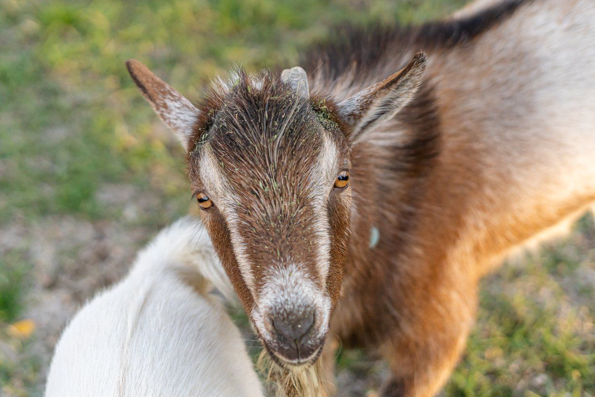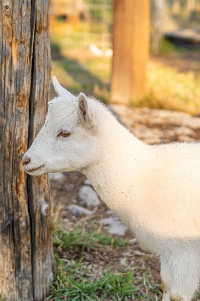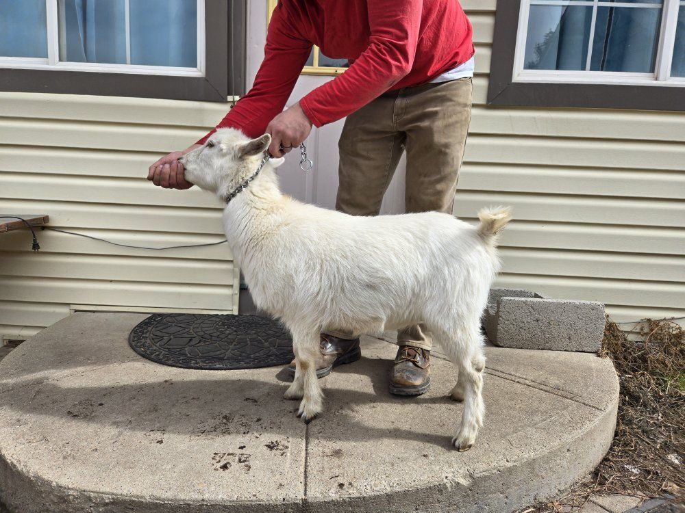 The red buckskin is a wether. The white goat is a doe dry yearling. Both are VERY friendly and easy to manage. Former bottle babies.