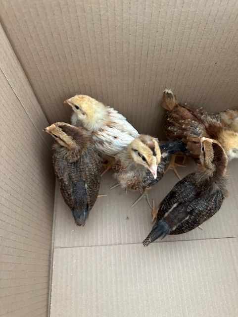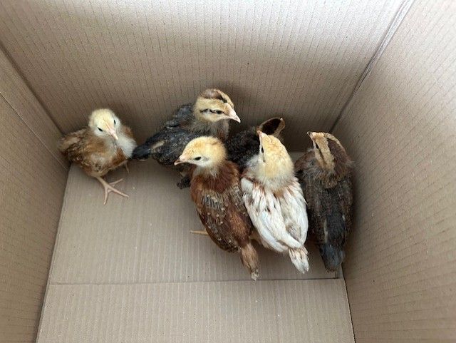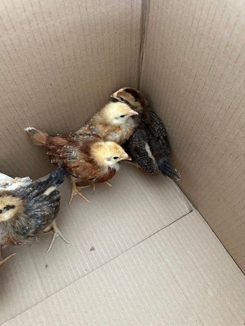 Chicks about 3 weeks old. 2 Rhode Island Red, 2 Americana (Easter Egger), 1 Golden Comet (they said it was like a Golden Sex Link), 1 Olive Egger. Bought at IFA. Just bought two different ages and decided I should't have. Nothing wrong with them. Just too old to be with new chicks.