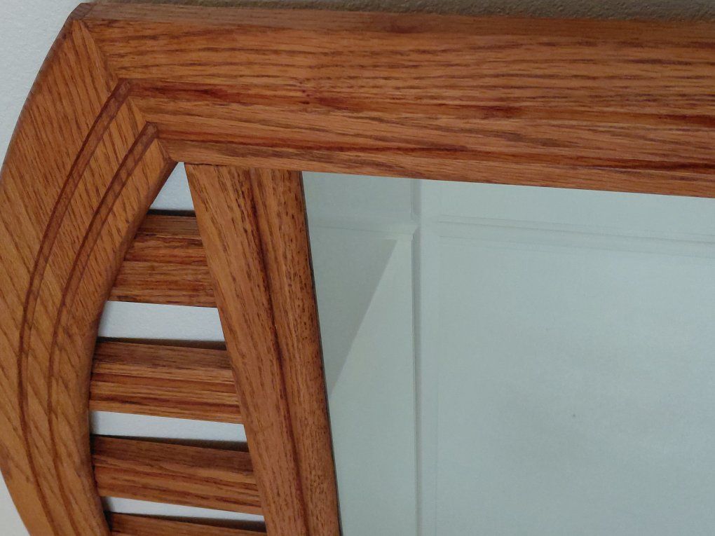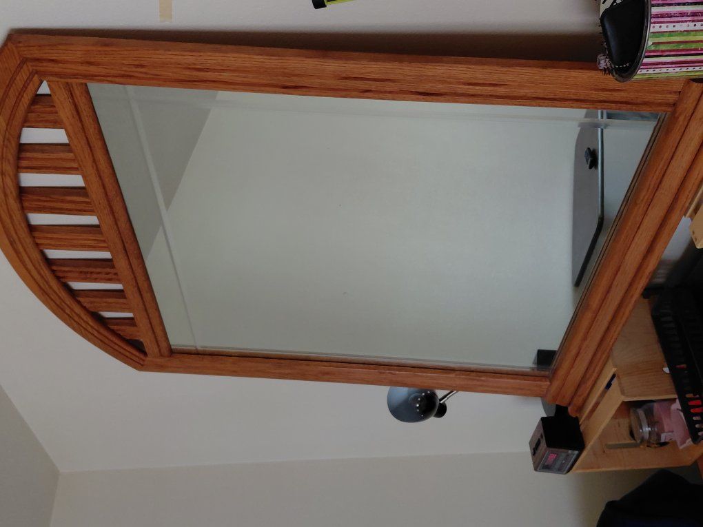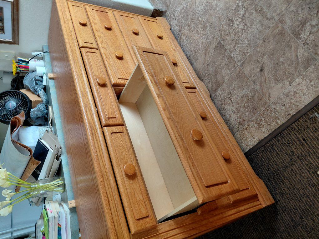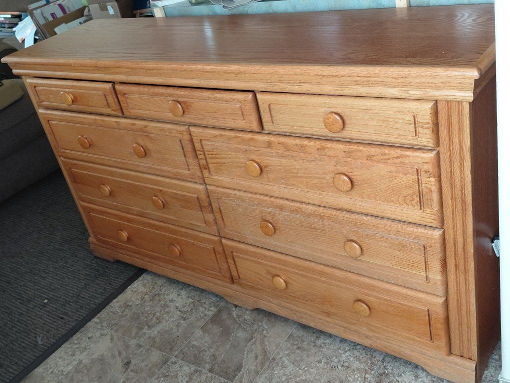 Heavy, solid wood, double wide dresser; 66"Wx17"Dx35 1/2"H. With 6 Large drawers, 27"x14"x4 1/2"; 3 small drawers, 15 1/2"x14"x2". Includes Attachable, Large, Beautifully Crafted, Beveled, Vanity Mirror, 50 1/2" tall x 40" wide.