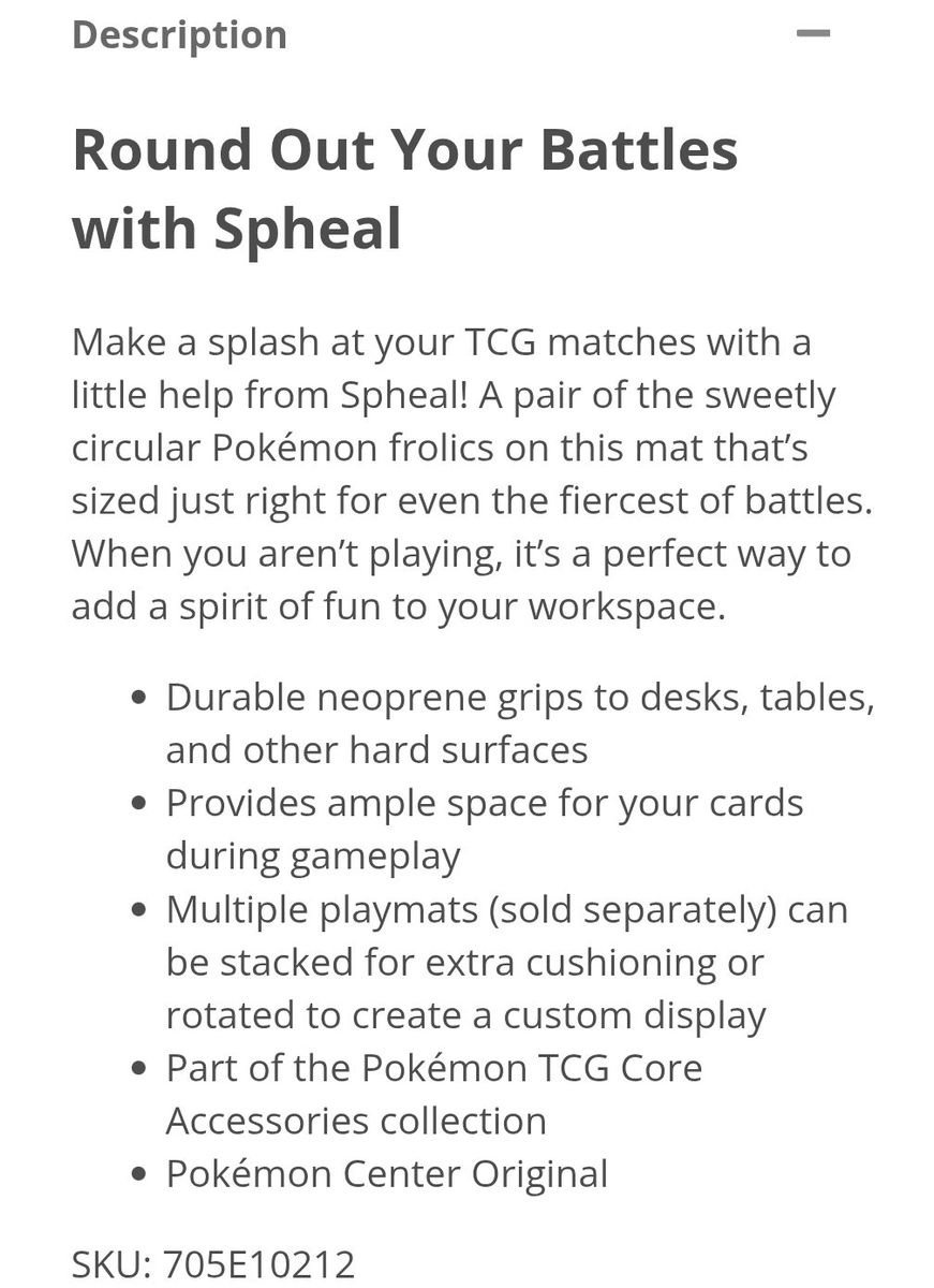 VenmoBrand New in the box Pokemon Center TCG Original Spheal Appeal Playmat or Computer Mat. Dimensions are 24in by 14in. Currently sold out and available on eBay for $40. Asking $30. Text if interested 801-903-8337