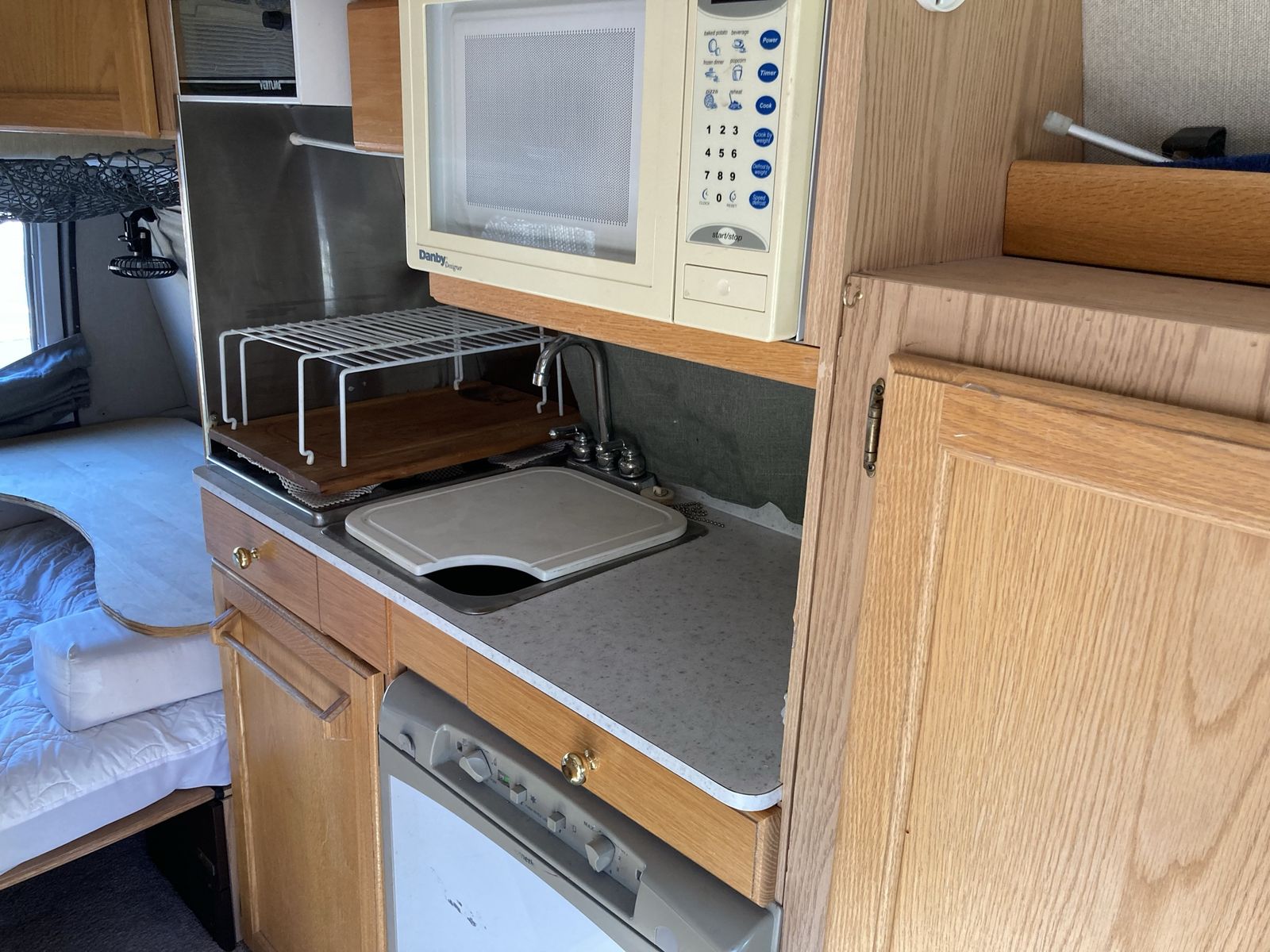 -Fully contained shower/Toilet. -2 way fridge, -3 burner stove, -TV, -wardrobe or extra seat, -coach furnace, -coach a/c, -on board generator, -queen bed/horseshoe dining, -reversible front bucket seats, -tri loft windows, -privacy curtains, -awning with attachable sunroom, -hitch mounted stow away, tons of storage,