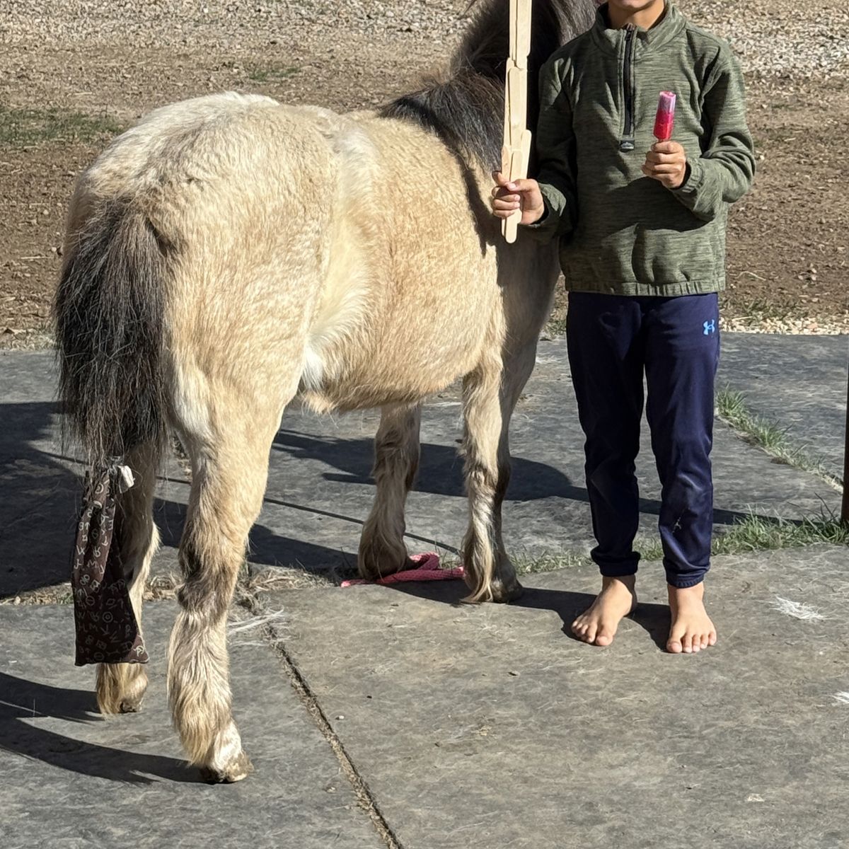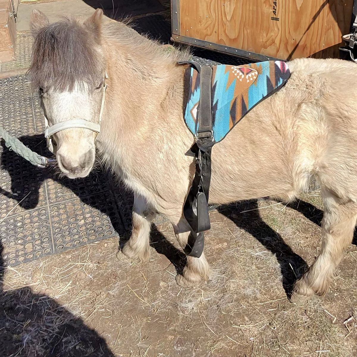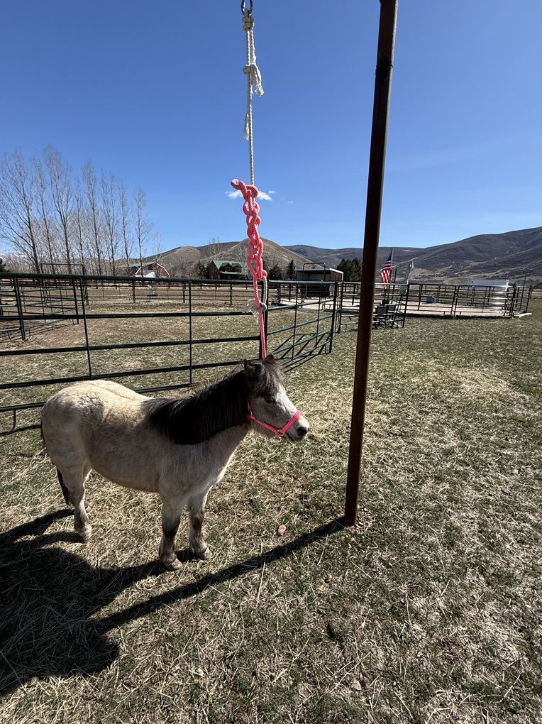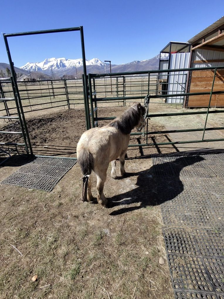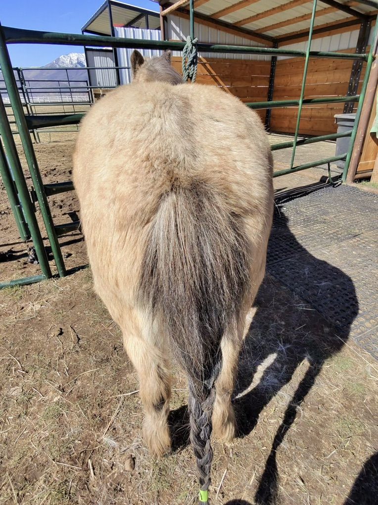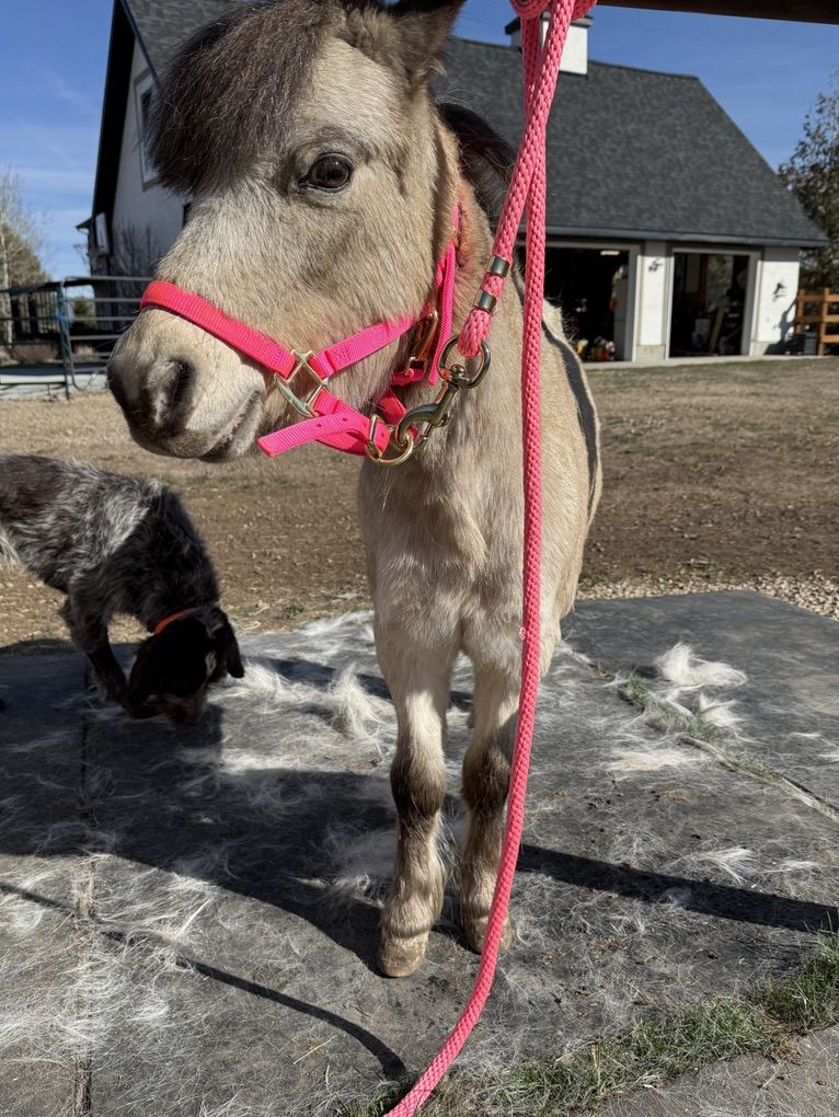 She comes with a blanket, halter and lead rope. Her name is Jewel and we think she’s between 8 and 10 years and she has come along really well and is gonna make a nice little mini horse just needs the time. She trailered fine up to our place. You can mess with her feet. You can clip her face. It’s really just that consistency to continue to show her she’ll be OK with whatever you’re introducing to her and once she can trust you, I think things will progress along well.