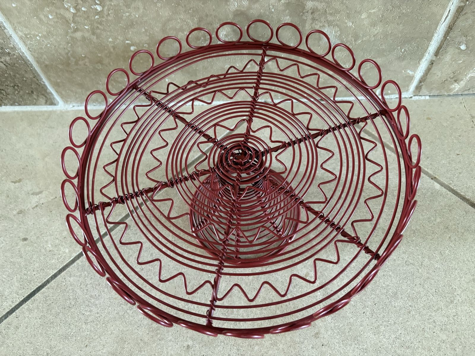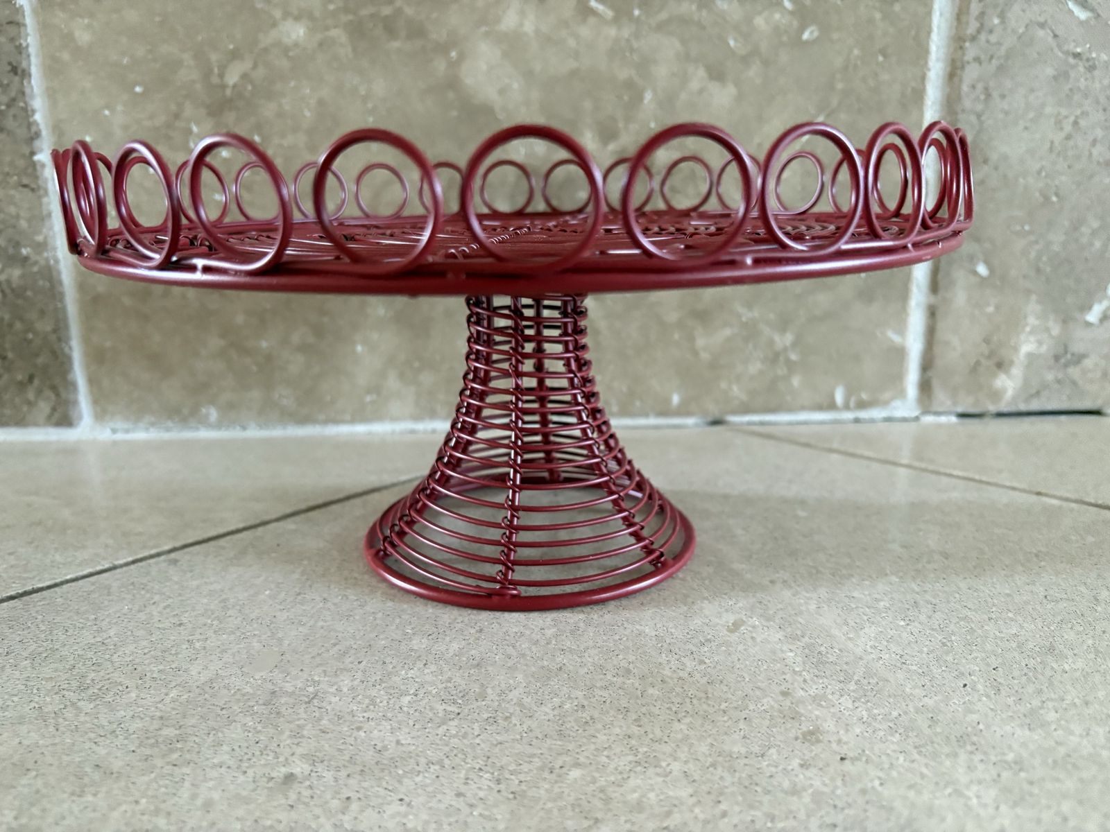 I have a Vinterfint red metal wire pedestal serving stand from IKEA. It is 10 inches across and 5 inches tall. See my other ads for jewelry, artwork, home decor and more.
