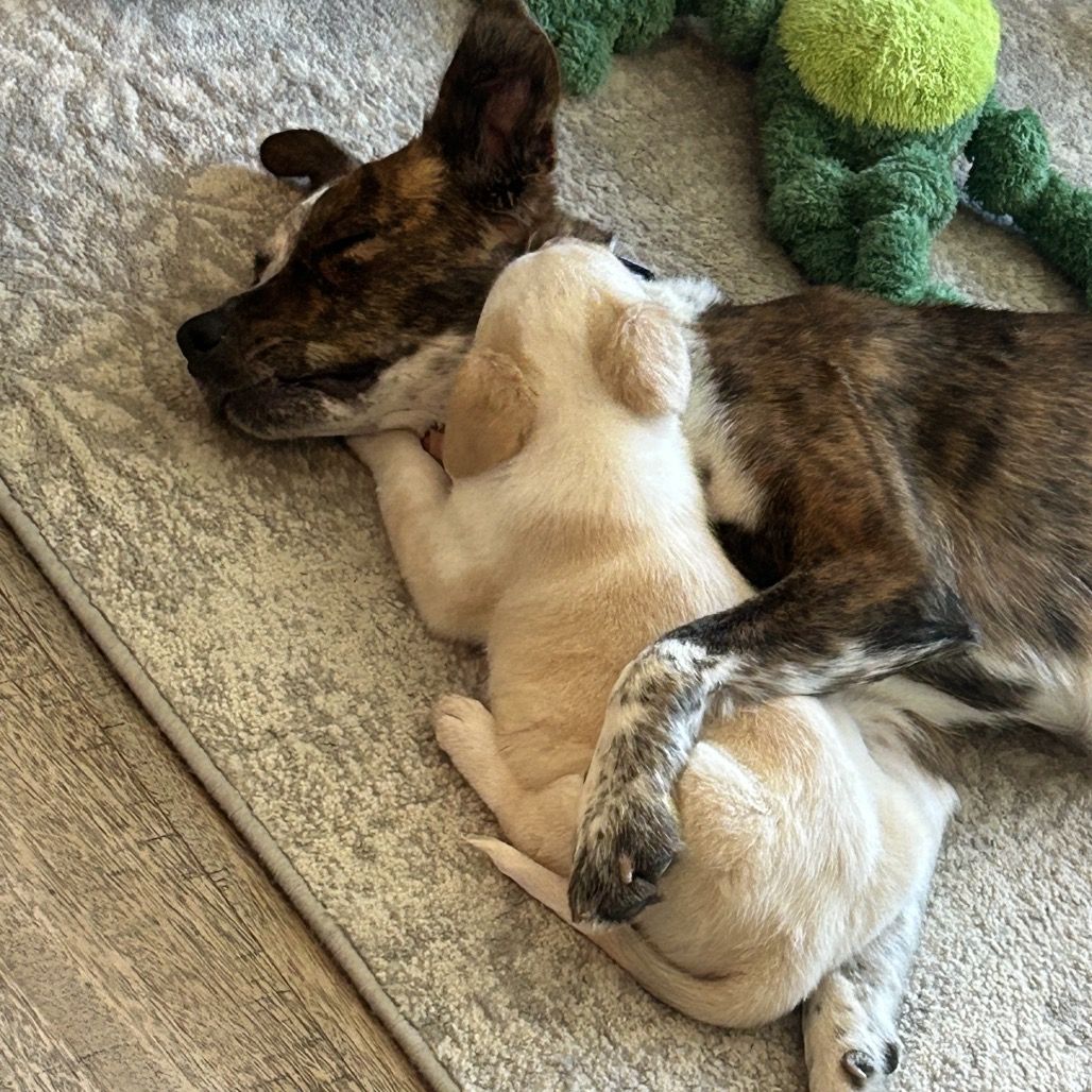 She may be a little more quiet than her brother, but she still loves to wrestle and play—especially with him—and is happiest when she’s snuggled up next to her mom.