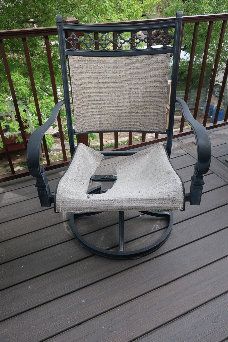 My husband says there are removable bolts that will allow you to replace the seat fabric.