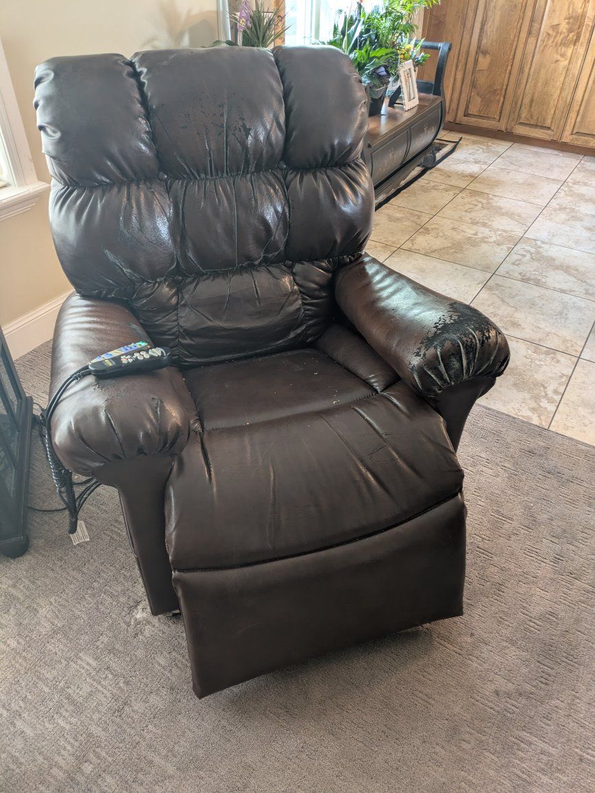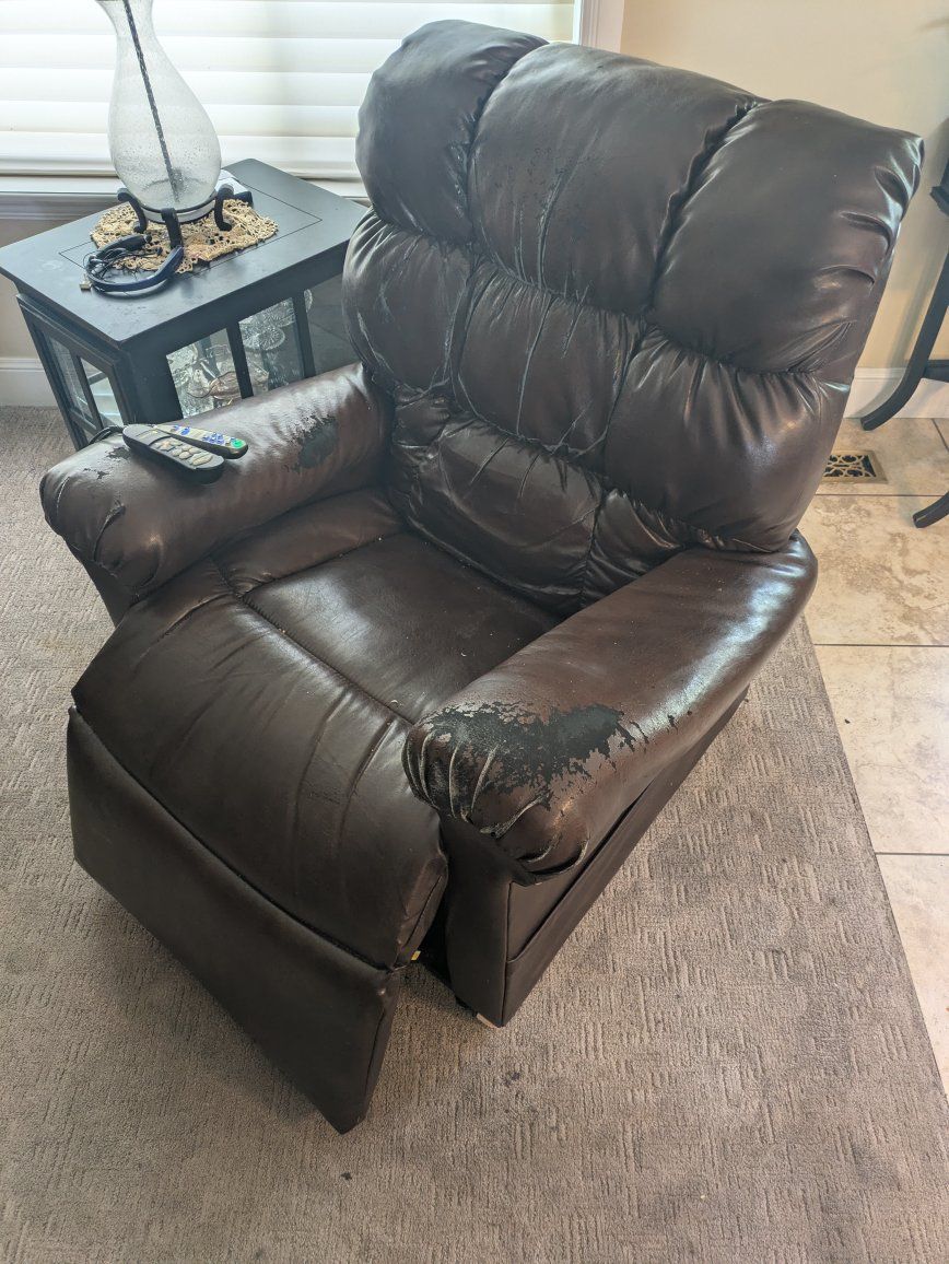 Leather recliner and massaging chair that lifts to help stand up as well. The leather is worn but all the electronics work well as expected.