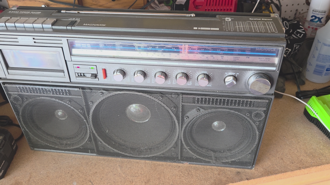 Venmothree speakers boombox take deck dies not work. as you heard radio plays nice sound loud. good garage radio i bot new in 1984 selling for 50.00 to help pay for a wedding