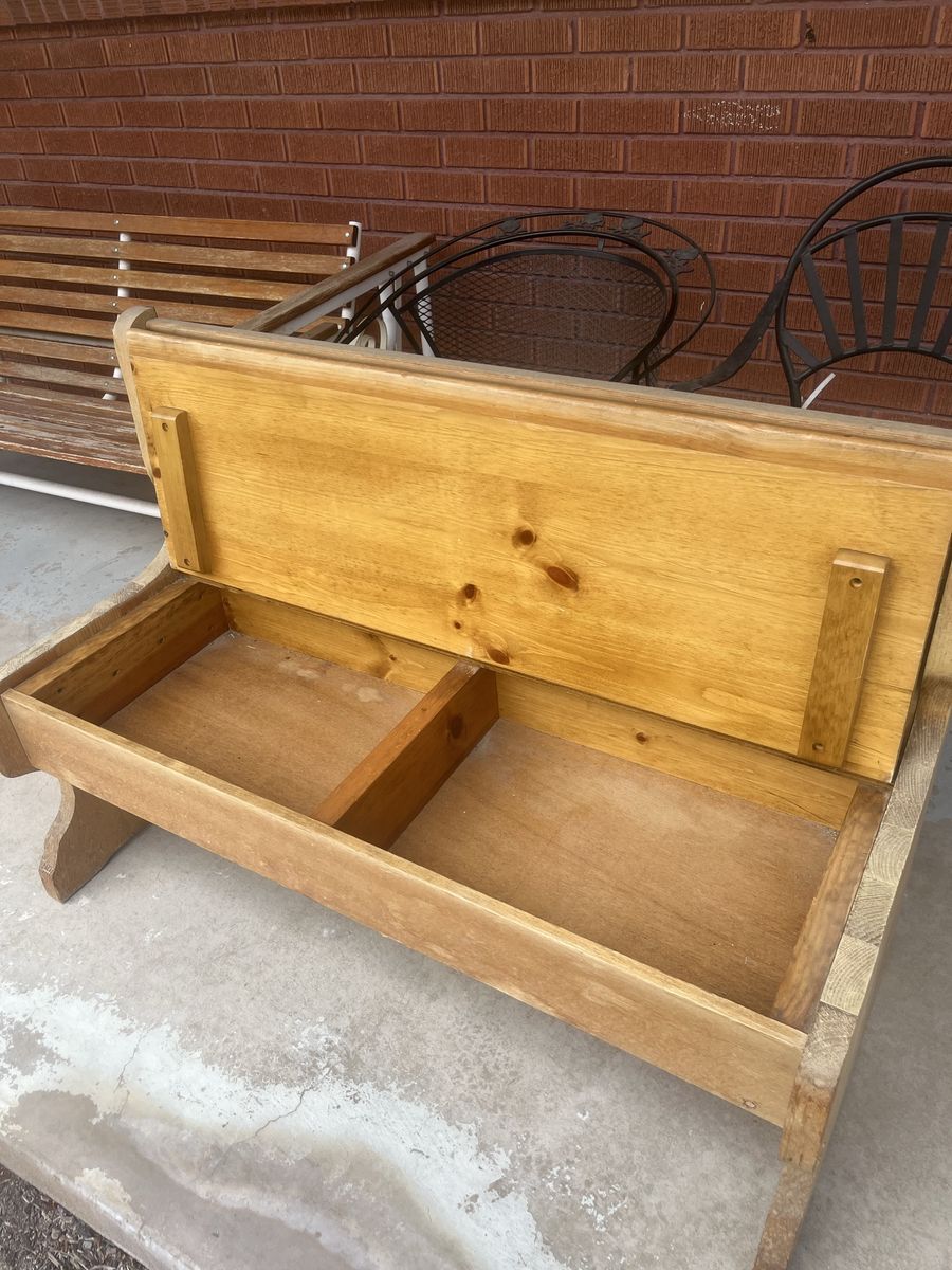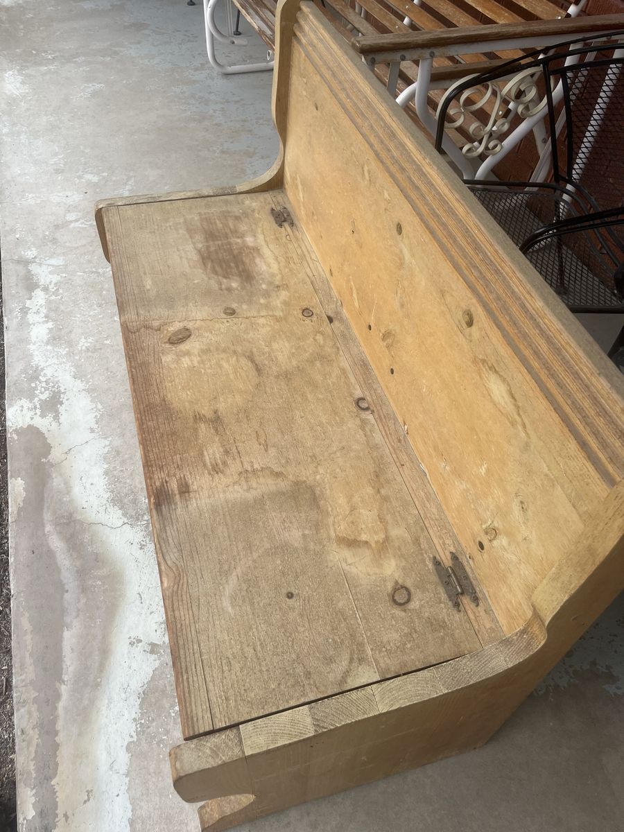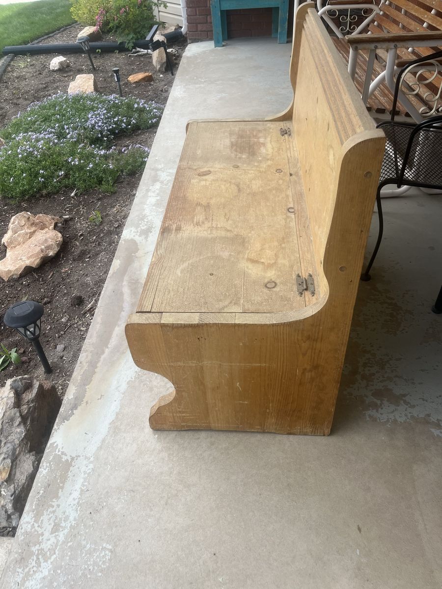 VenmoWooden bench with storage under seat. Weathered but sturdy. 49” L 20” W 33 1/2” Ht