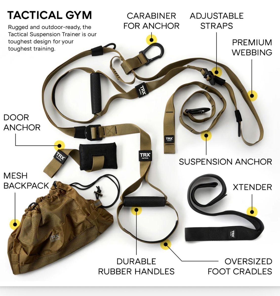 Description from the website: TRX Tactical The TRX® Tactical Gym is a complete workout system that includes everything you need to train anywhere, whether at home or on the go. The TRX Tactical Suspension Trainer, Door Anchor, Suspension Anchor, Xtender, and Drawstring mesh backpack are all included in this versatile package.