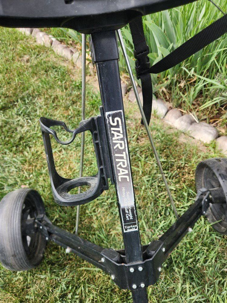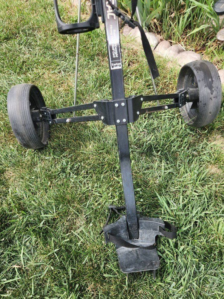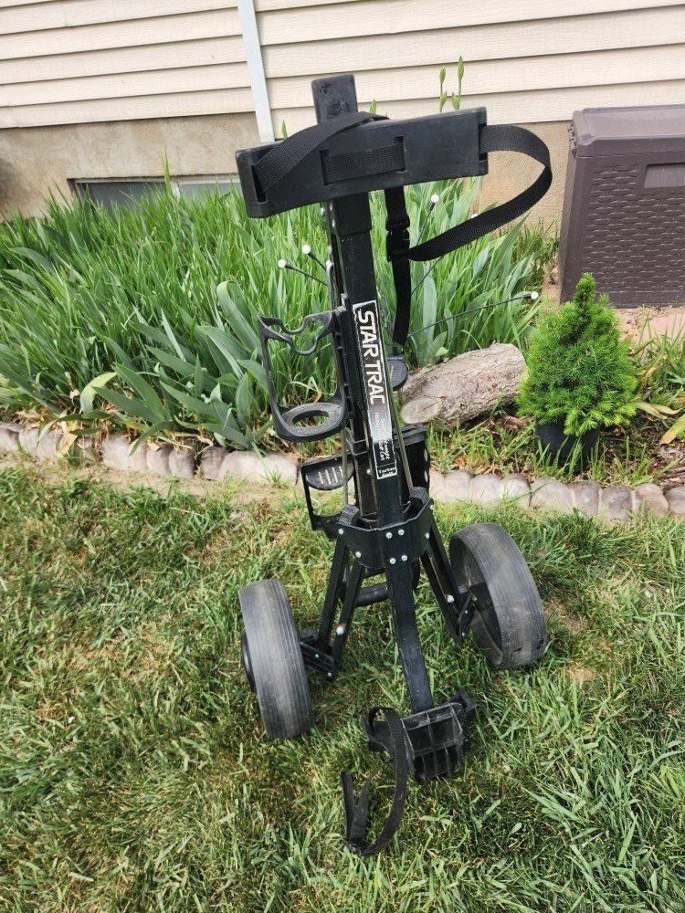 VenmoStar Trac 2 wheeled golf cart. Featuring 2 drink holders, scorecard holder tee holders, and ball holders. Good straps and wheels. Folds easily for transport and or storage. $30.00 or best offer.