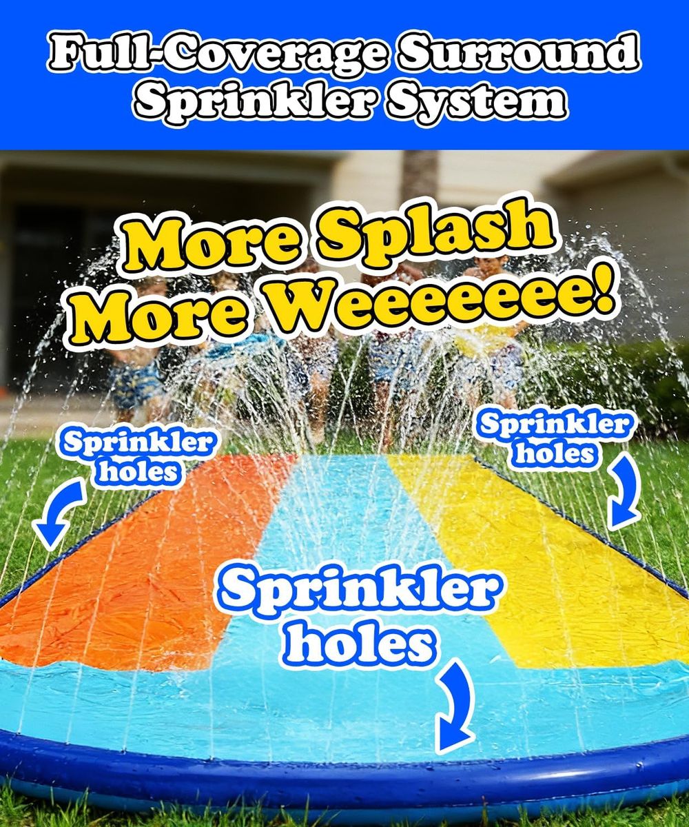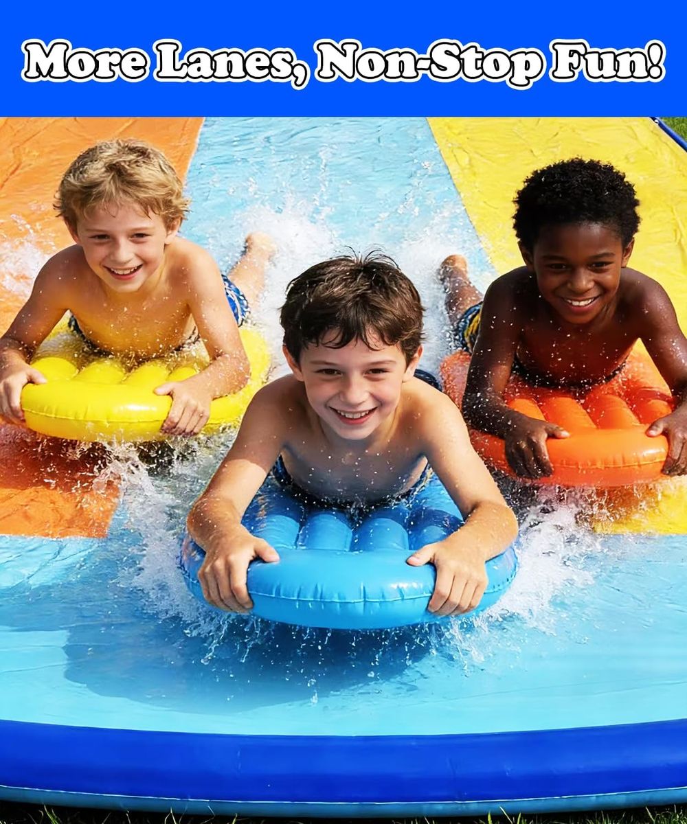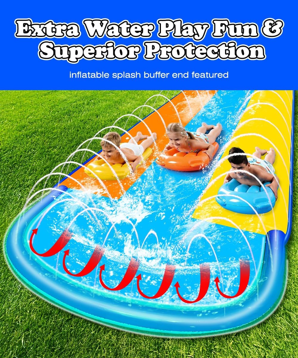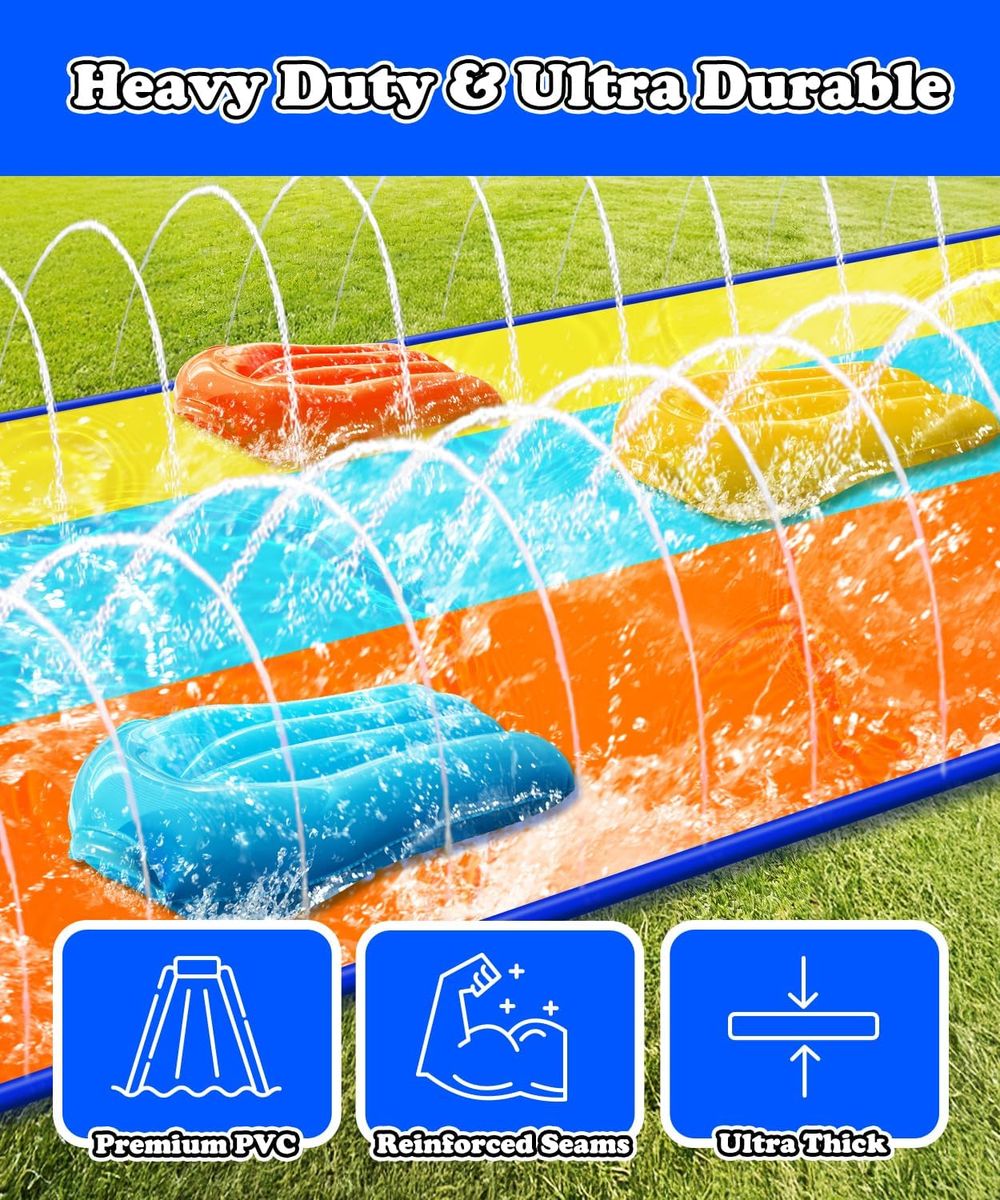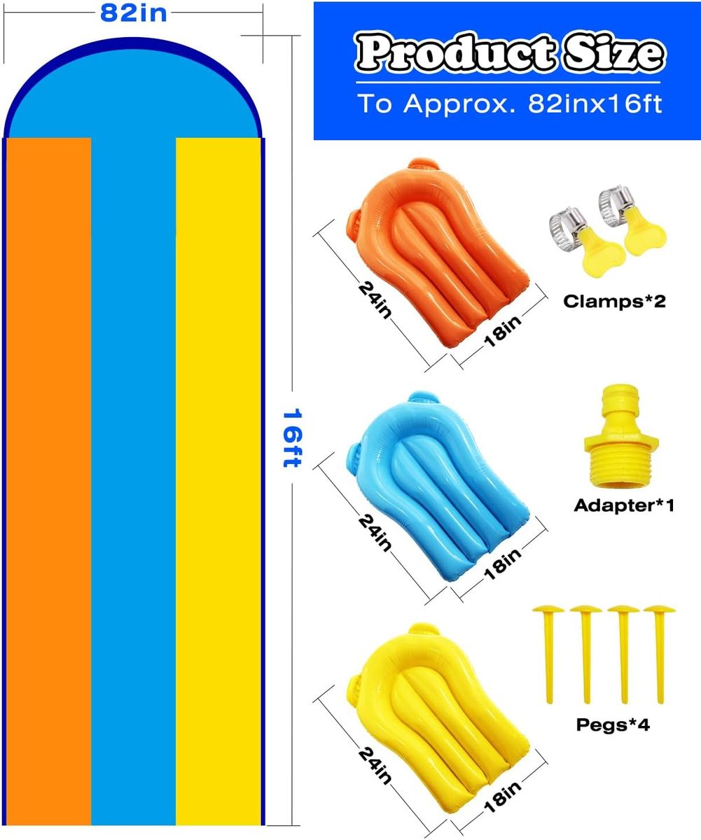 NEW IN BOX! Triple Water Slide with 3 Bodyboards, 16ft x 82in Extra Long Wide 3-Lane Slip and Slide with Upgraded Surround Sprinkler System, Thickened PVC Water Slides for Kids Backyard Home Outdoor Fun