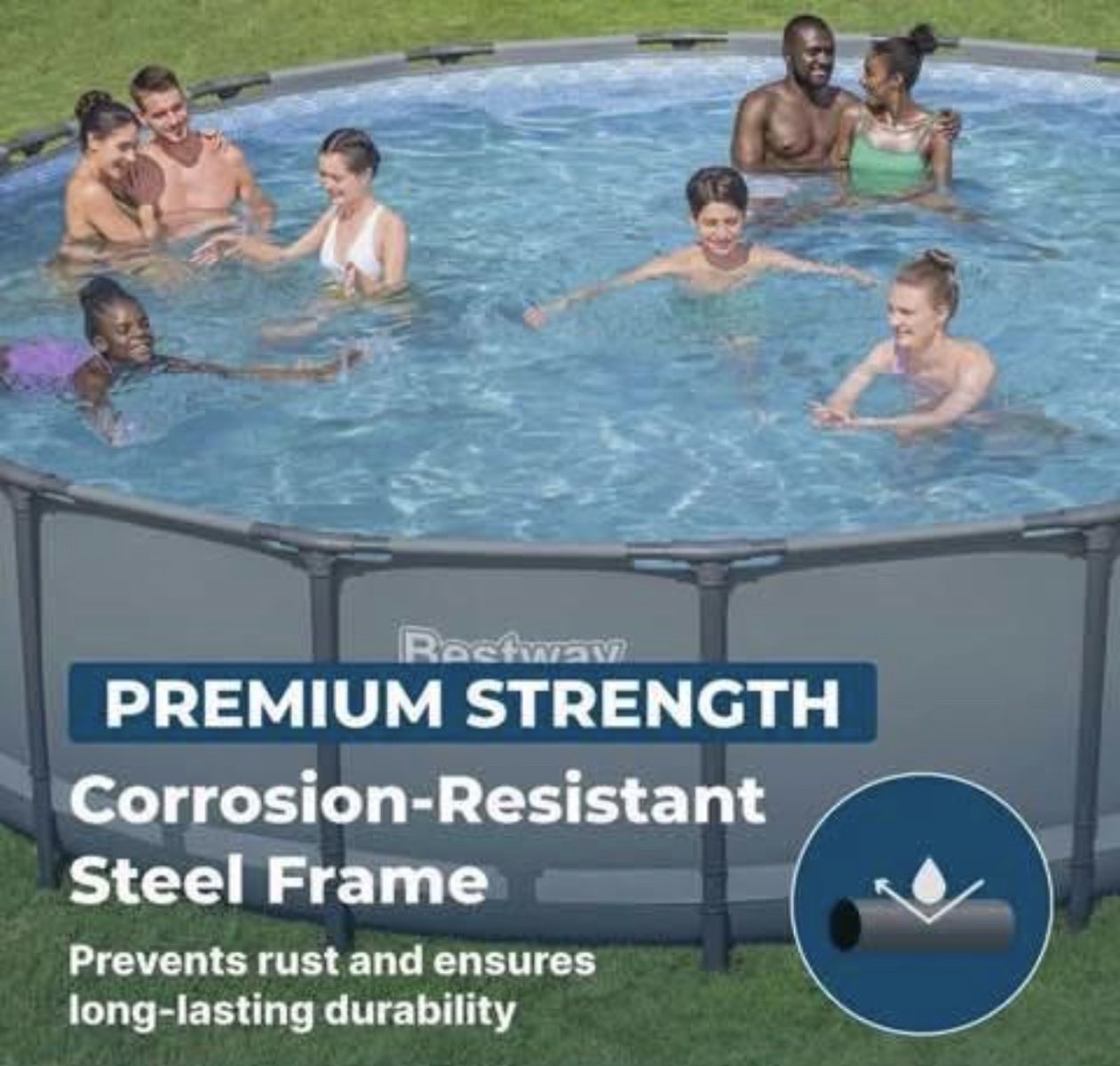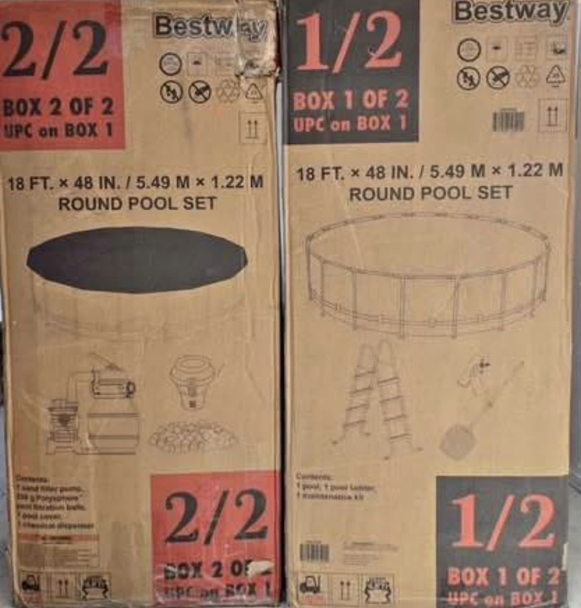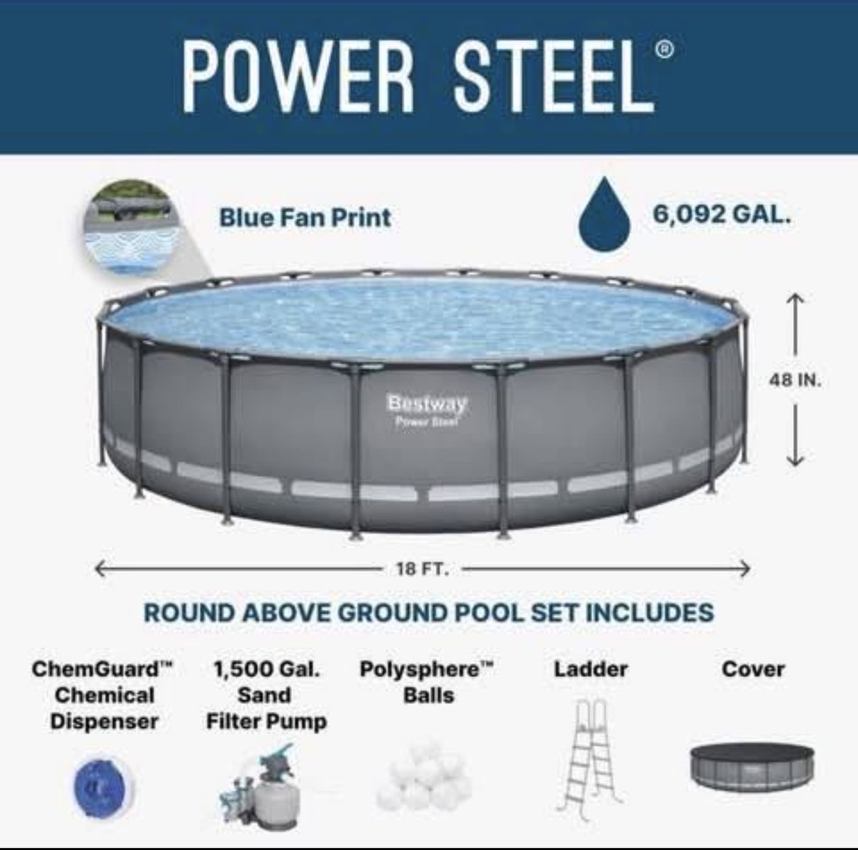 Bestway Steel Pro MAX 18’ X 48” Round Above Ground Pool Set Assembled Dimensions: 18' x 48 Weight: 163.14 lbs. Water capacity: (90%) 6,092 gal. (23,062 L) Included in package: 1 pool, 1 sand filter pump, 1 ladder, 1 maintenance kit, 1 pool cover, 250 g of Polysphere Pool Filtration Balls, 1 ChemConnect dispenser Located in west valley city
