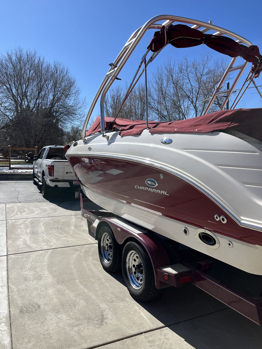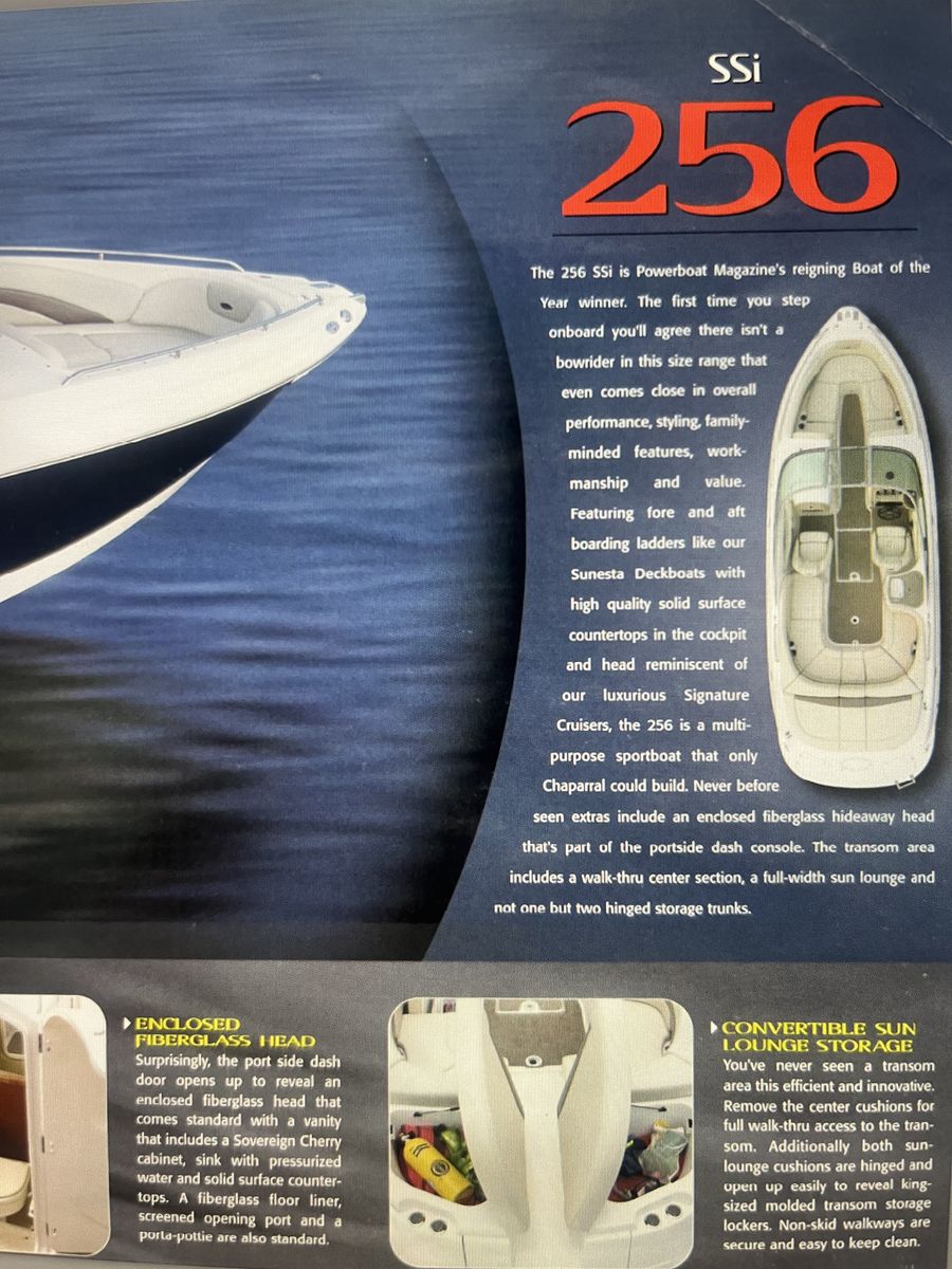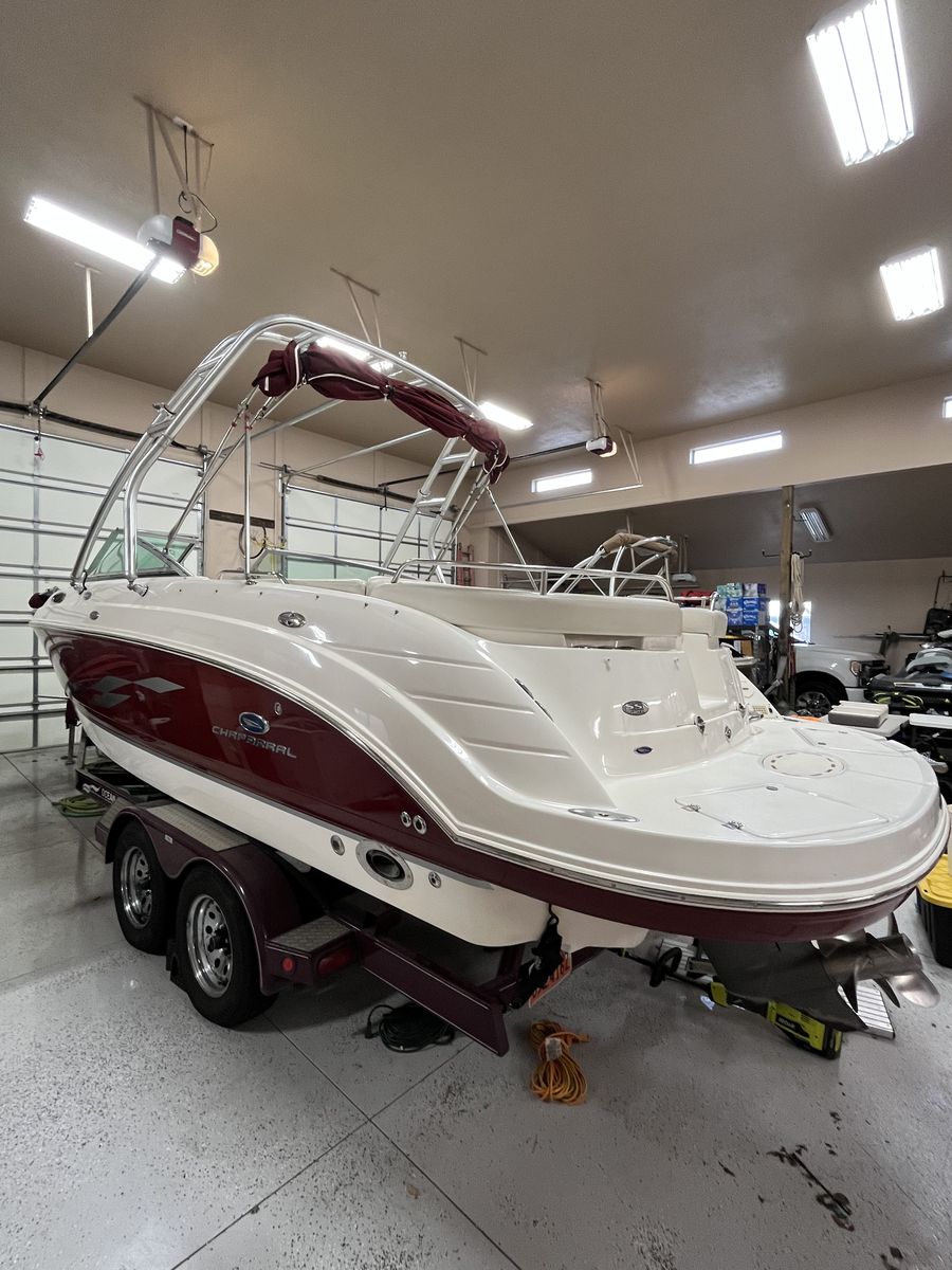 Specs. Length: 26’5” Beam: 8' 6" Fuel Capacity: 80 gallons Weight: 4,950 lbs. Seating Capacity: 13 persons Motor: Volvo Penta 8.1 425 HP Dual props outdrive Engine Hours: 394 2005 Chaparral SSi 256 for Sale equipped with the Volvo Penta 8.1 Gi gasoline engine. This boat has been a fantastic boat for our family. It has been great lake Powell boat. Great for wake boarding, tubing, water banana tubes. Especially exploring the many canyons and traveling on the lake. We have also used this boat on other Utah lakes. This Chaparral has had two owners. It has always been stored in a garage or warehouse. It is in great shape and has been well maintained. Other features include. -Extra Dual prop. -snap in Carpet kit that is like new we have never used it. -2 great Bimini tops they connect together. -Cuddy Cabin Canvas pack- like new never used. -wake board tower with 2-racks. -Rockford Fosgate speakers -Head enclosed with lockable door. -w/sink/faucet/grab rail/ mirror/toilet -fresh water tank for pressurizes water. -Great drainage system for easy clean up. -Fish finder and CB radio and antenna