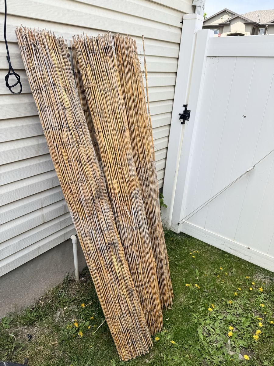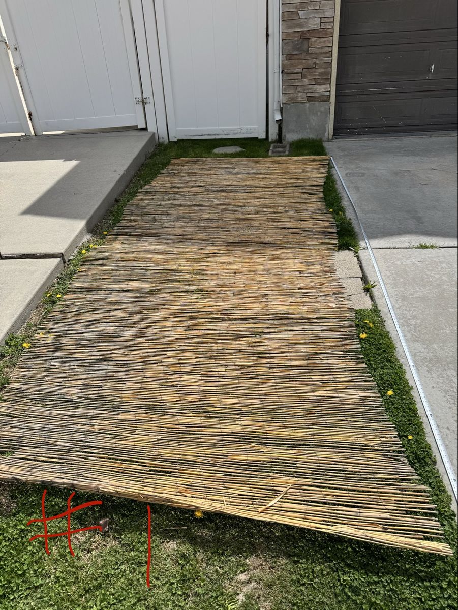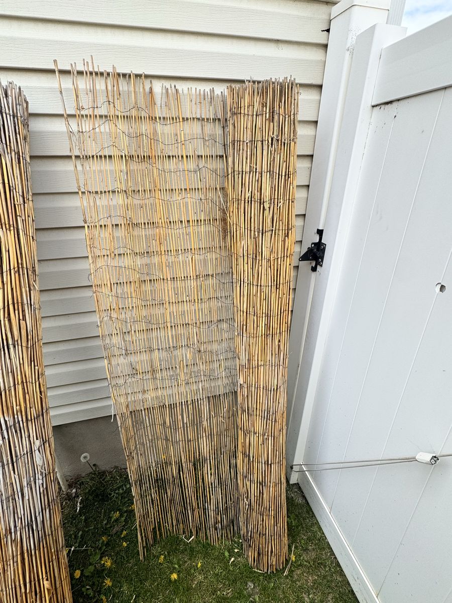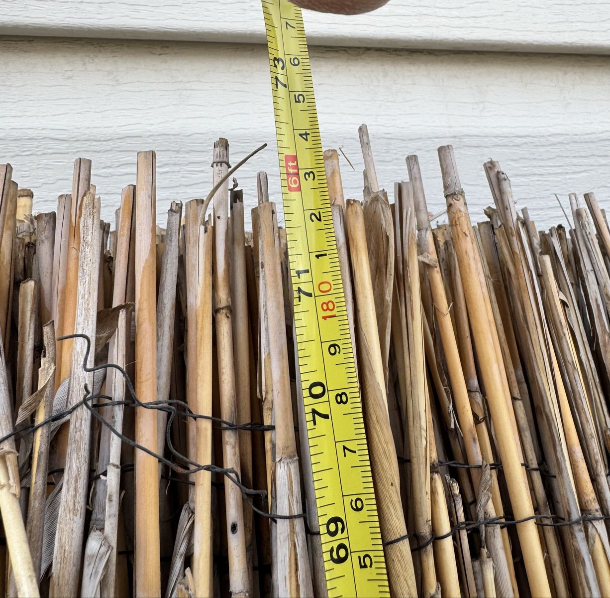 Description from the Lowe’s website: Enhance your outdoor living space with natural and appealing reed fence. The Garden Craft oft H x 15ft L reed tence is attractive, light weight, and extremely versatile. Standing 4ft high, this fence provides a great solution to increase privacy needs for your yard, garden or outdoor living area. Reed is connected with rust resistant galvanized steel wire. Fence can be easily rolled for storage purposes. Can be used with stand alone fence posts or added to an existing fence to enrich the ambiance. • Fence measures 6ft H and 15ft L • Light in weight and partially transparent • Use as an addition to existing fence or as a standalone with fence posts • Reed is connected with durable, rust-resistant galvanized wire • Makes a very attractive addition to outdoor living spaces including patios, pool areas, tiki huts, garden fence and more • Easily rolls up if needing to store • Will not stand alone, requiring posts or some sort of support • Easily adapts to contours of landscapes, hardscapes, fence or structures
