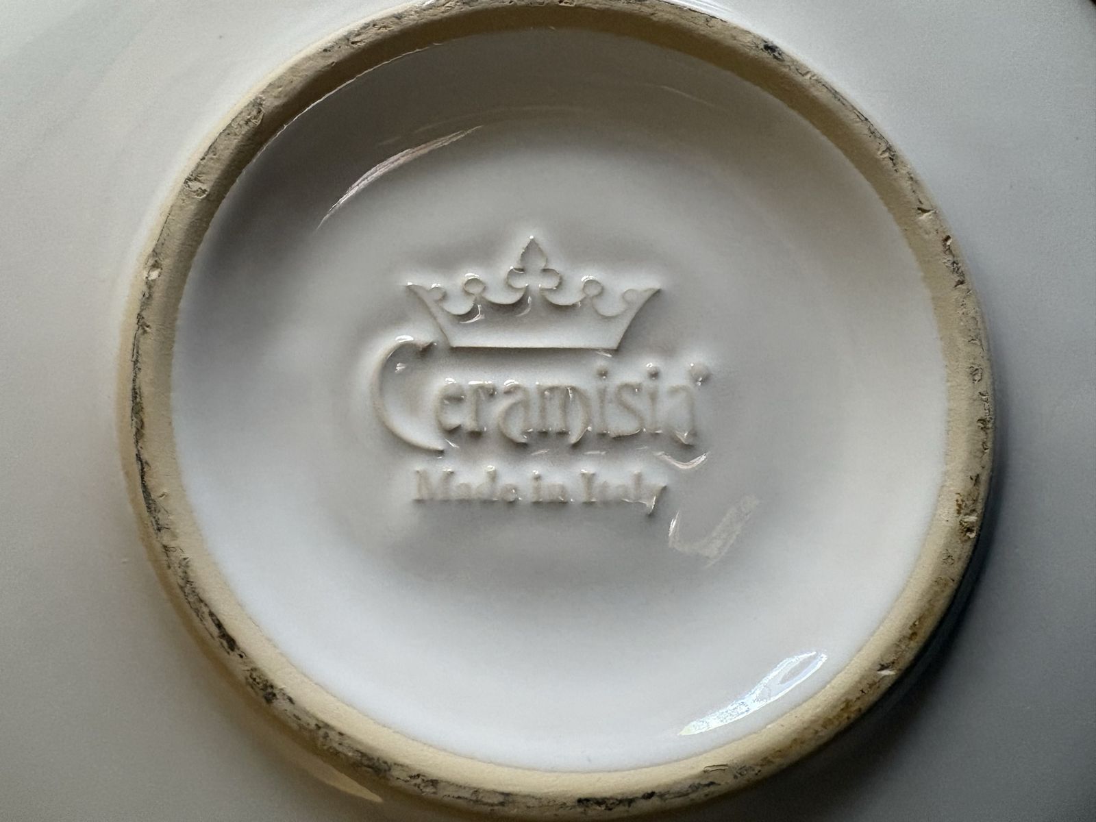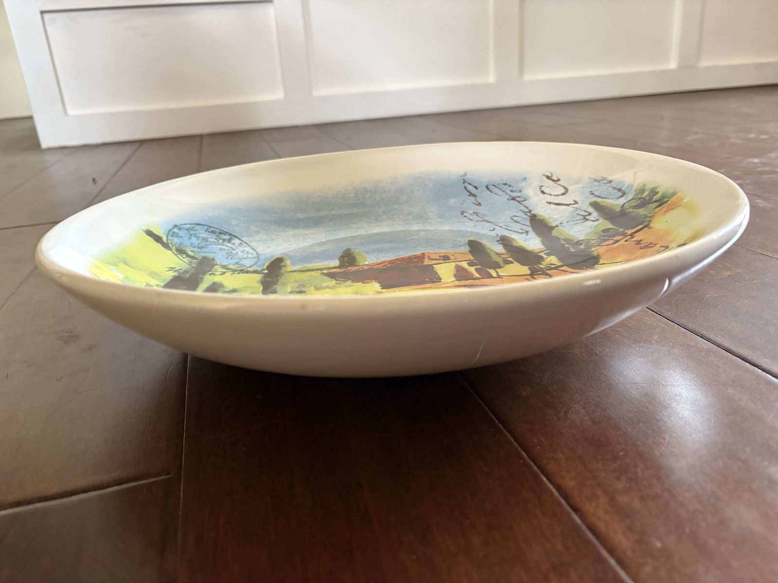 I have a beautiful large Ceramisia serving bowl with a Tuscan scene and sunflowers. It is 14 inches across and just under 3 inches tall. It was made in Italy. See my other ads for jewelry, artwork, home decor and more.