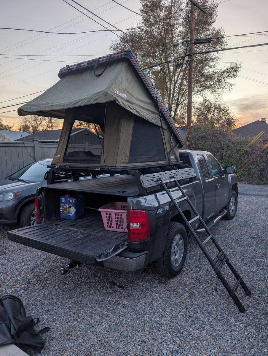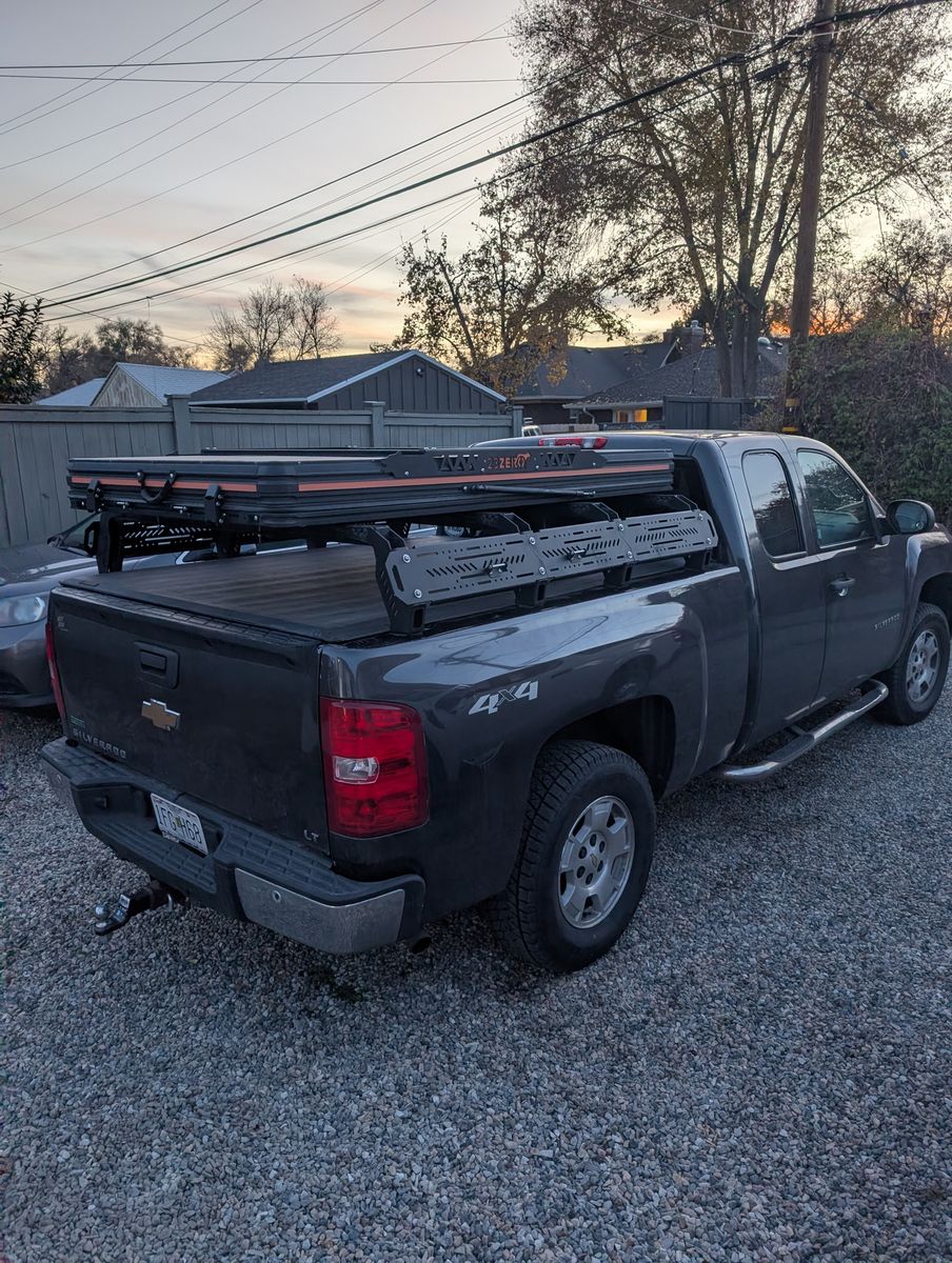 Truck bed rack for roof top tents, showers, shovels, fuel cans, etc. Weight rating is 400lbs while driving and 1200 lbs stopped.