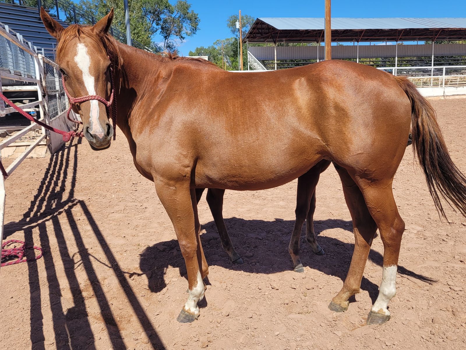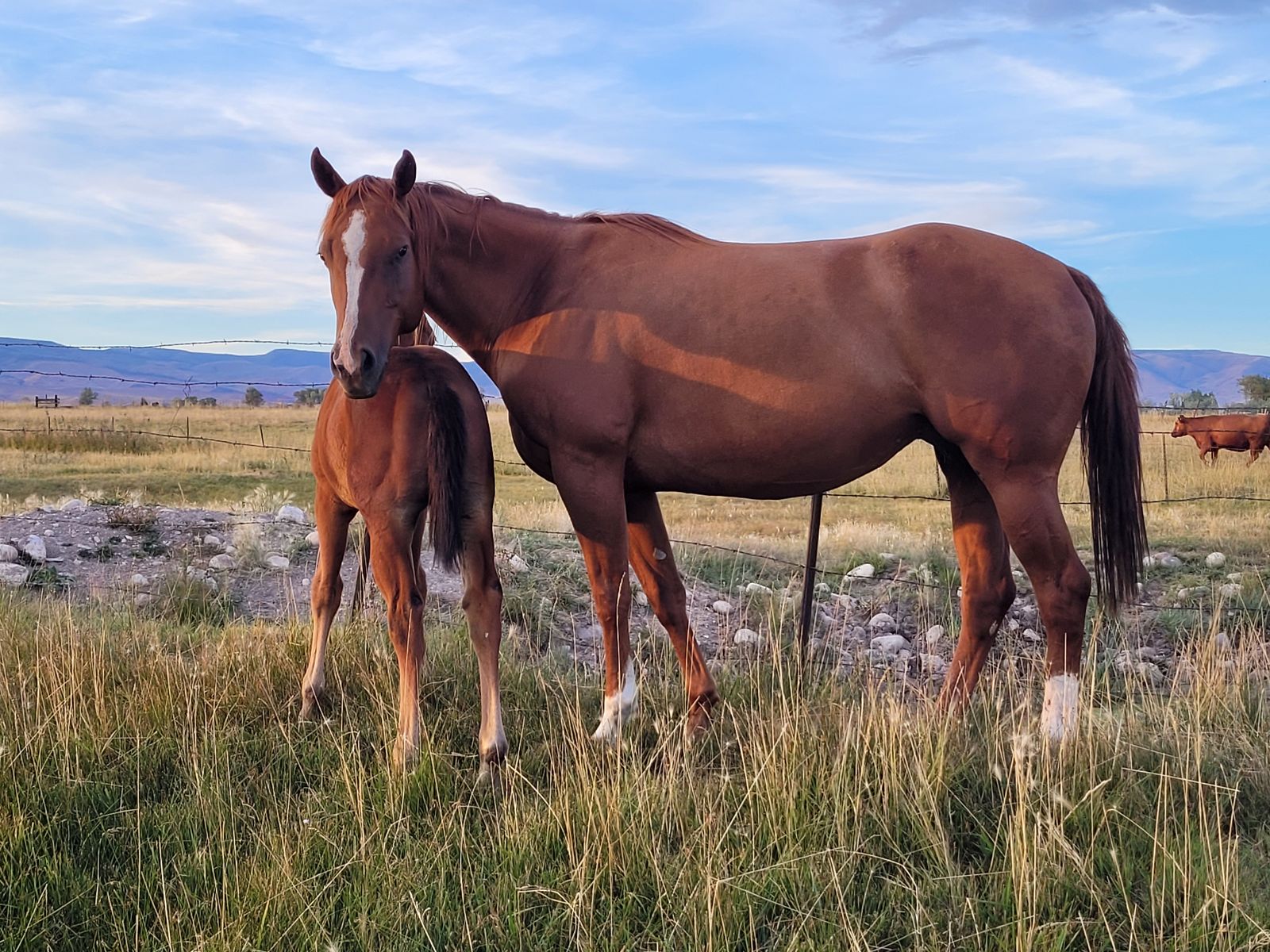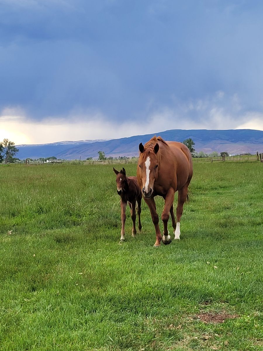 "Reba" is a fantastic mother. Has had 3 babies, one being in 2025 that is pictured. Easy birth on her own, tons of milk, takes good care of her babies. She is broke to ride and sound but needs an experienced rider. Has not been rode in a few years so will need a tune up. I have more videos and pictures so text me if interested.