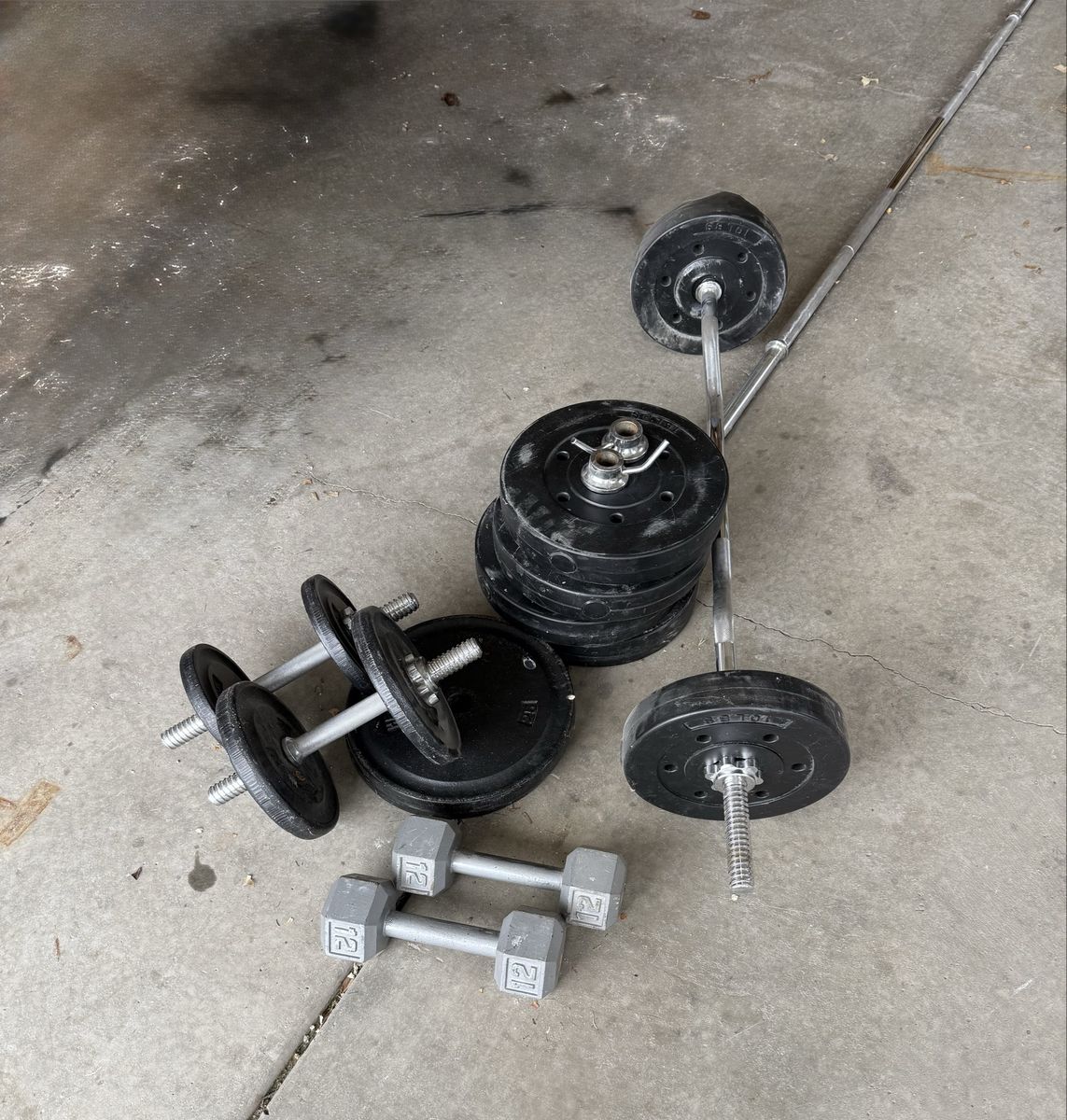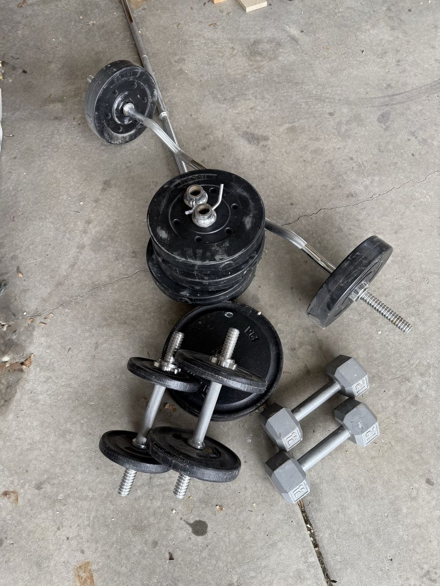 2- 12 lb dumbbells 1- curl bar 1- 7’ straight bar