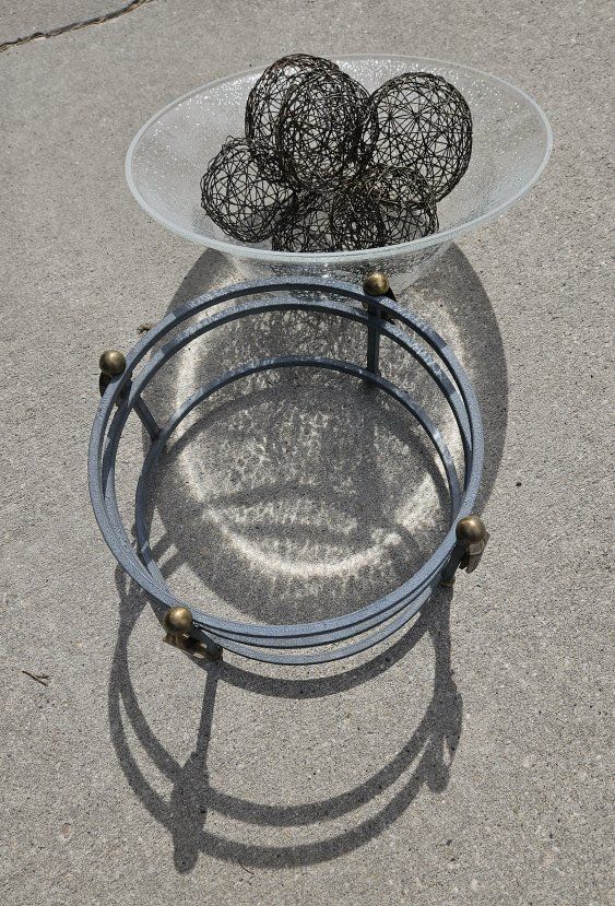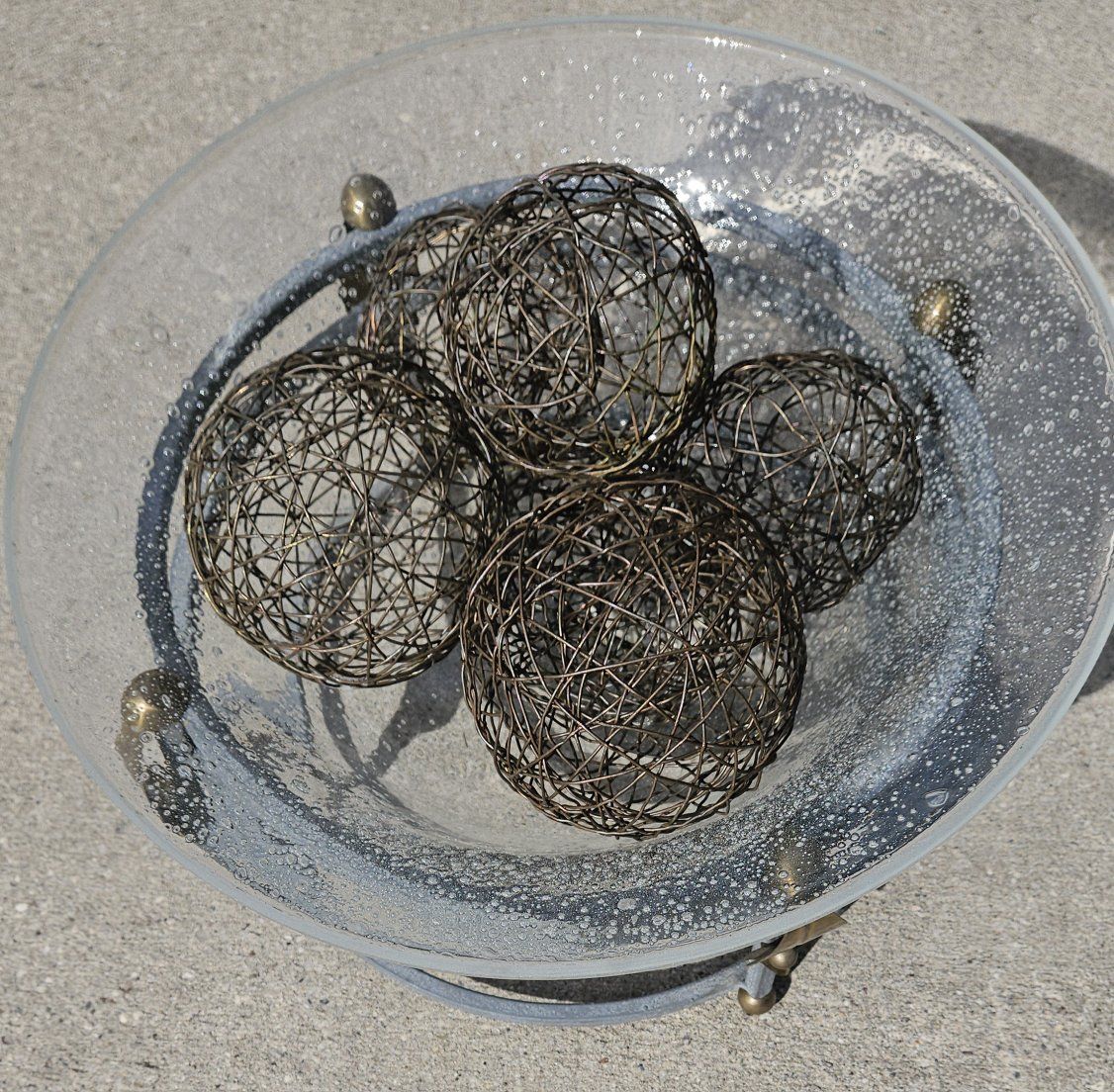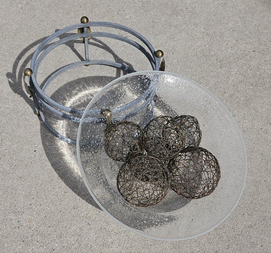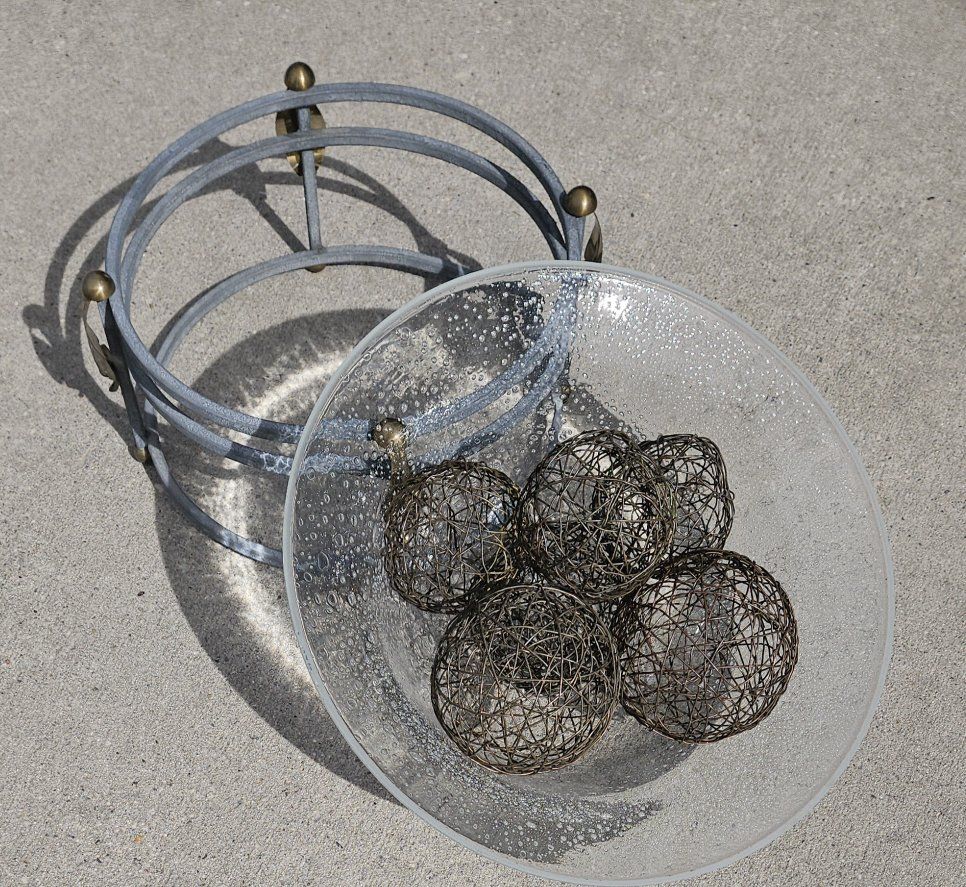 VenmoWire BALLS 3 different sizes. The frame has a durable textured light green finish with brass leave's and brass round's and 3 levels of construction. 12" tall x 16" round. Very heavy blown GLASS.