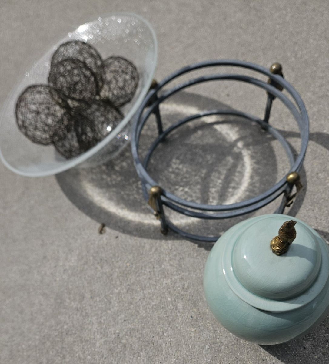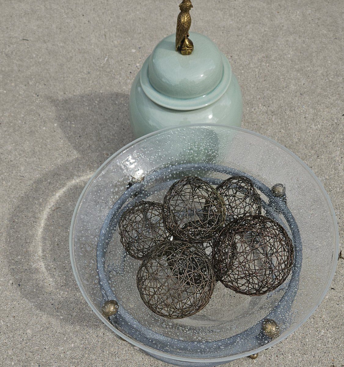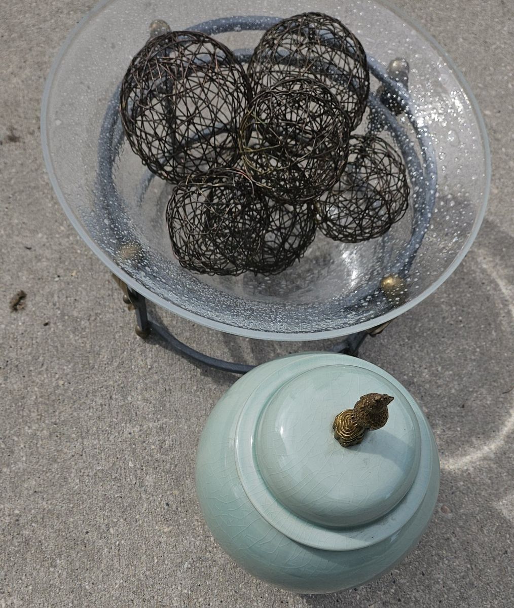 VenmoWire BALLS 3 different sizes. The frame has a durable textured light green finish with brass leave's and brass round's and 3 levels of construction. 12" tall x 16" round. Very heavy blown GLASS.