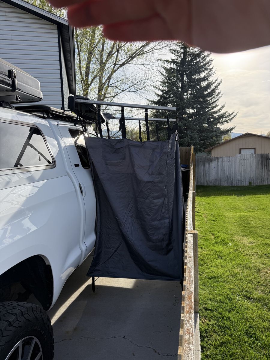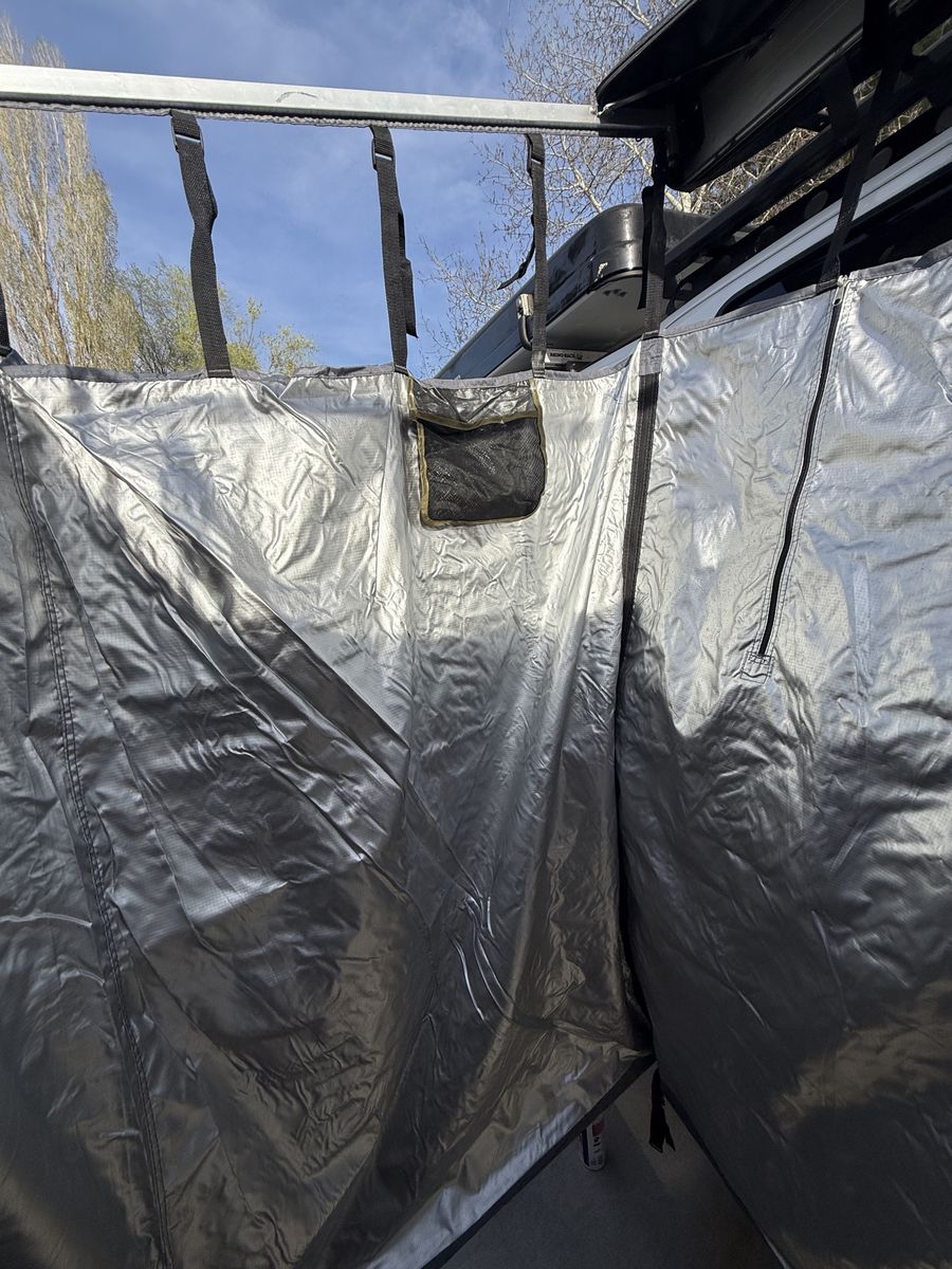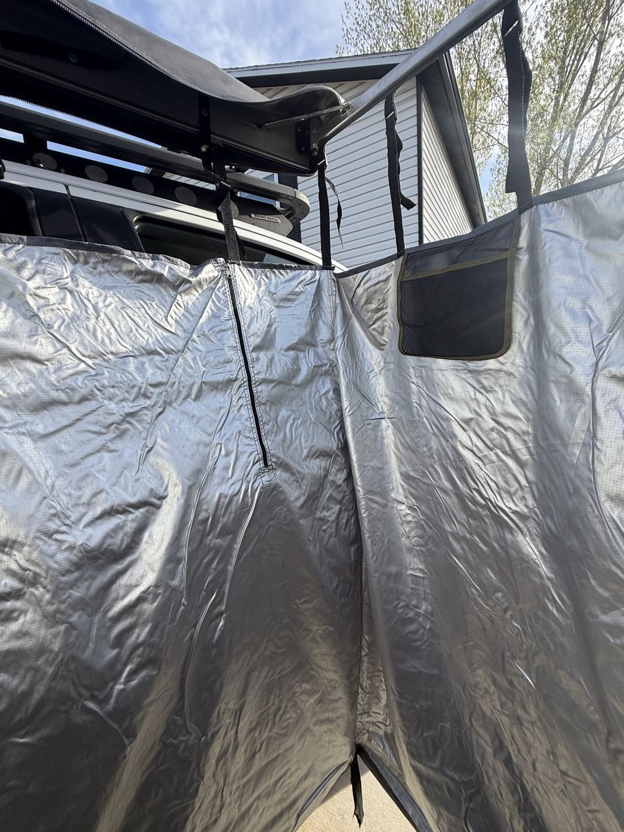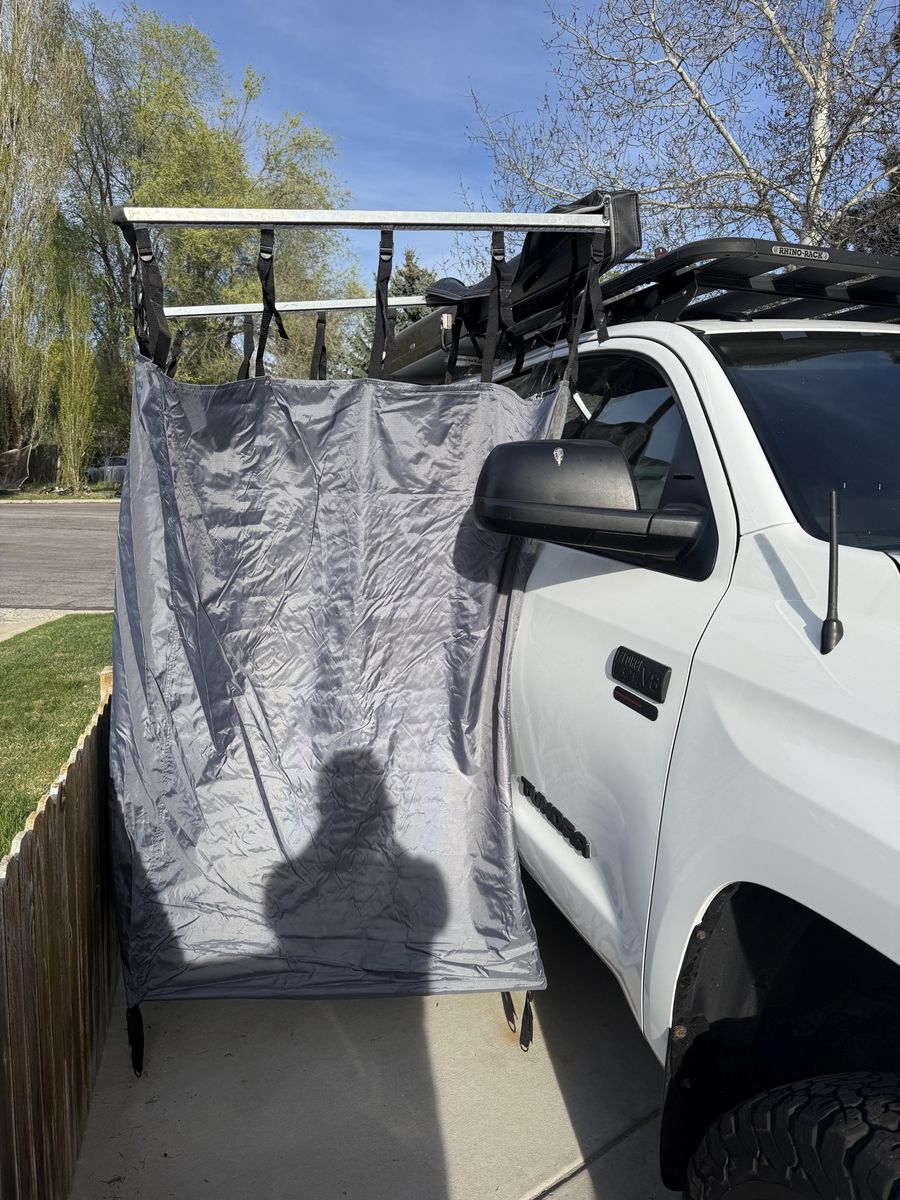 VenmoThis is a 3.5’x3.5’ by 6’ tall Overland Vehicle Systems HD Nomadic Car-Side Shower Room. Looks like an awning all folded up, but pops out to be the perfect place to change clothes or take a shower while camping. It has bars at the bottom to help keep its shape. Has a very adjustable height to fit your vehicle perfectly. Adjustable stake loops to keep it secure in the wind. Super quick and easy setup makes it a breeze to use, even on the side of the road for a quick swimsuit change to jump in that inviting river. Has two mesh pockets to hold toiletries. Internal zippers to be able to access your vehicle while inside. Includes mounting brackets and stakes.
