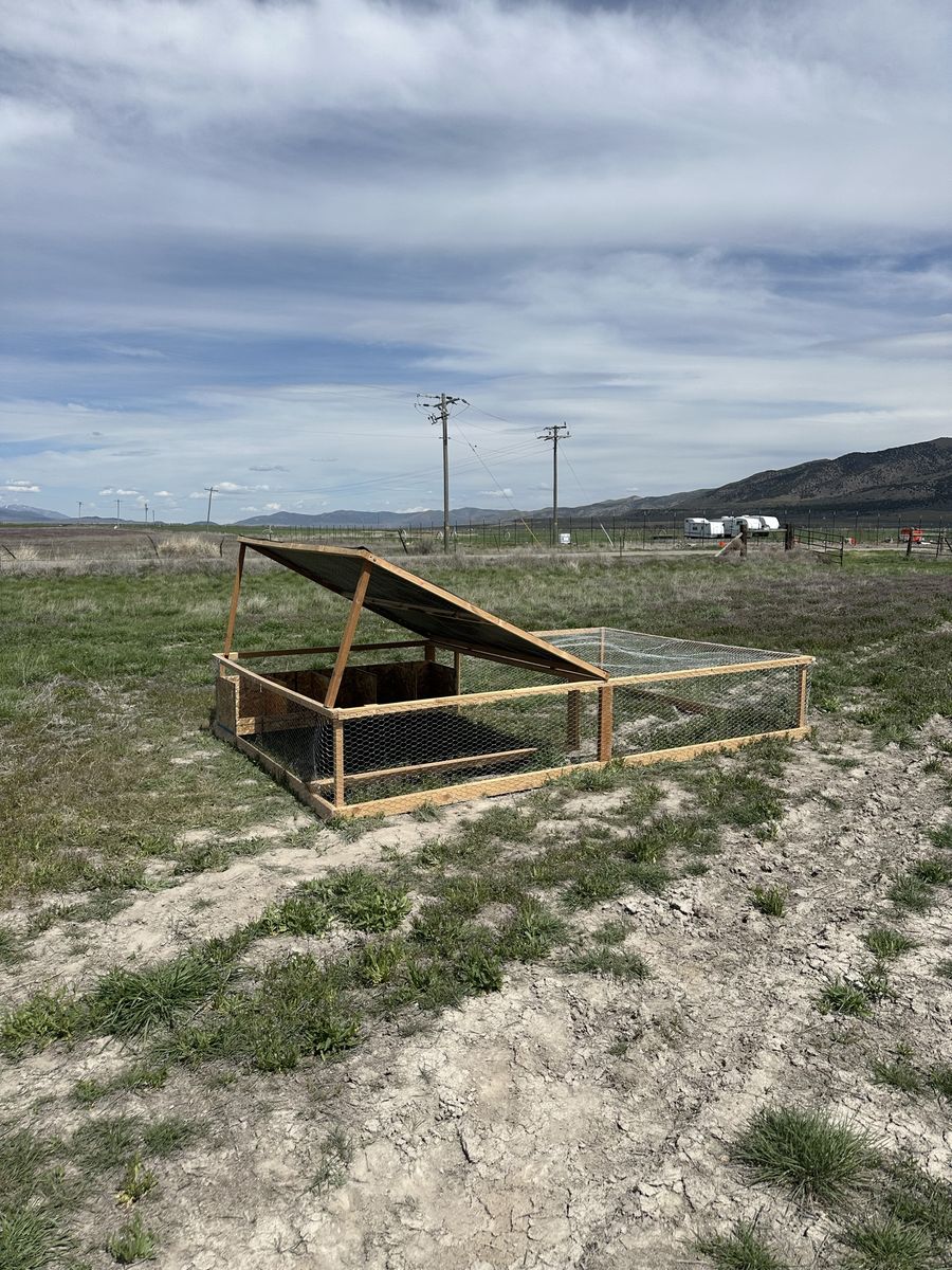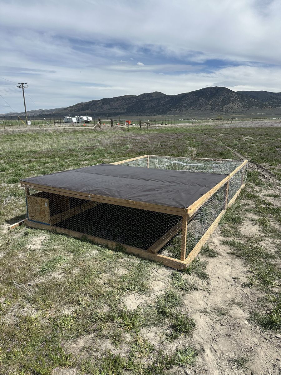 This chicken tractor is in brand new condition. At 8ftx12ft it has plenty of space yet is still light enough to easily move around. It has a roost bar so the chickens can sleep off the ground and has 5 nesting boxes for your egg laying hens.