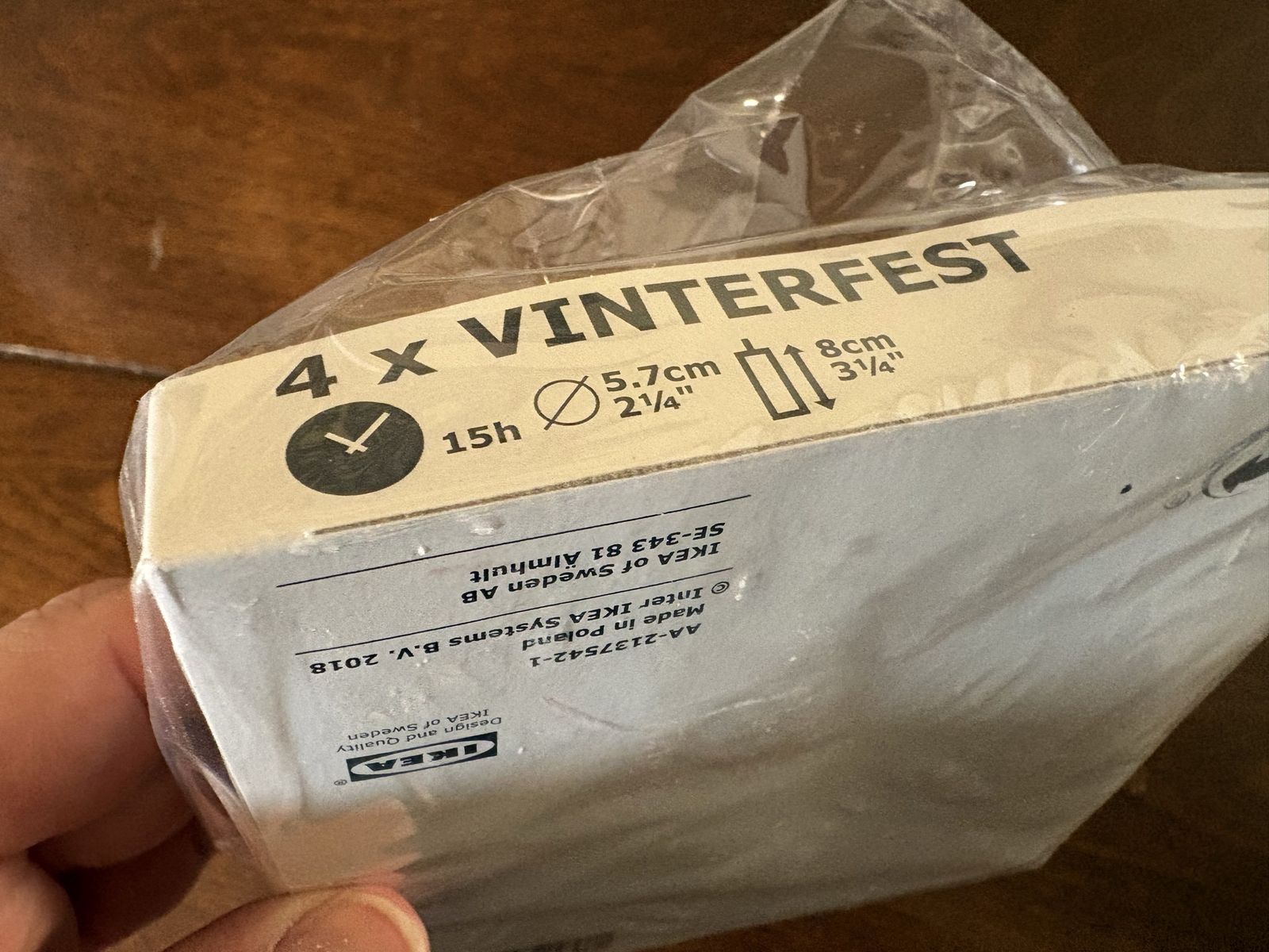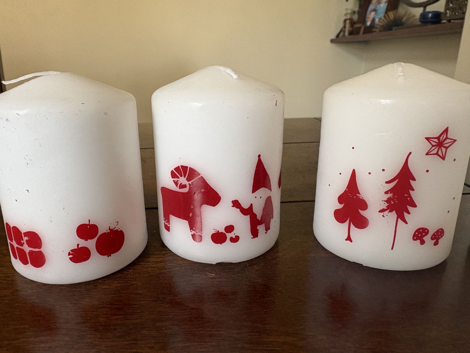I have 5 unused IKEA Vinterfest candles. They are unscented white candles with red in them. 2 have Santa gnomes with rams, 2 have gifts and 1 has trees with mushrooms. The package says they are 3 1/4 inches tall and 2 1/4 inches wide. The price is for all of them together. See my other ads for jewelry, artwork, home decor and more.