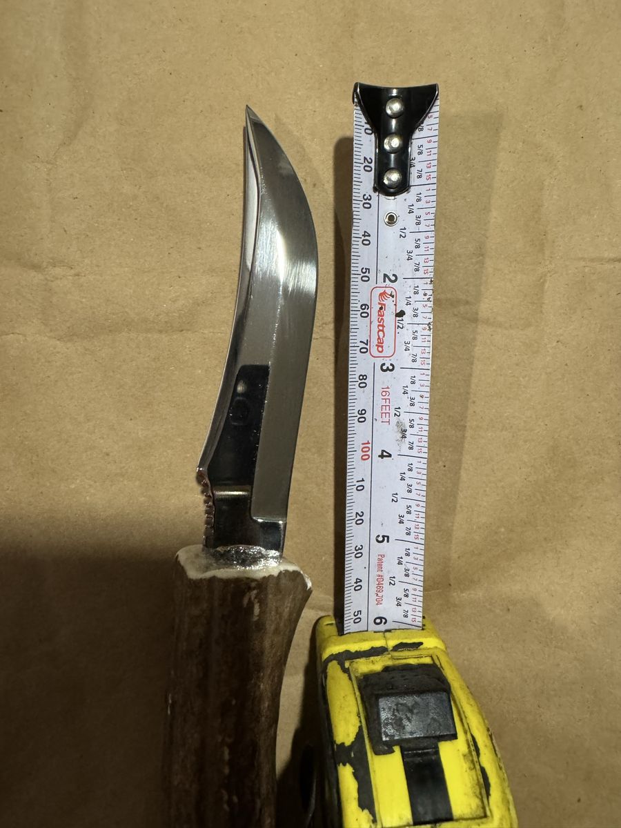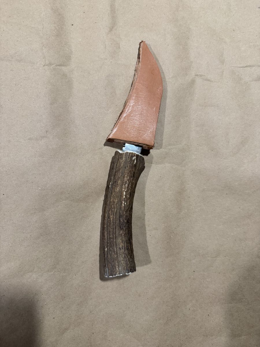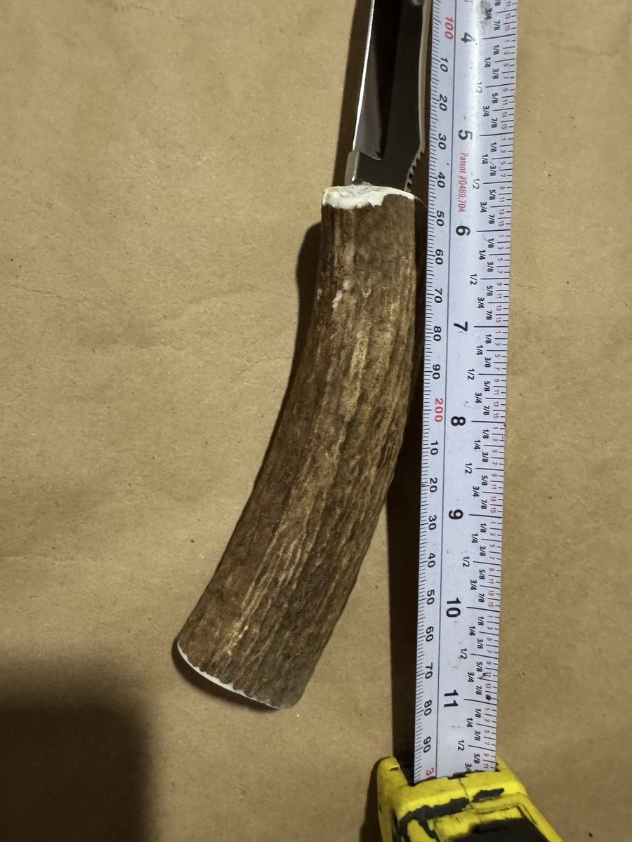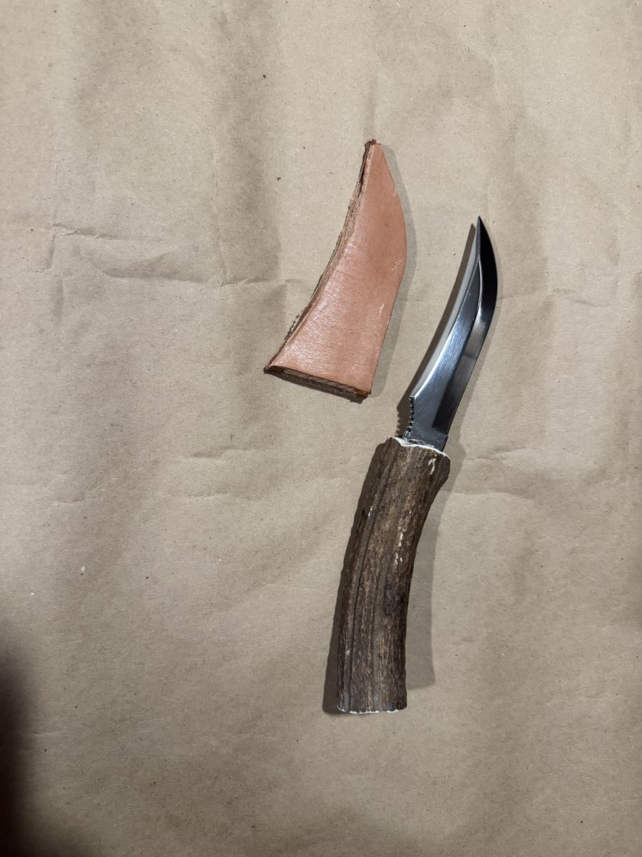 Custom hand made with antler hilt. Leather cover. Overall size is 11"in with a 5"in blade.