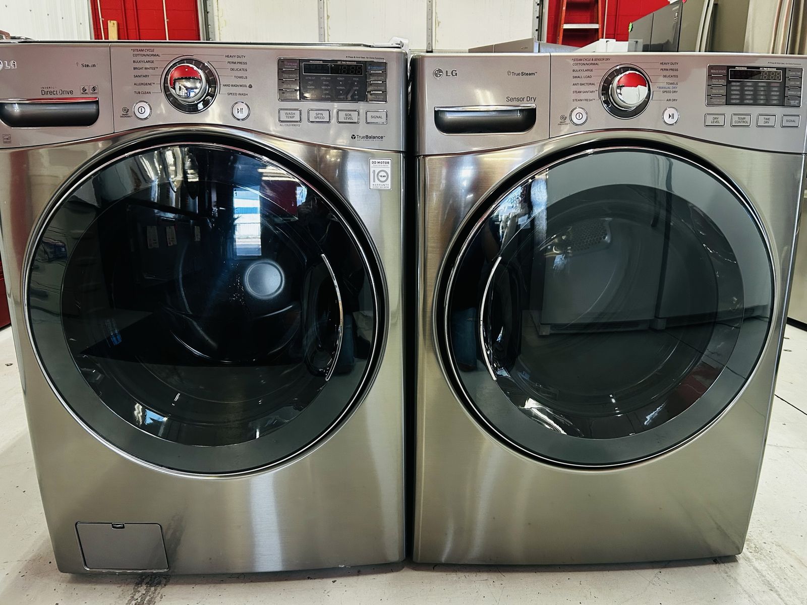 Lg Steam washer inverter direct drive motion 6 turbo wash stainless steel drum heavy duty cotton normal bulky large sanitary allergiene tub clean towels speed wash steam fresh care prewash delay wash extra rinse etc...Lg True Steam Electric Dryer sensor dry high efficiency stainless steel drum heavy duty cotton normal bulky large small load steam sanitary steam fresh speed dry air dry reduce static easy iron wrinkle care damp dry time dry etc..They're in great working order. Clean. 45 day warranty. Delivery/Install available. Can be stacked/stacking kit included.