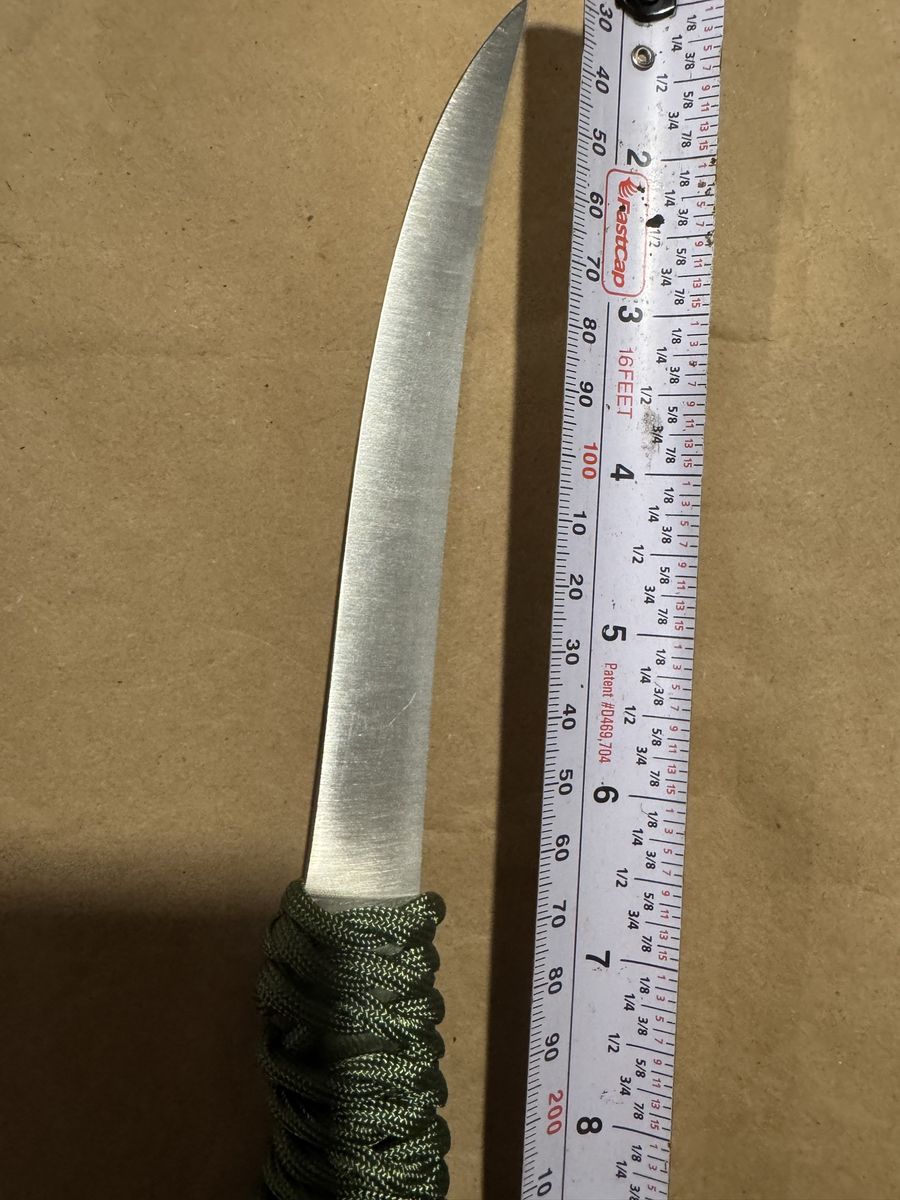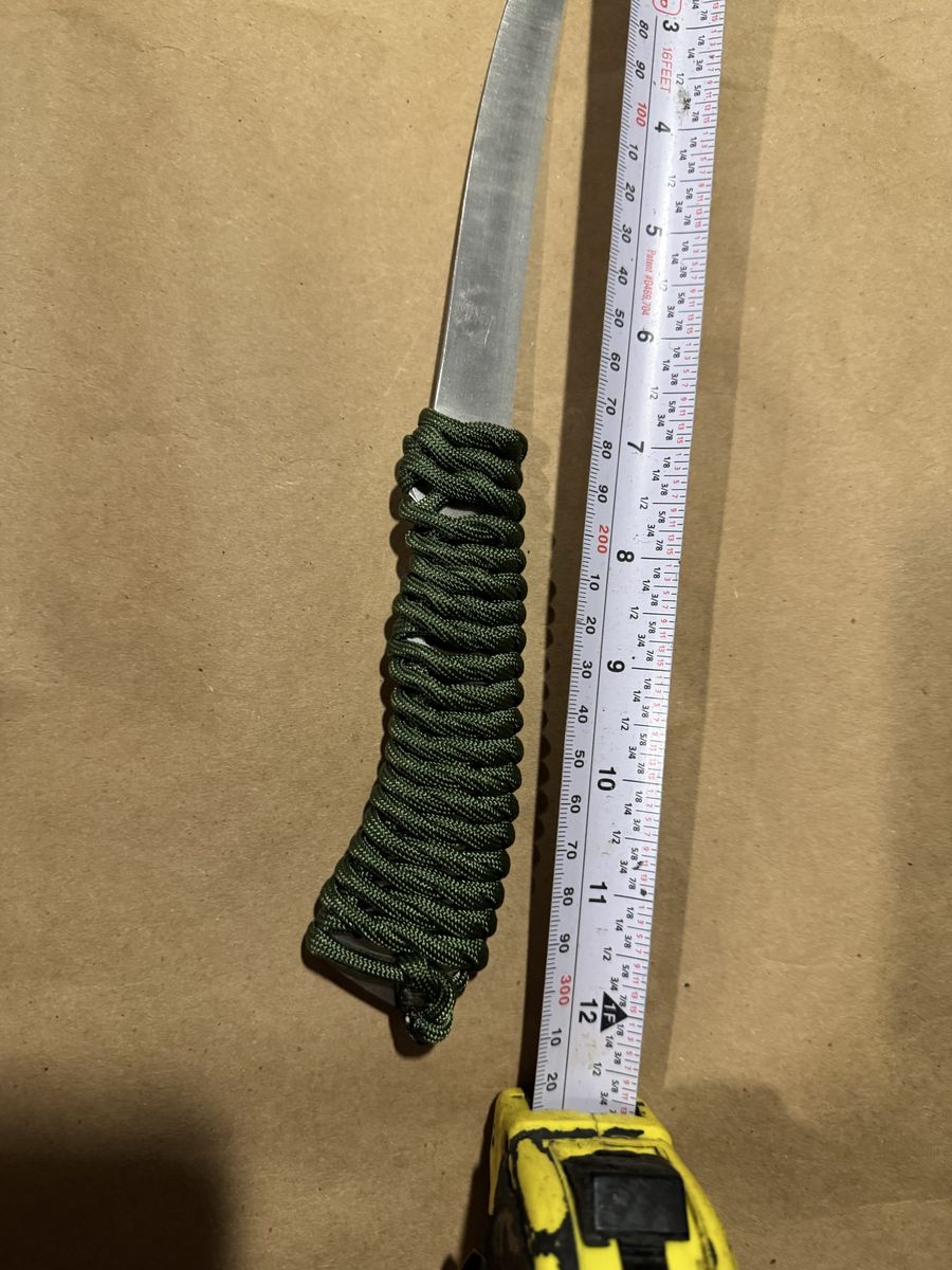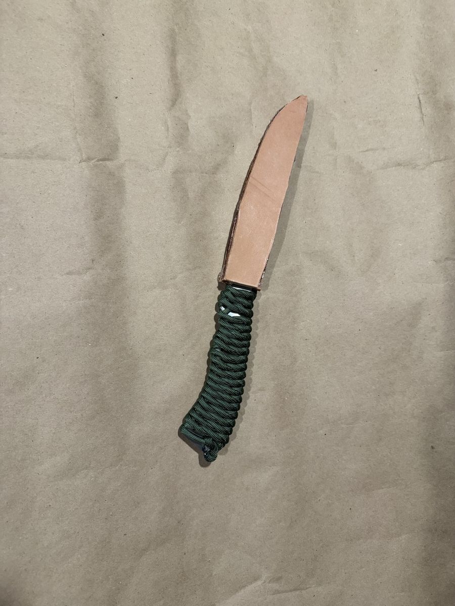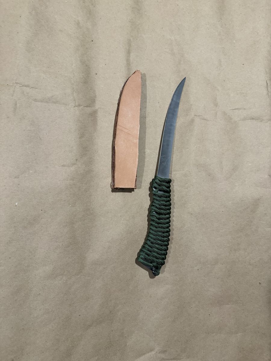 Custom hand made with paracord wrap. Has leather cover, is Great for hunters. Overall length is 12"in and blade is 6.5" in.