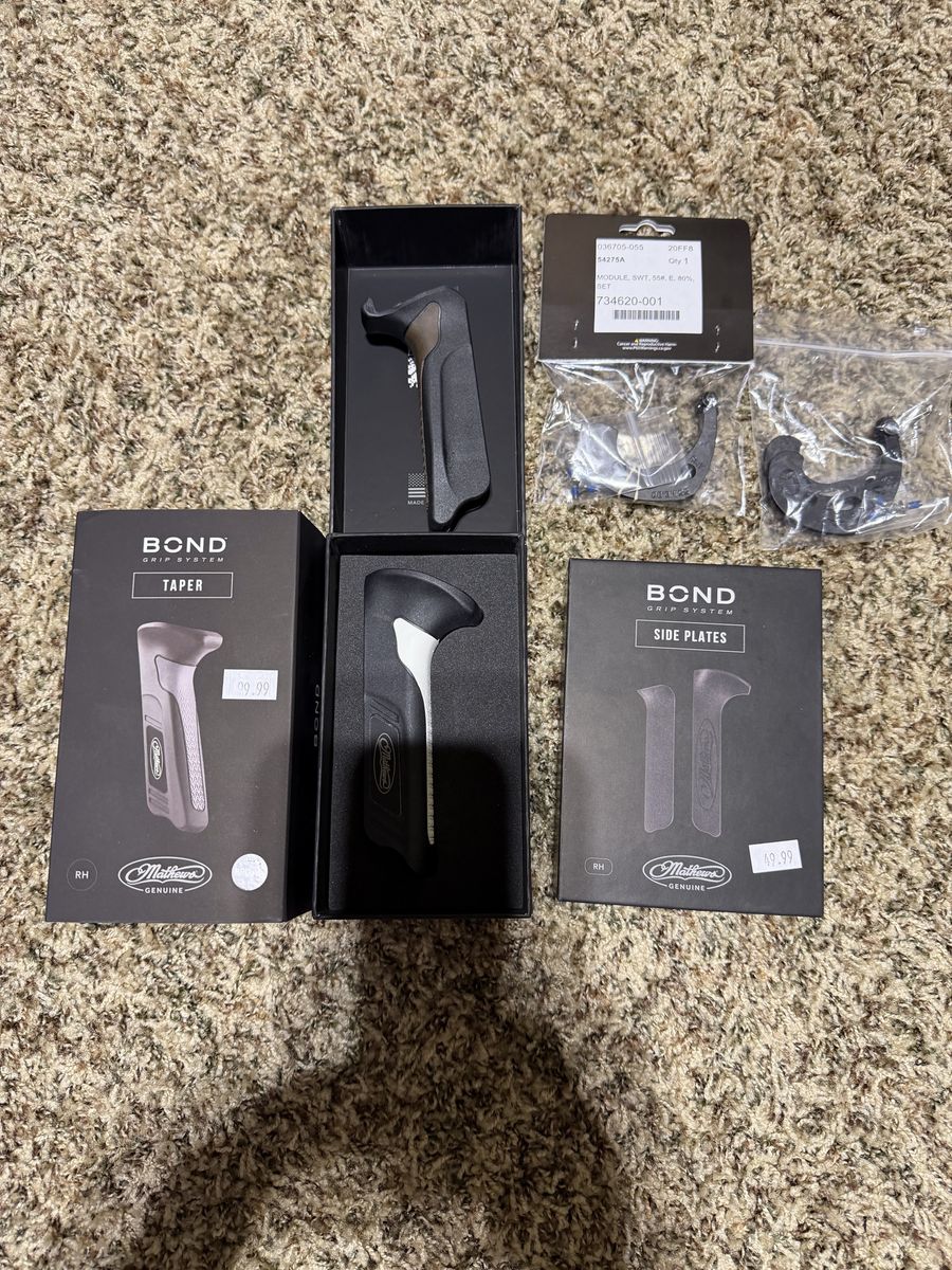 VenmoMathews Title 36 with new gas strings and cables . Also comes with 3 different grips the side plates are on it. Also 3 sets of cams. 29 draw 75% - 28 1/2 draw. The bow is like new great shape.