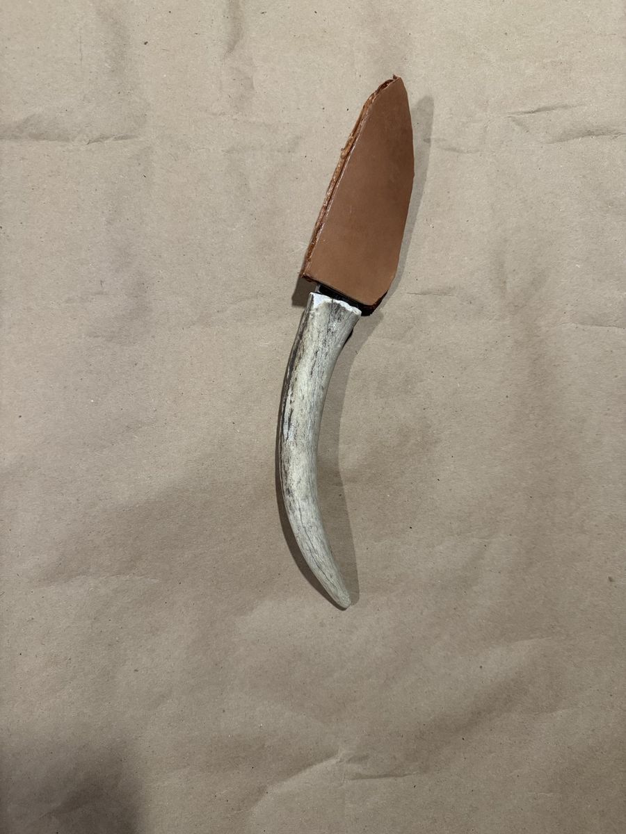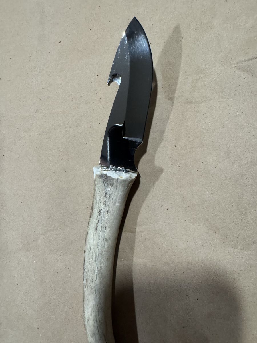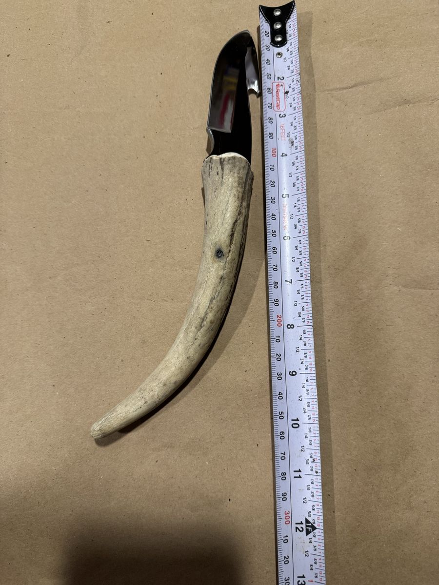 Custom hand made with antler hilt. Has leather cover. Overall length is 10"in with a 4"in hook blade.