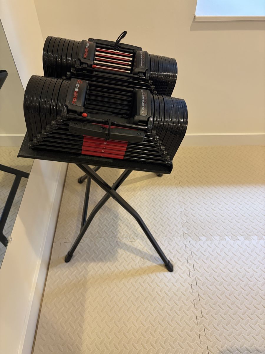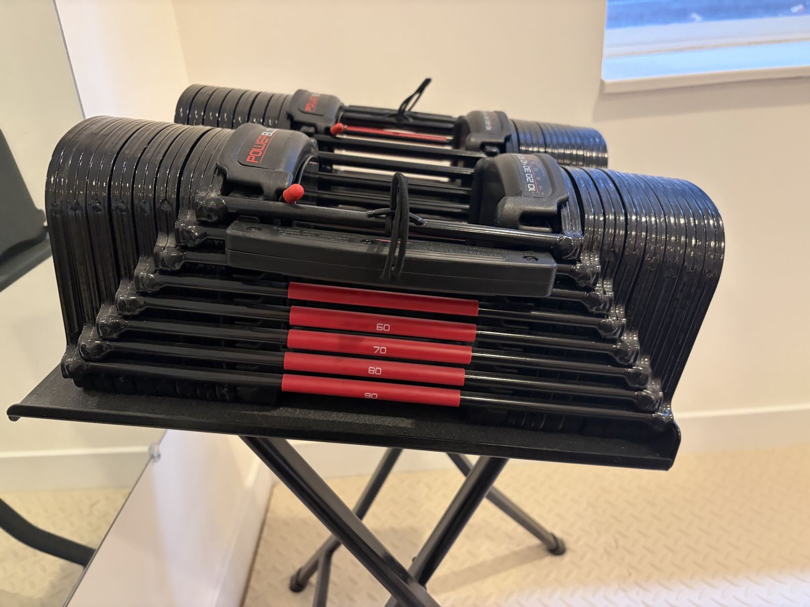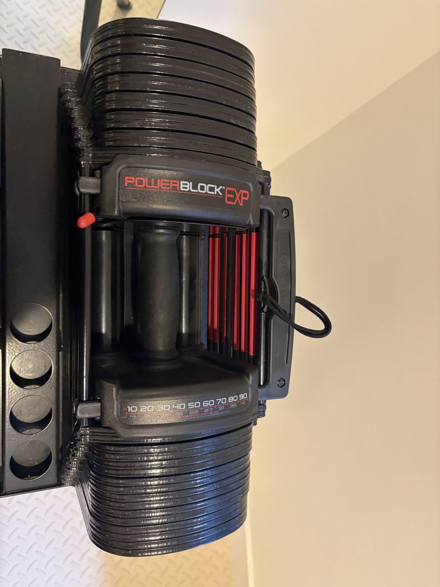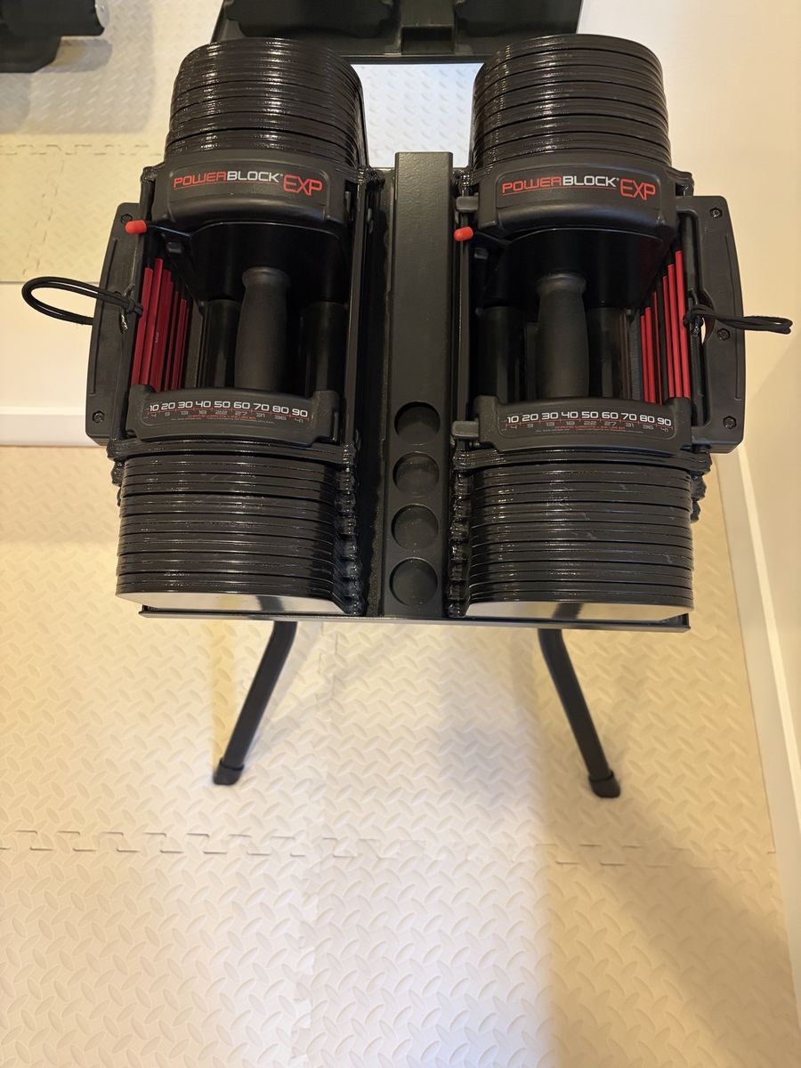 Powerblock EXP 90 adjustable dumbbells with compact stand.