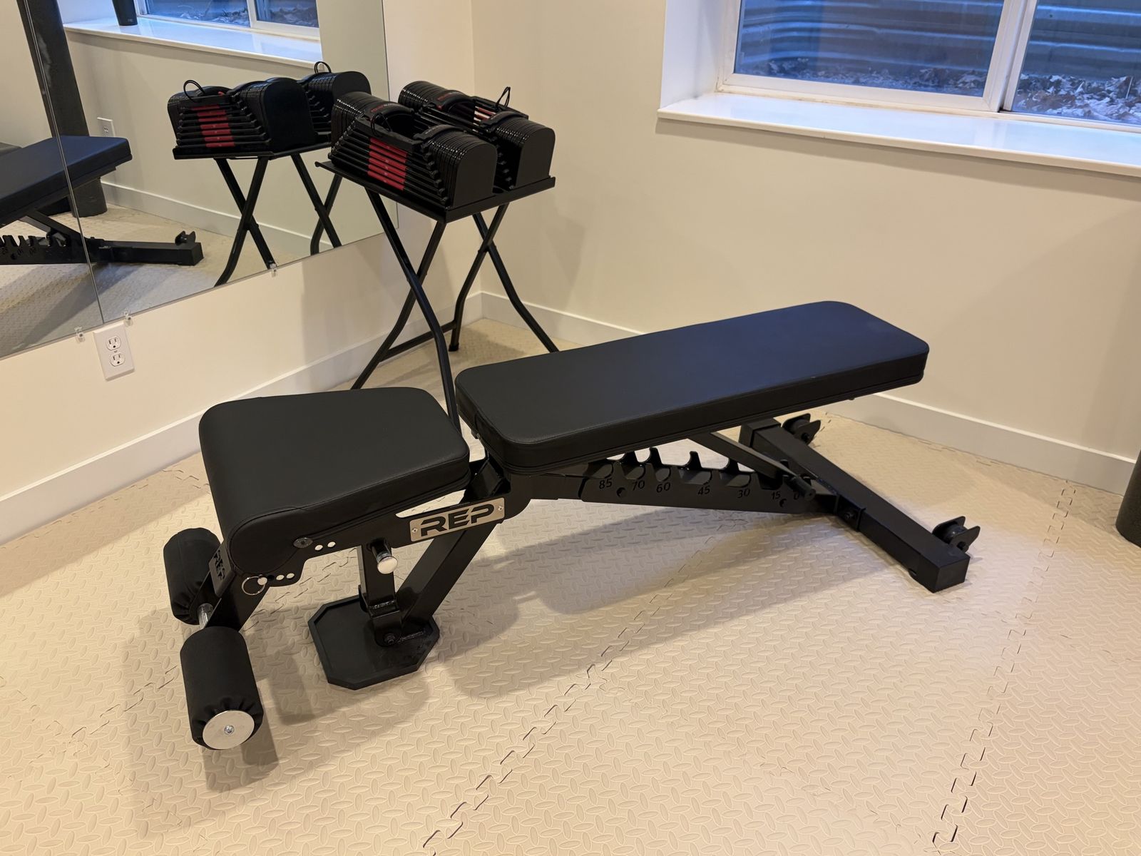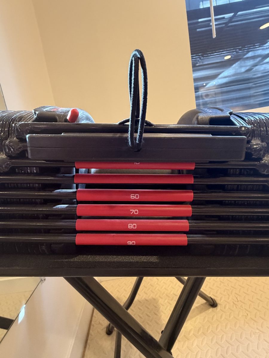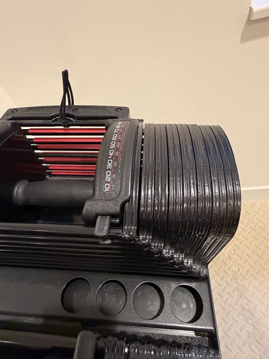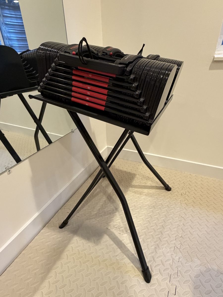 Powerblock EXP 90 adjustable dumbbells with compact stand.