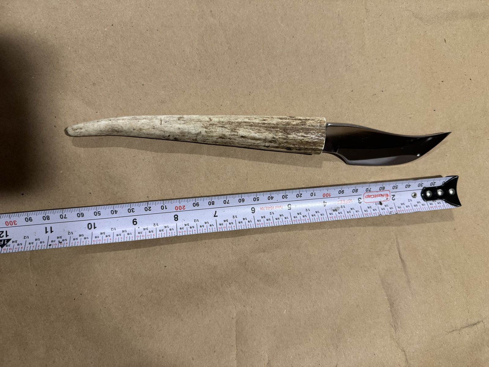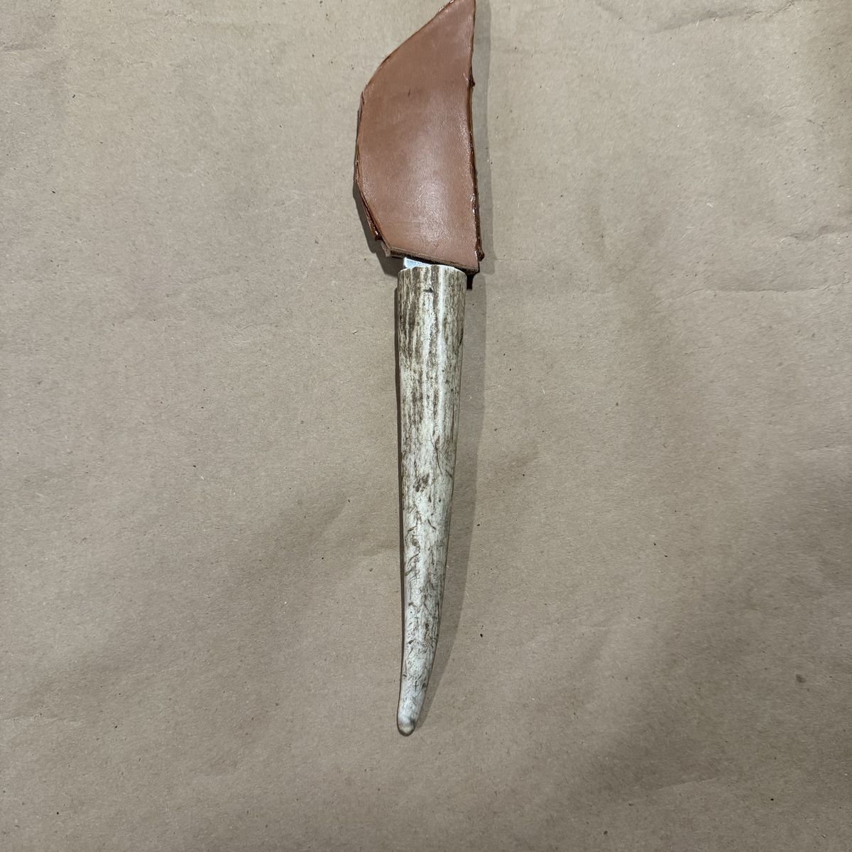 Custom hand made with antler hilt. Has leather cover. Size is 10.5"in with a 4"in blade.