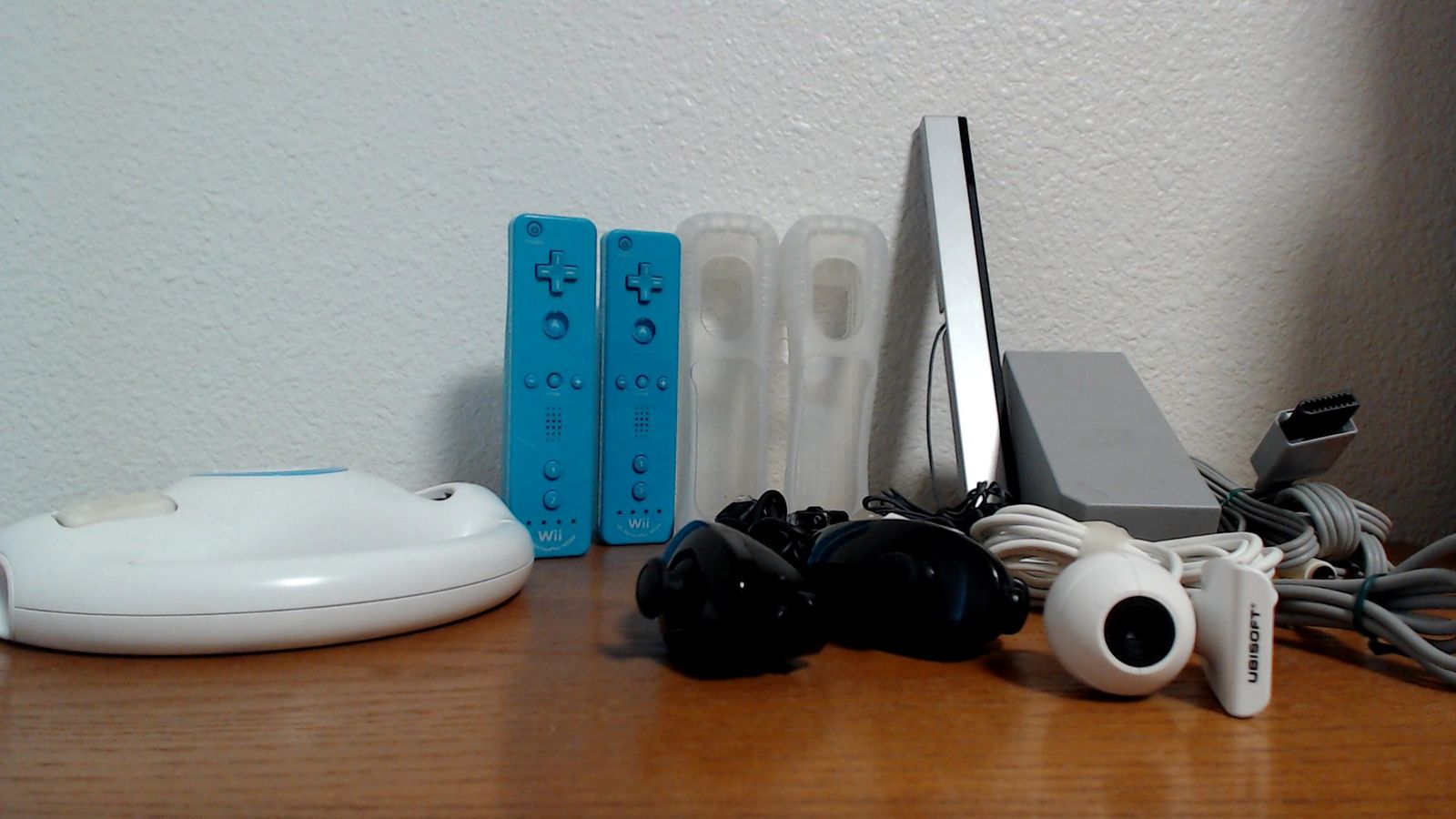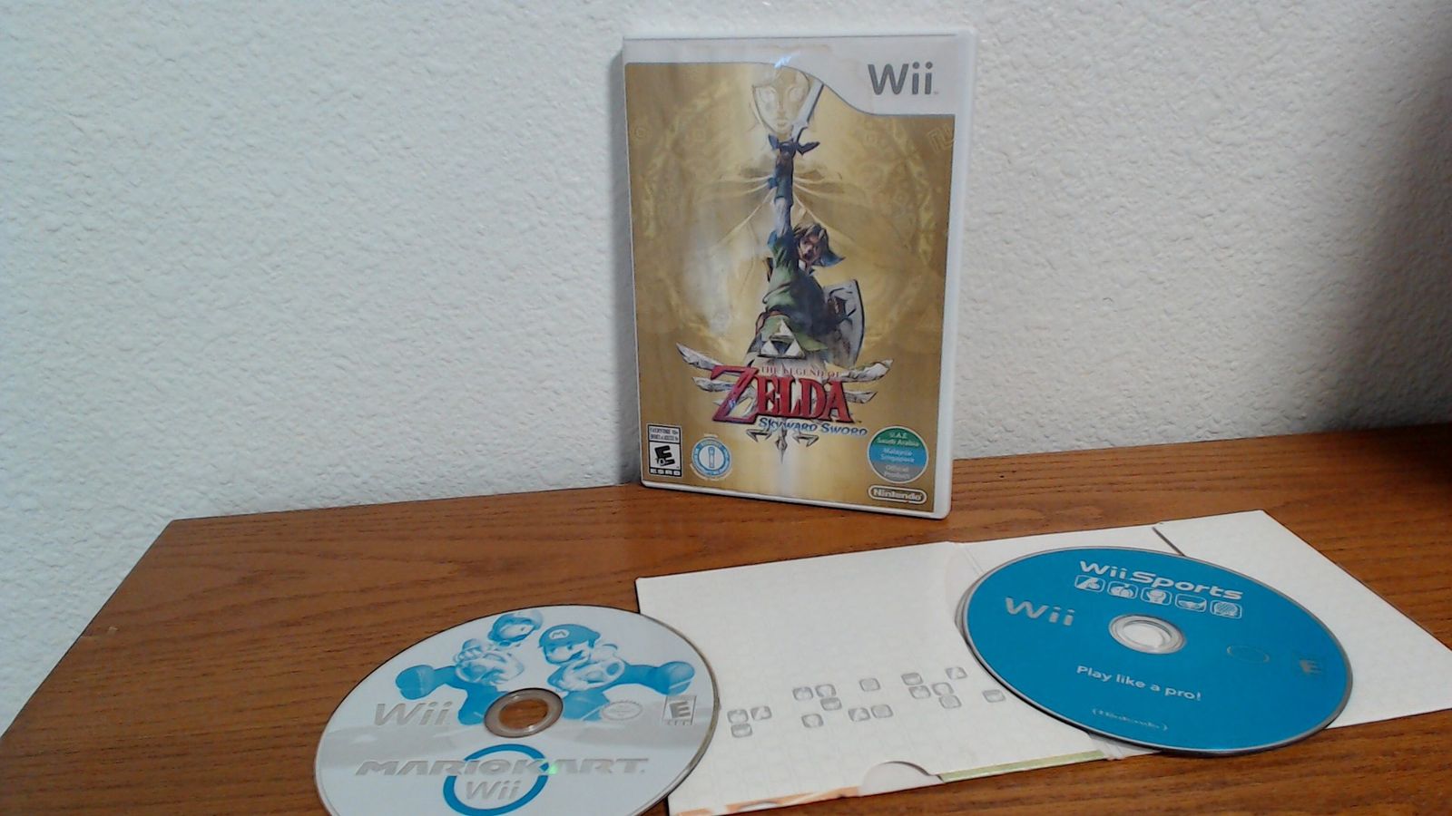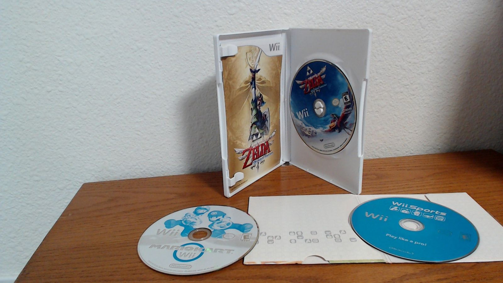 Nintendo Wii Console RVL-001 used in good working condition.Console comes with:Two Wii Controllers Motion Plus Inside,Two Nunchuks,Wii Racing Wheel,Power Adapter,A/V Cable,Sensor Bar,Ubisoft Wii Camera,Zelda with Sheikas Slate-New,Two Silicone Skin for Controllers and 3 used Wii games:Wii Sports no Manual,The Legend of Zelda Skyward Sword complete and Mario Kart game only.Testing available before purchase.